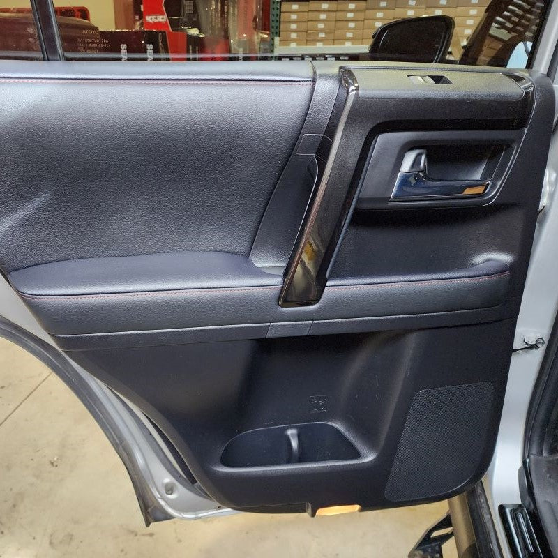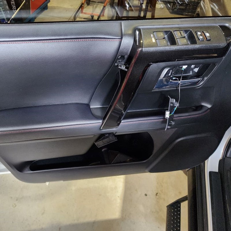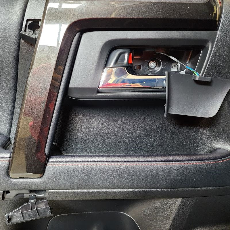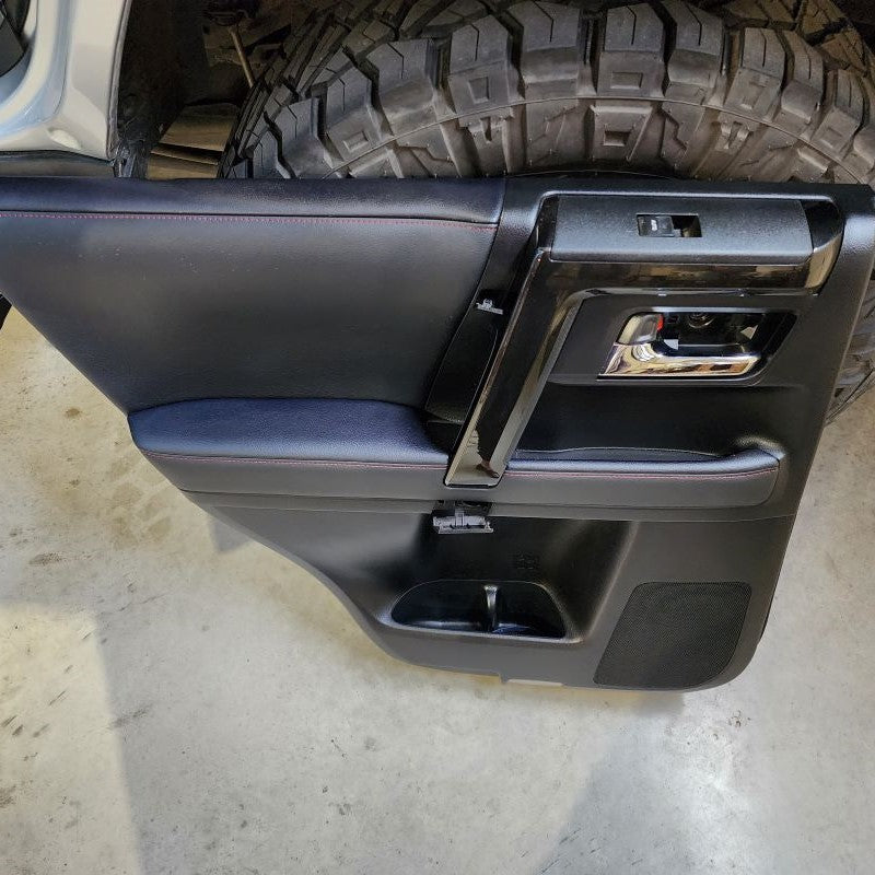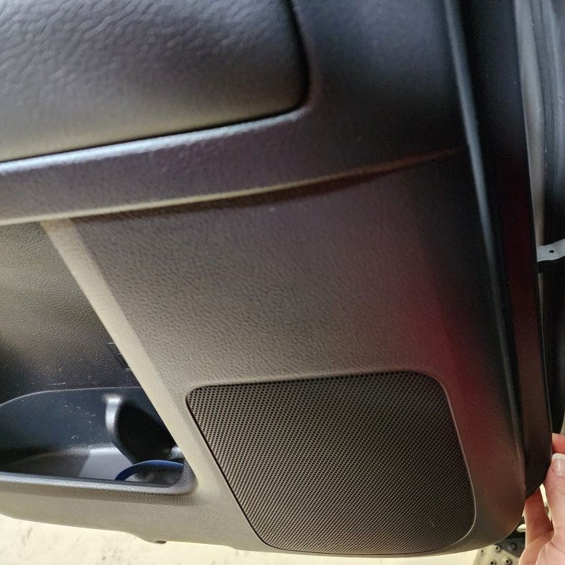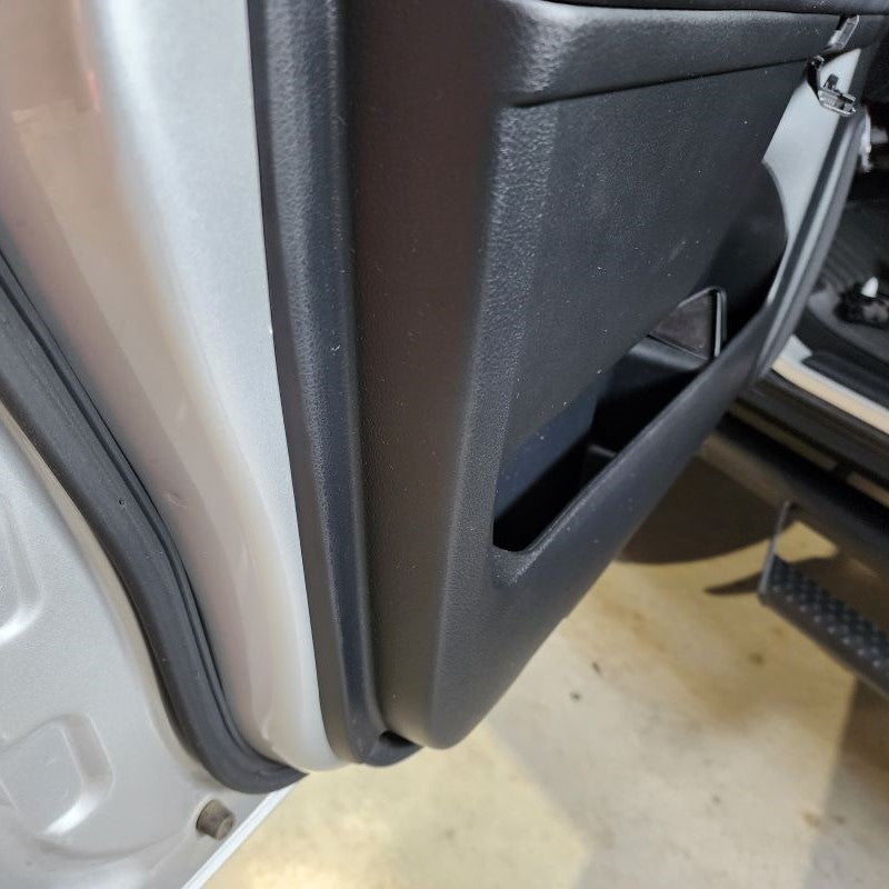 Next, move to your rear passenger door behind the driver seat. You will want to follow similiar steps as above to do the same thing to this door. Start by using the trim removal tool to reveal the three screws that are hidden behind the two door panel pieces and the factory hole cover. Using a phillips screw driver, remove the three screws and set them aside for re-installation.