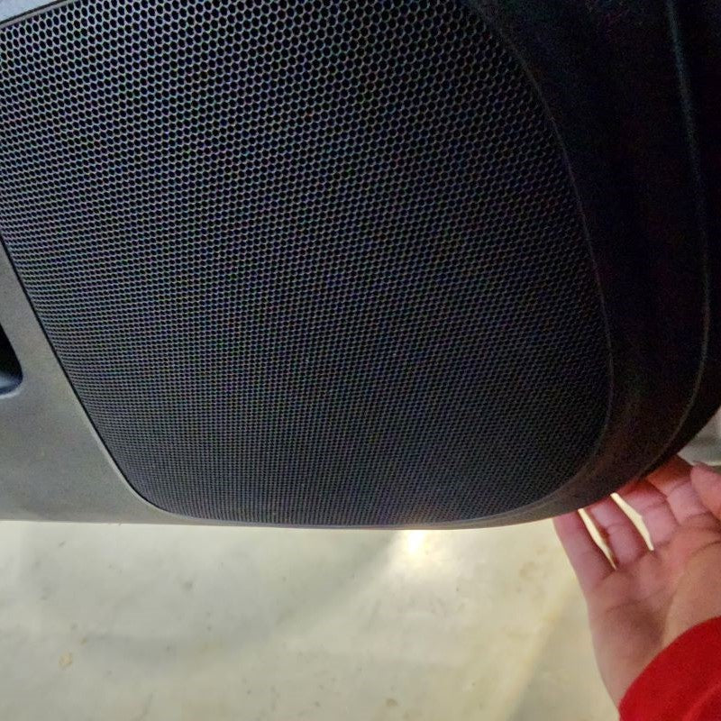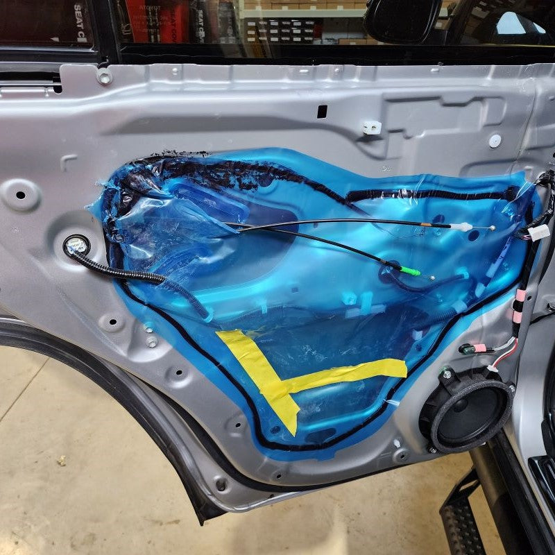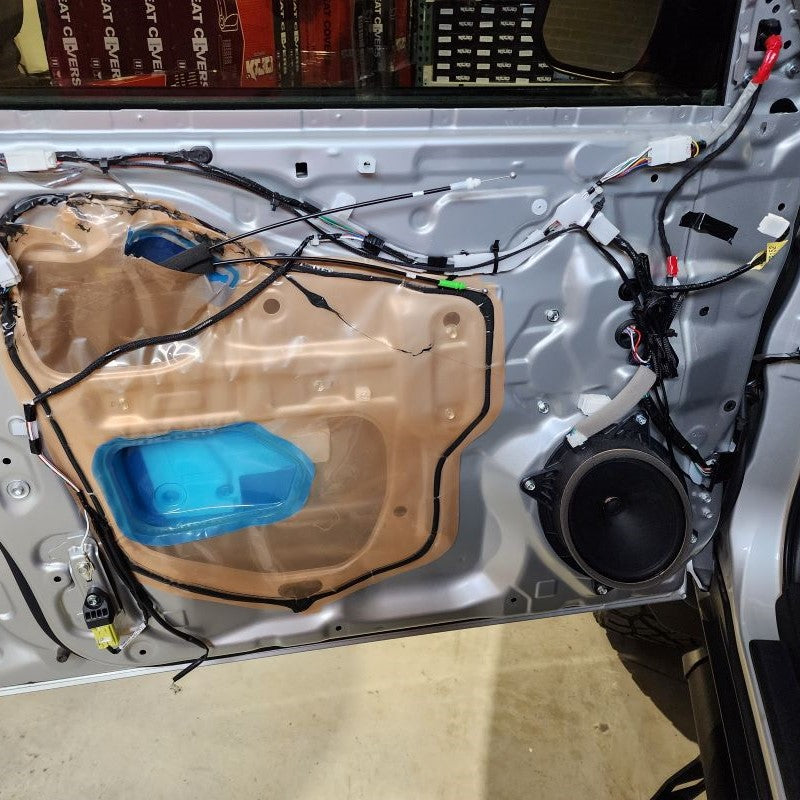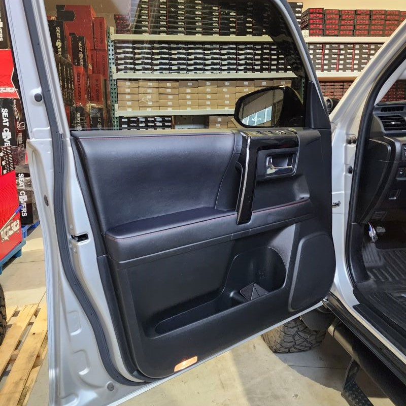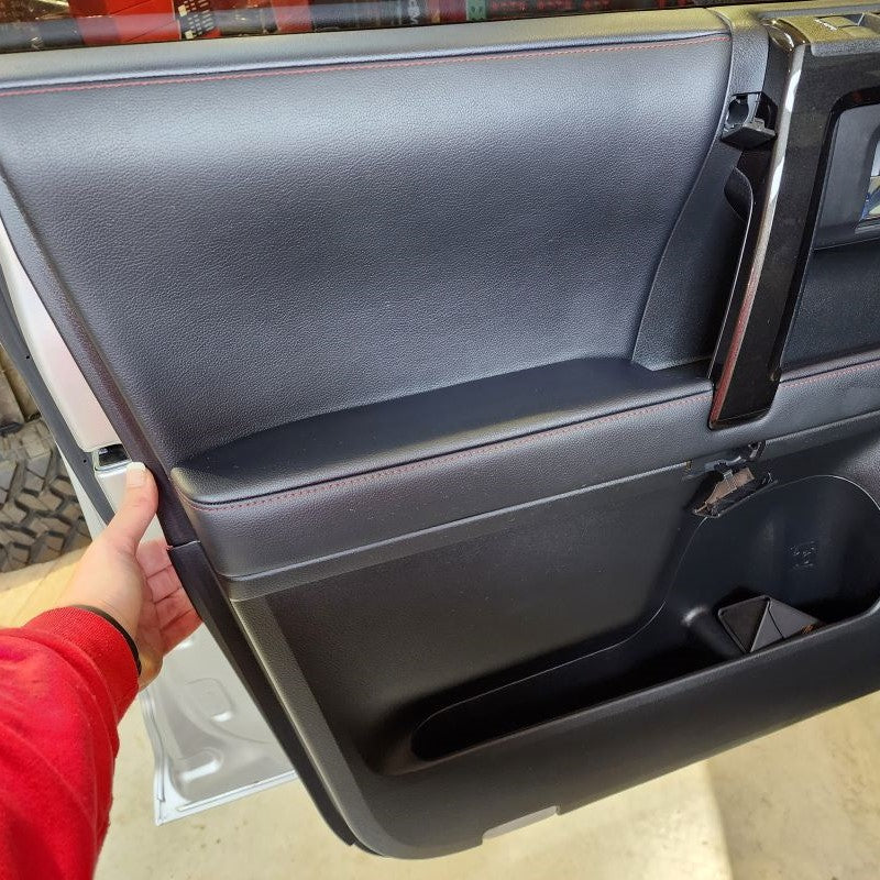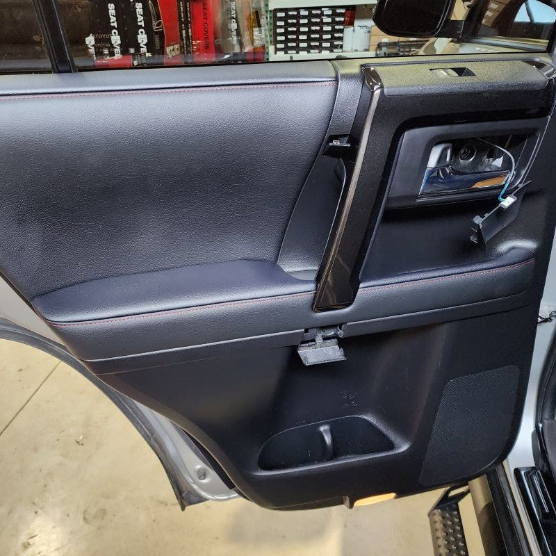 Next, move to your rear passenger door behind the driver seat. You will want to follow similiar steps as above to do the same thing to this door. Start by using the trim removal tool to reveal the three screws that are hidden behind the two door panel pieces and the factory hole cover. Using a phillips screw driver, remove the three screws and set them aside for re-installation.