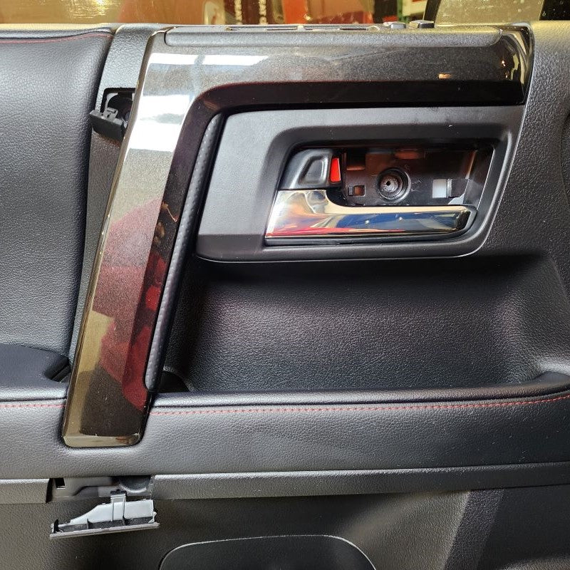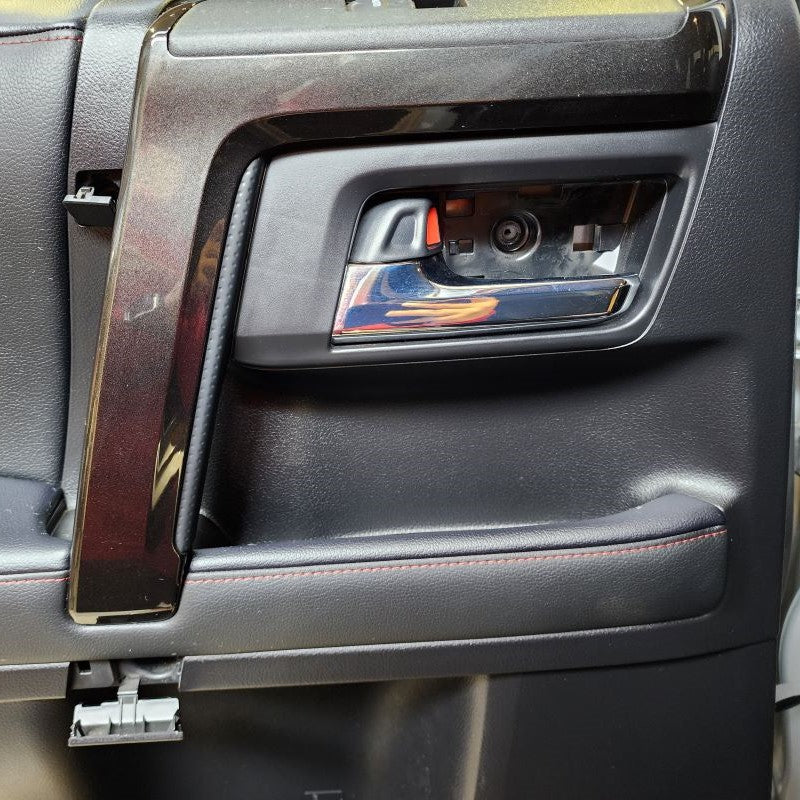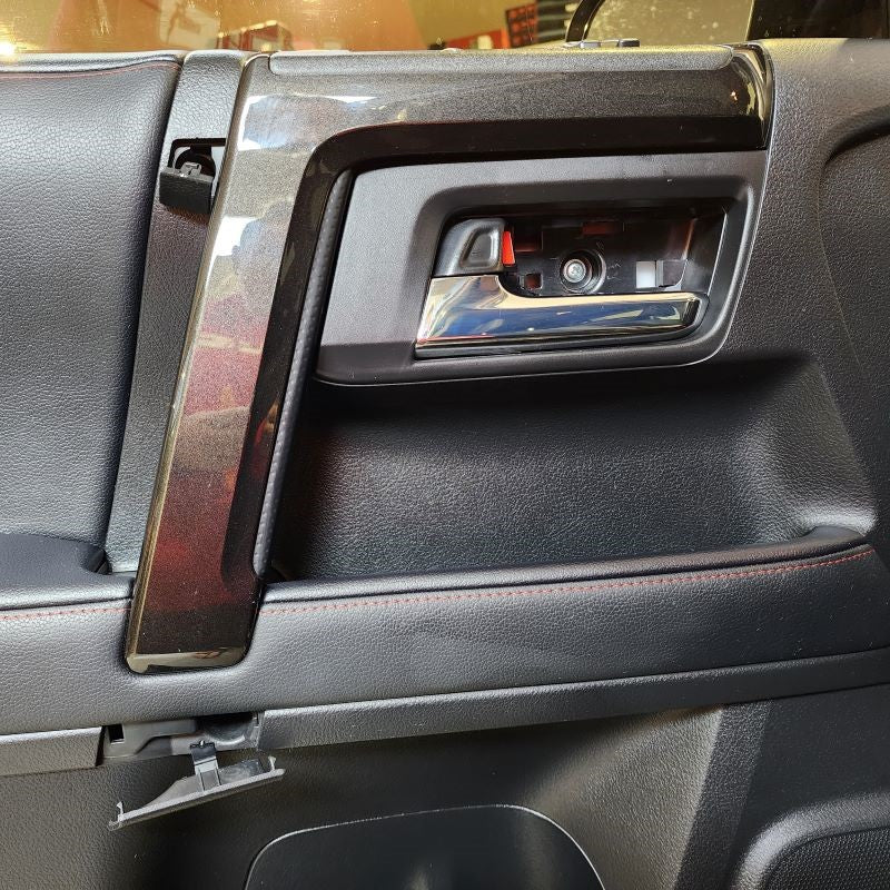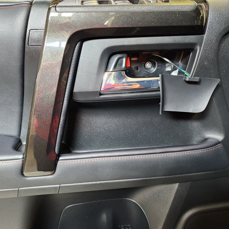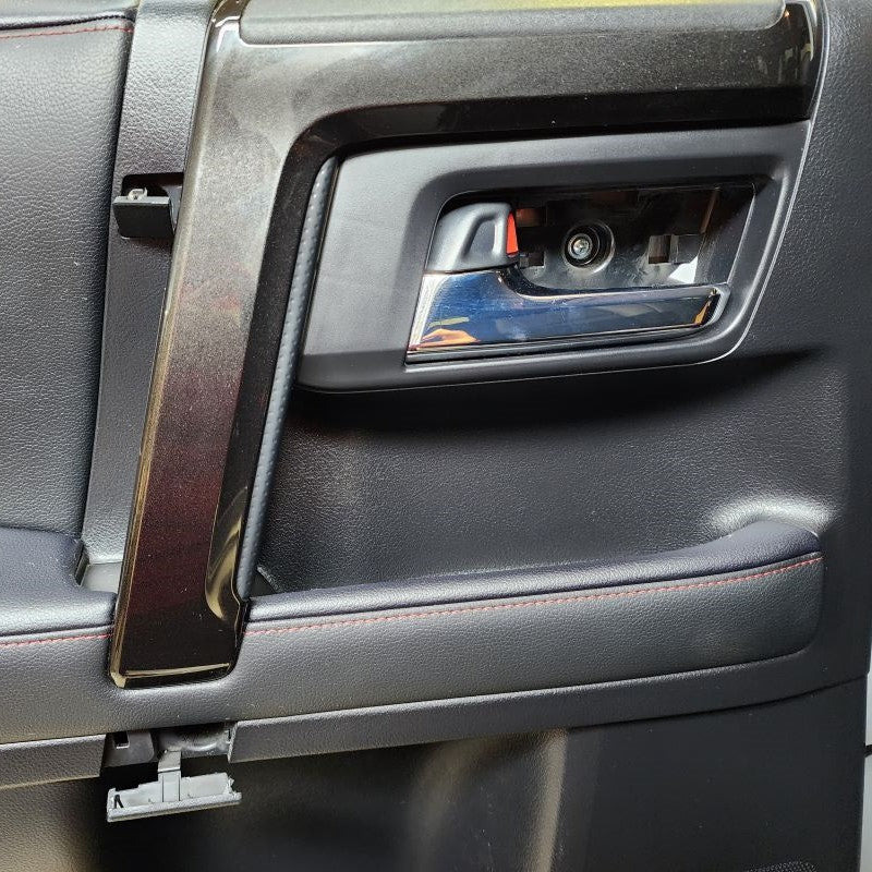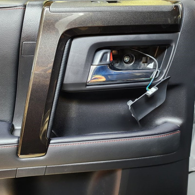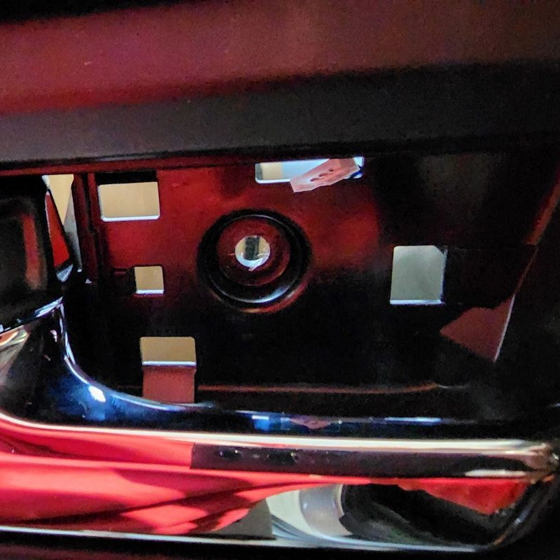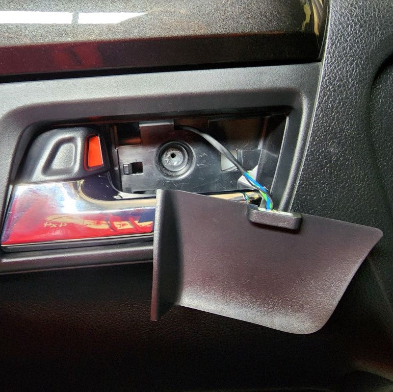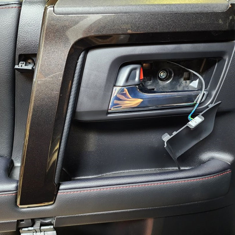 After tidying up the wires, make sure the door panel is pushed back into place against the door frame, then reinstall the three phillip screws to anchor the panel to the frame. Once the hardware is nice and tight, go ahead and push the two panel pieces back into place to cover the holes. Last, install your new Door Bowl Light Hole Cover. You may need to push your wire harness in the backside of the door panel a little more, but it shouldn't be a problem doing so at this point. Start by inserting the back tabs that are towards the cab of the vehicle first and then the back tabs that are towards the red lock indicator on the door handle last.
