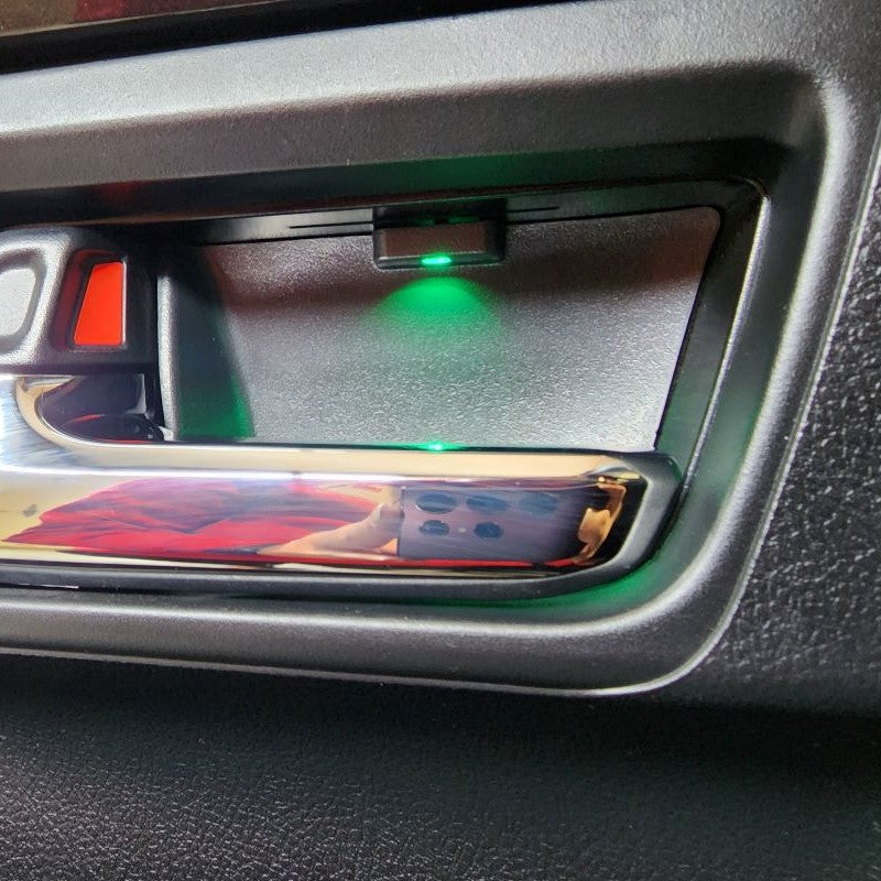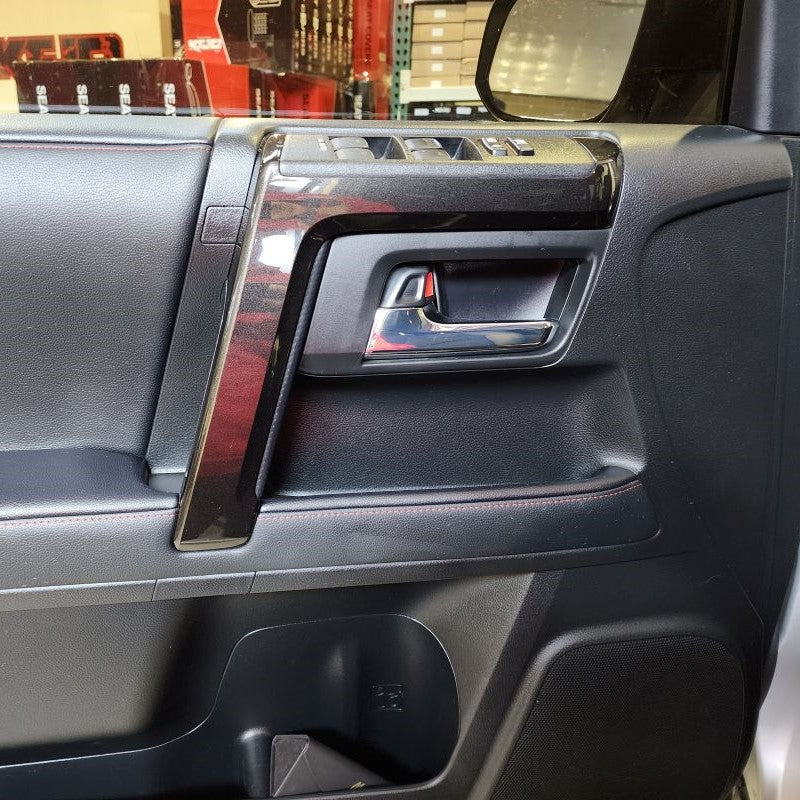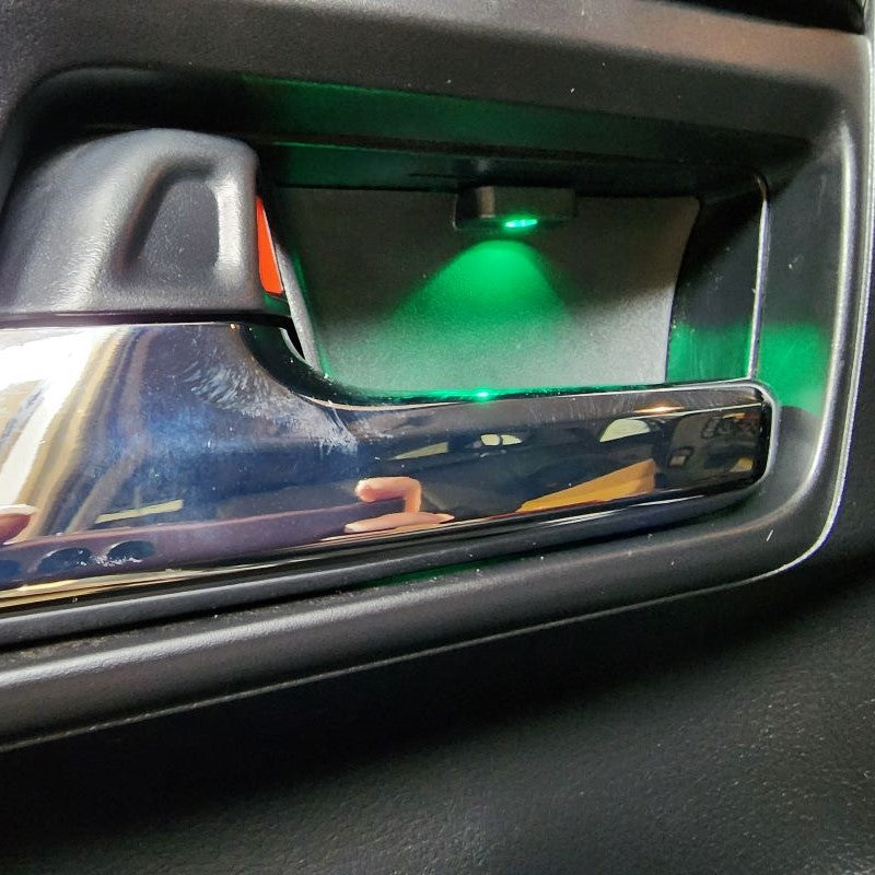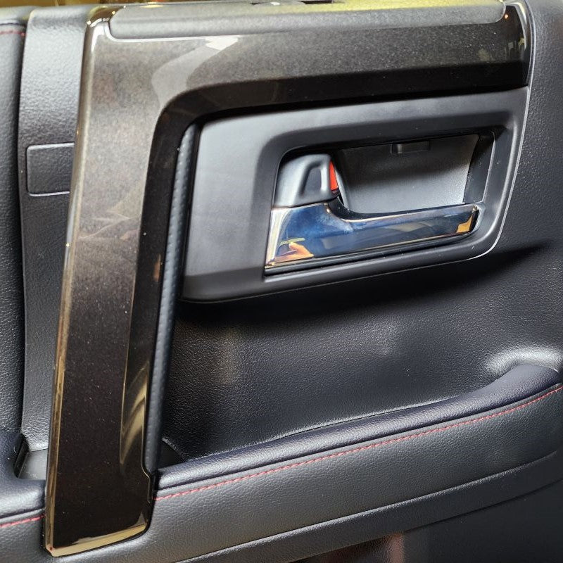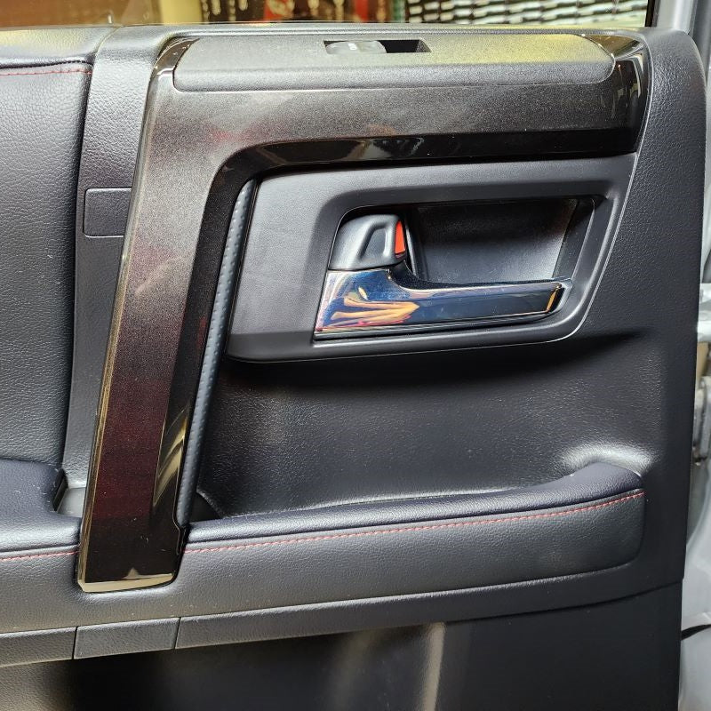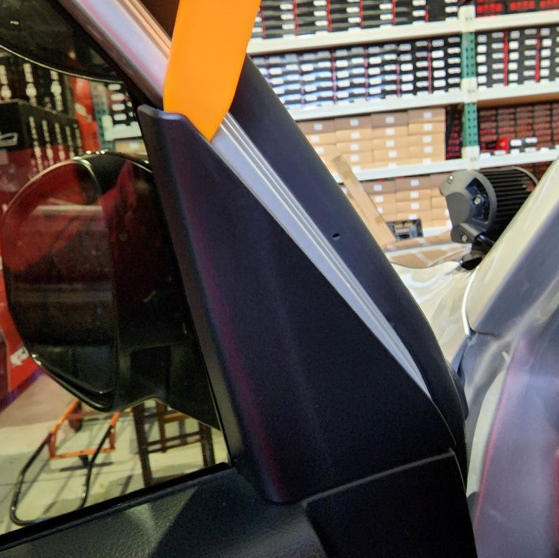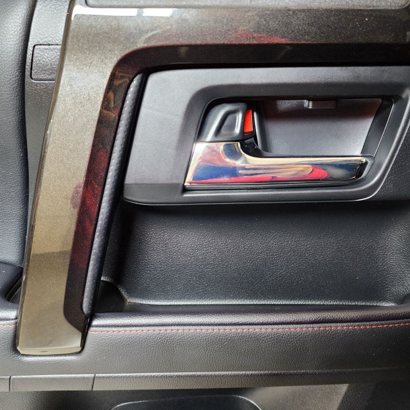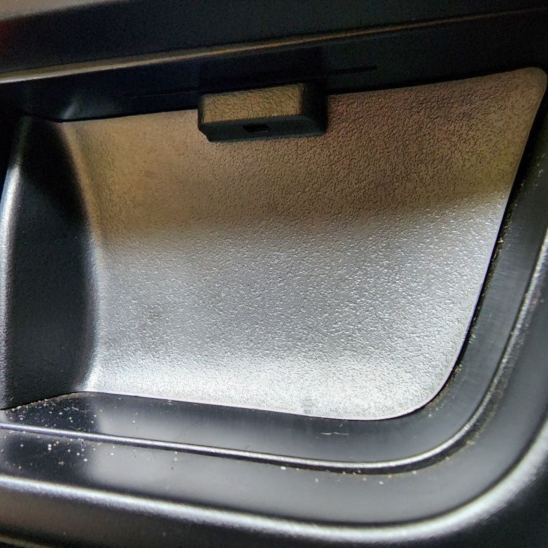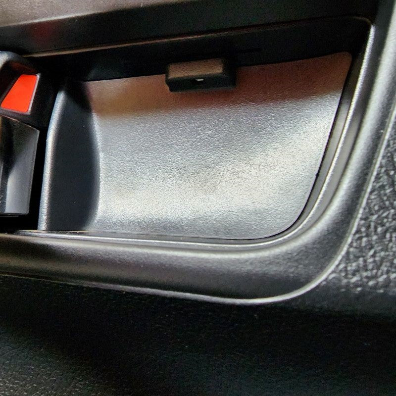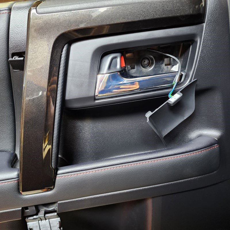 After tidying up the wires, make sure the door panel is pushed back into place against the door frame, then reinstall the three phillip screws to anchor the panel to the frame. Once the hardware is nice and tight, go ahead and push the two panel pieces back into place to cover the holes. Last, install your new Door Bowl Light Hole Cover. You may need to push your wire harness in the backside of the door panel a little more, but it shouldn't be a problem doing so at this point. Start by inserting the back tabs that are towards the cab of the vehicle first and then the back tabs that are towards the red lock indicator on the door handle last.
