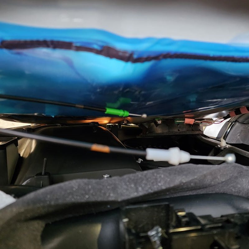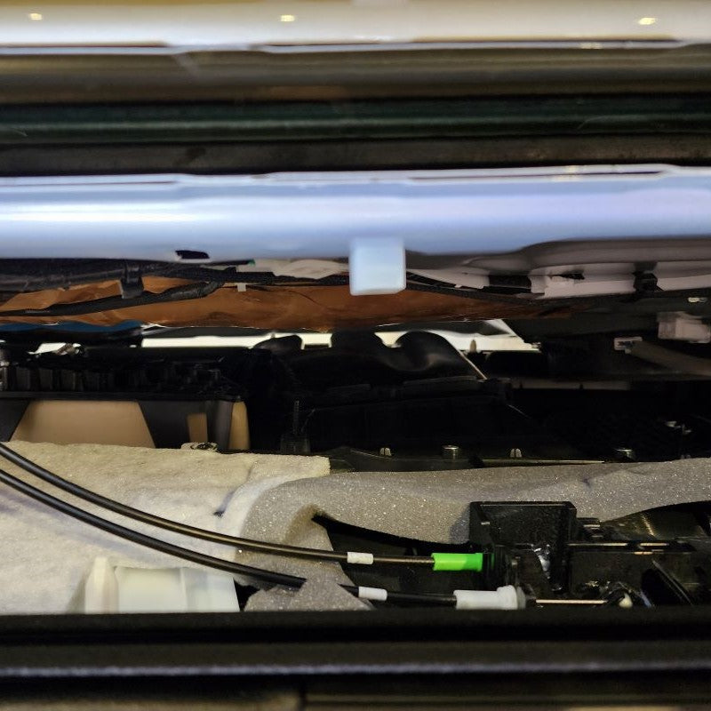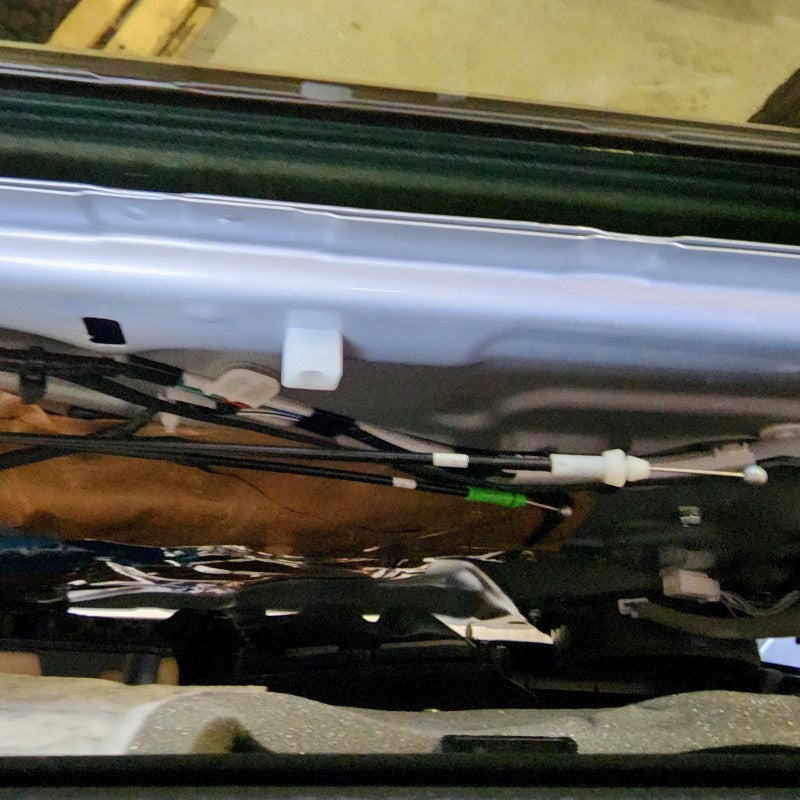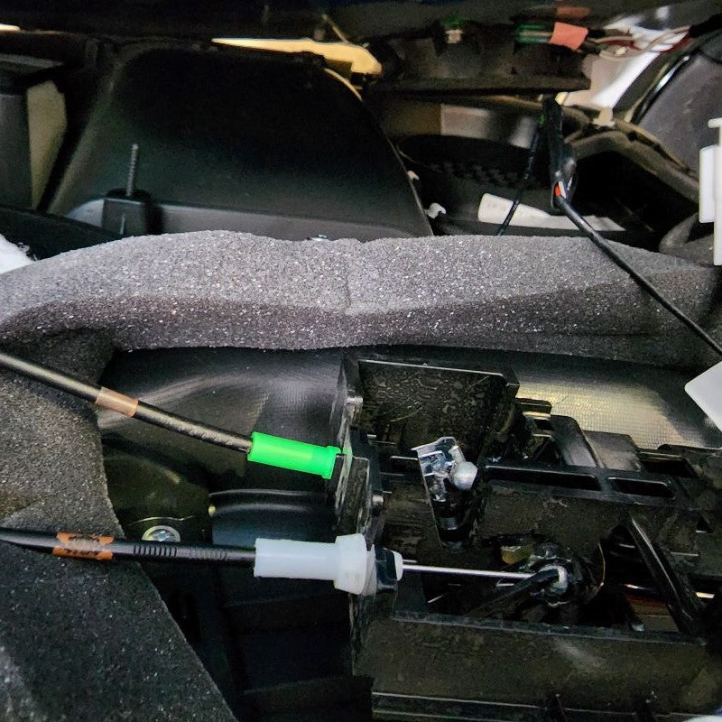 If you look behind the door panel you just pulled off, you’ll see one white and one green Bowden Cable termination. Carefully snap these out of the black housing and maneuver the steel cable ends out of their enclosures just like you did before in Step 2.