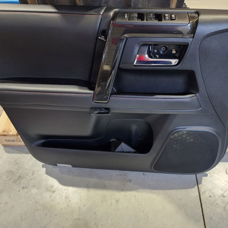 Using your handy trim removal tool, begin in the lower right corner and start separating the door panel from the door frame. Slowly work your way around the bottom and sides, popping off each successive snap until you’re left with the door panel hanging by the top lip.