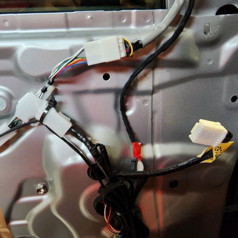 With now having the door frame exposed, we can easily find the window switch connector – just follow the factory wire harness that goes along the frame of the door and routes up to the white connector at the top right side of the door. In the pictures below, you see it is the one that has a pink factory label wrapped around the wire harness. Depending on your vehicle, that may be different.