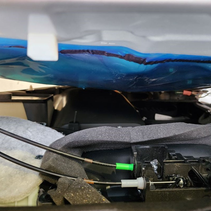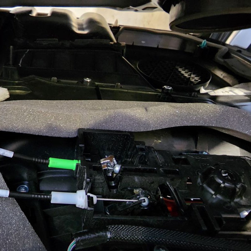If you look behind the door panel you just pulled off, you’ll see one white and one green Bowden Cable termination. Carefully snap these out of the black housing and maneuver the steel cable ends out of their enclosures.