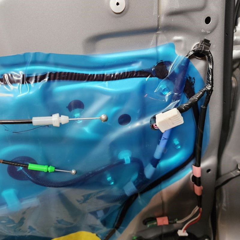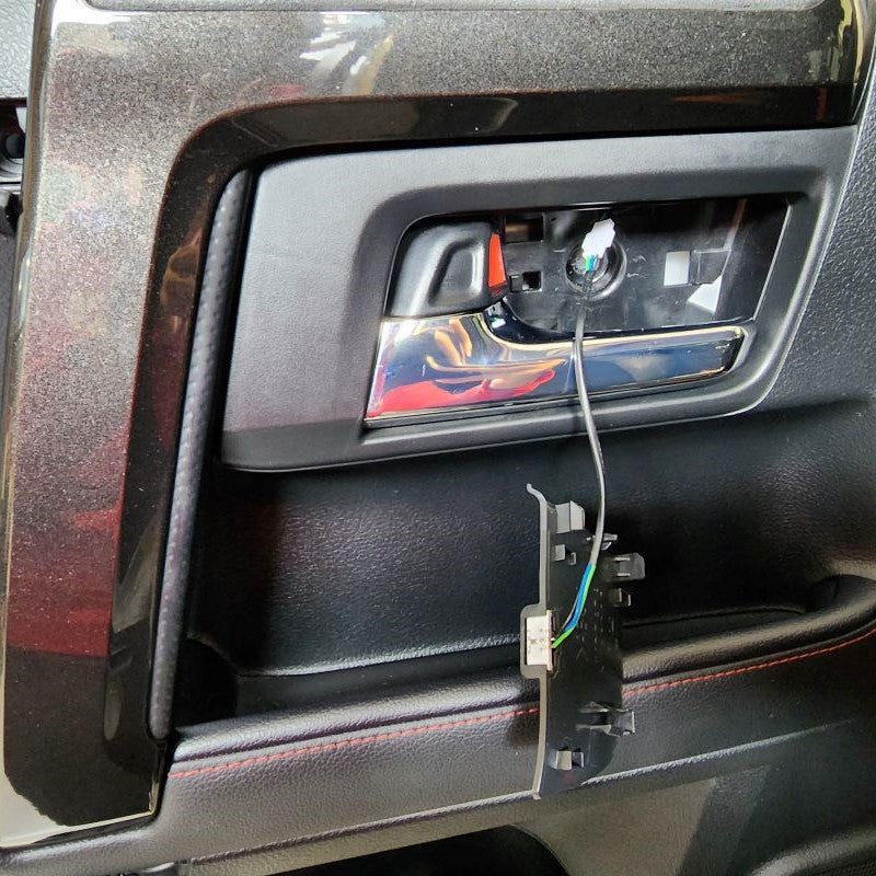 In order to connect the wire harness for the door bowl light, there are some narrow openings that the cable and connectors will need to travel through. The only way this can be accomplished is by doing it prior to reinstalling the door panel back on the frame of the vehicle.