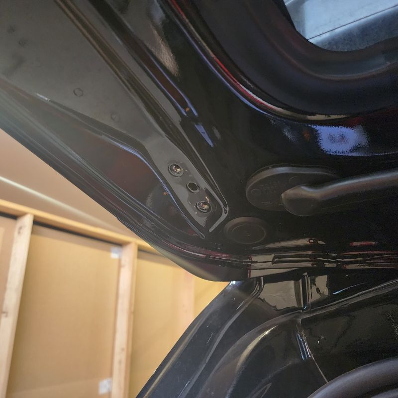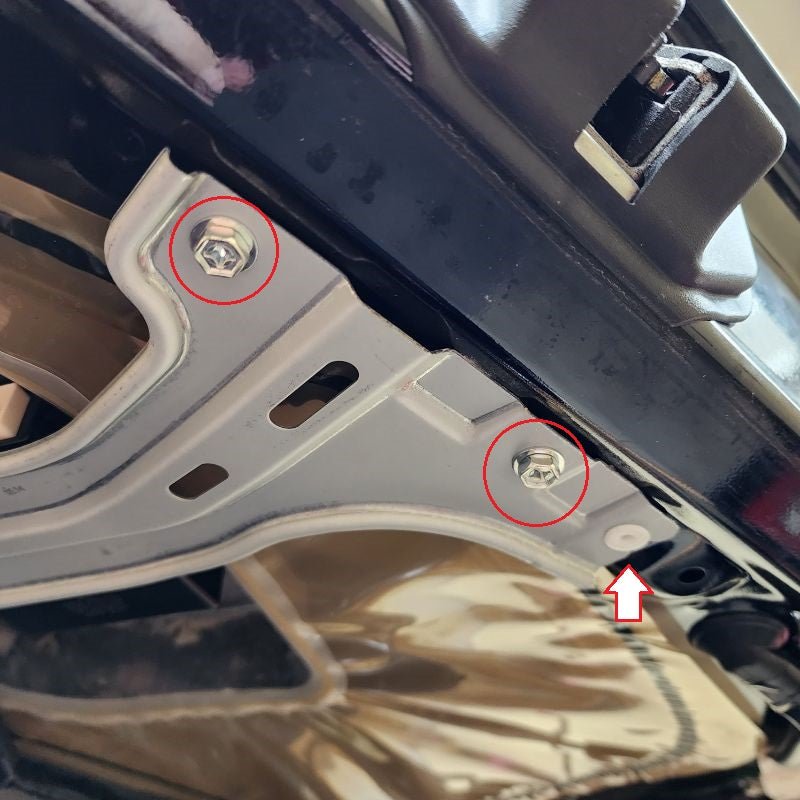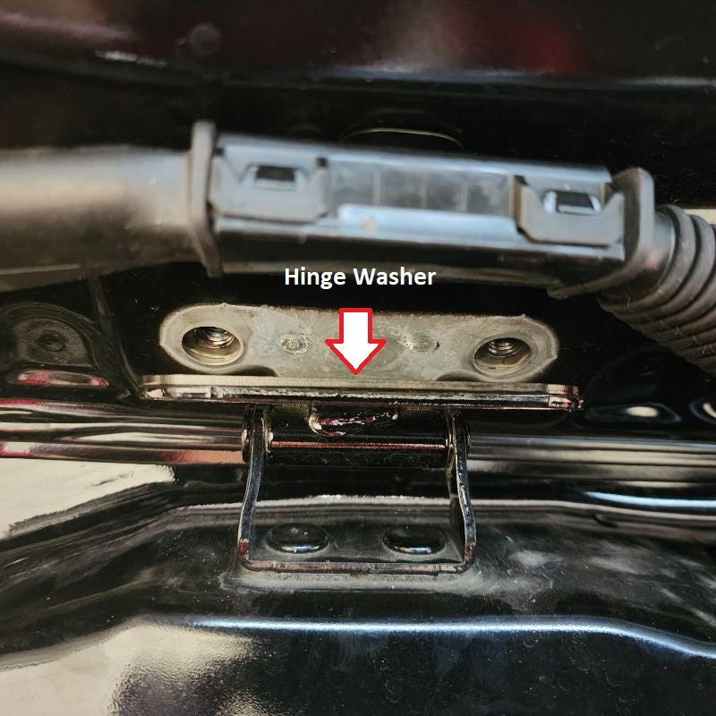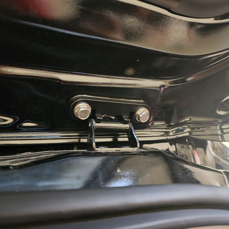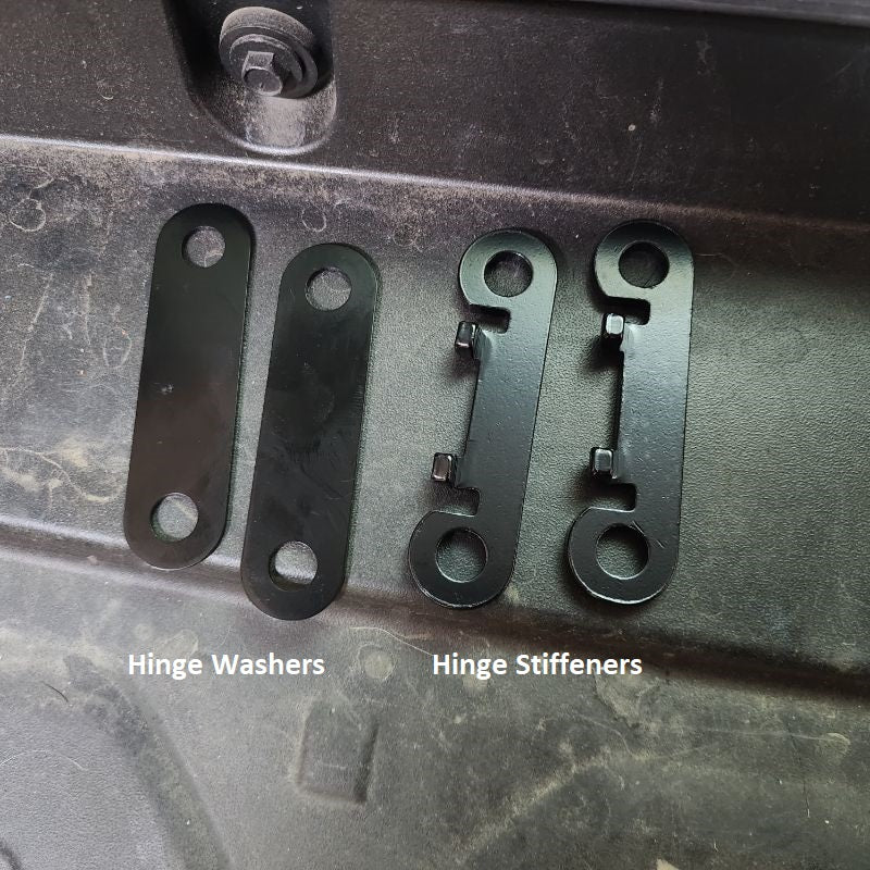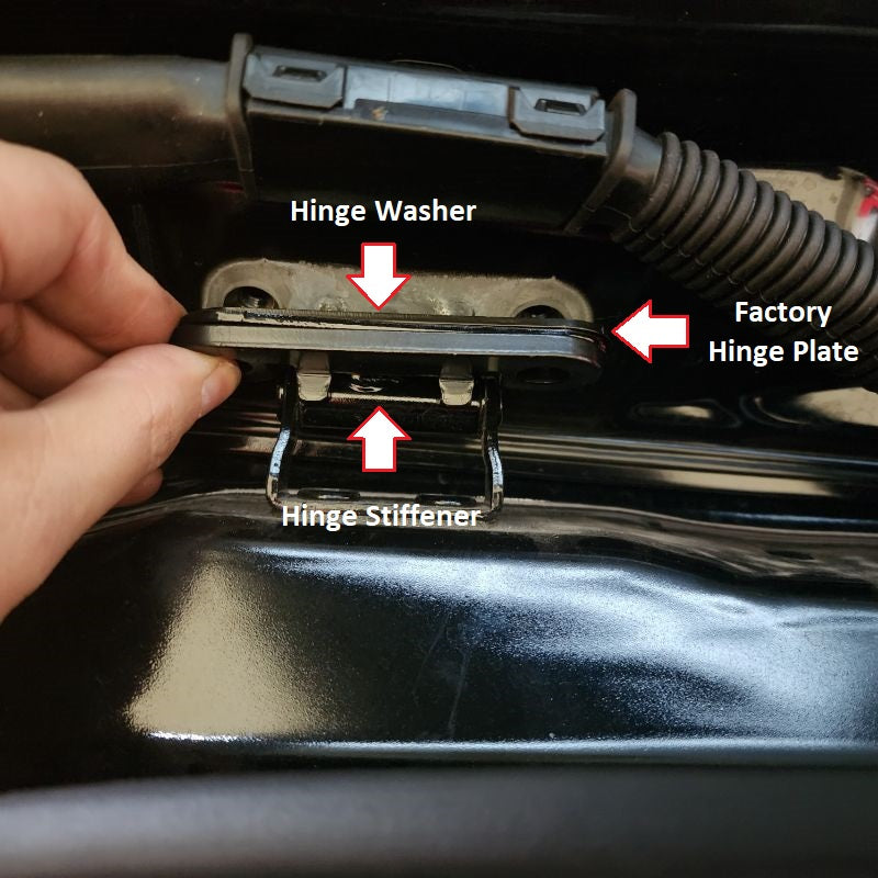 Use the hinge washer & stiffener to reinforce the factory door hinge. This step requires assistance to hold the door panel in place. Remove the two screws and then you will have to pry the factory hinge plate loose. Place the new hinge washer between the door panel and hinge plate. Next, place the new hinge stiffener outside the hinge plate. For reinstalling the hardware, you can use the new M8 bolts or reinstall your black factory hardware. It is personal preference as some do not like the silver and would like to keep the black look.