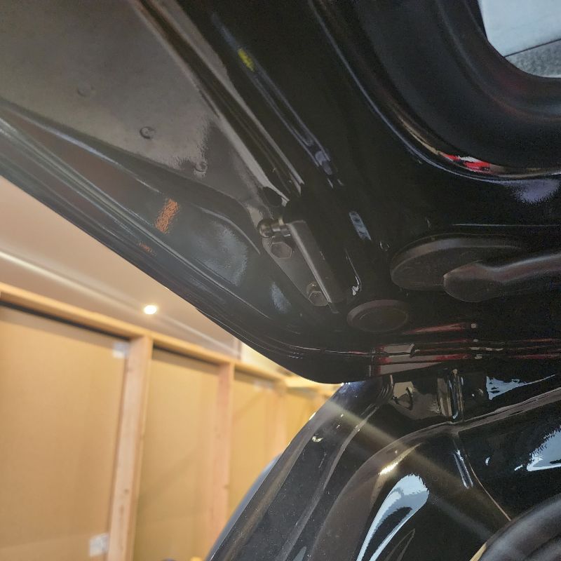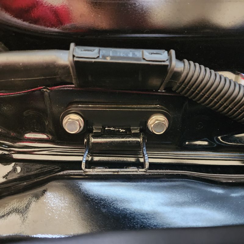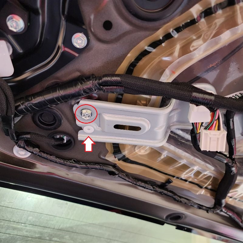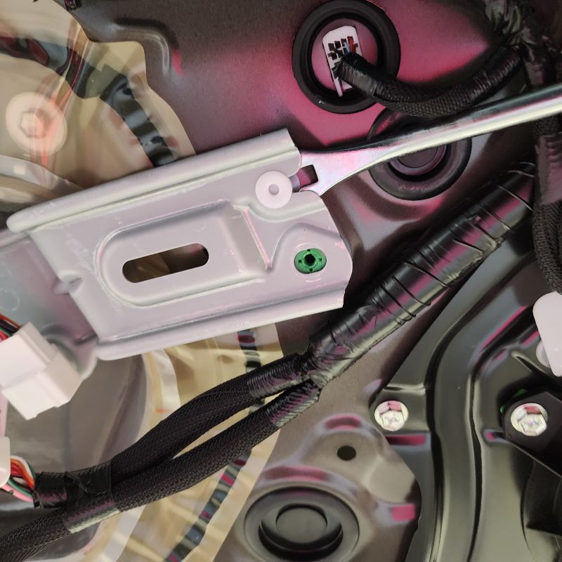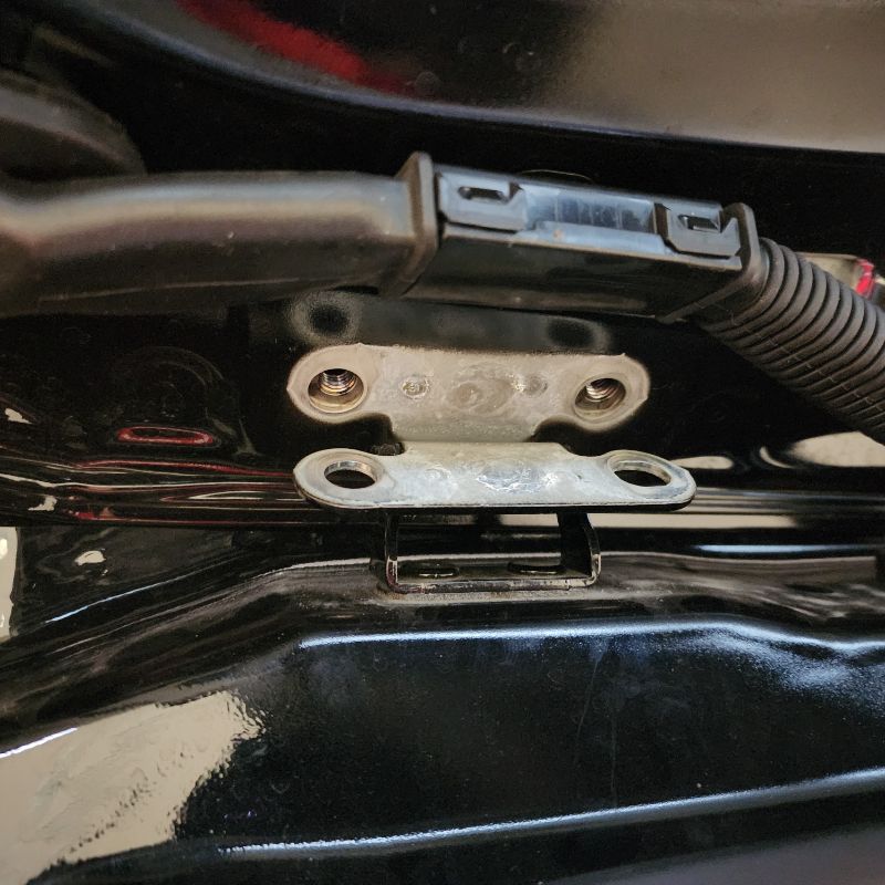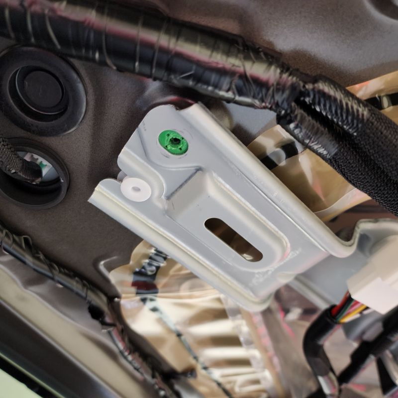 Use the hinge washer & stiffener to reinforce the factory door hinge. This step requires assistance to hold the door panel in place. Remove the two screws and then you will have to pry the factory hinge plate loose. Place the new hinge washer between the door panel and hinge plate. Next, place the new hinge stiffener outside the hinge plate. For reinstalling the hardware, you can use the new M8 bolts or reinstall your black factory hardware. It is personal preference as some do not like the silver and would like to keep the black look.