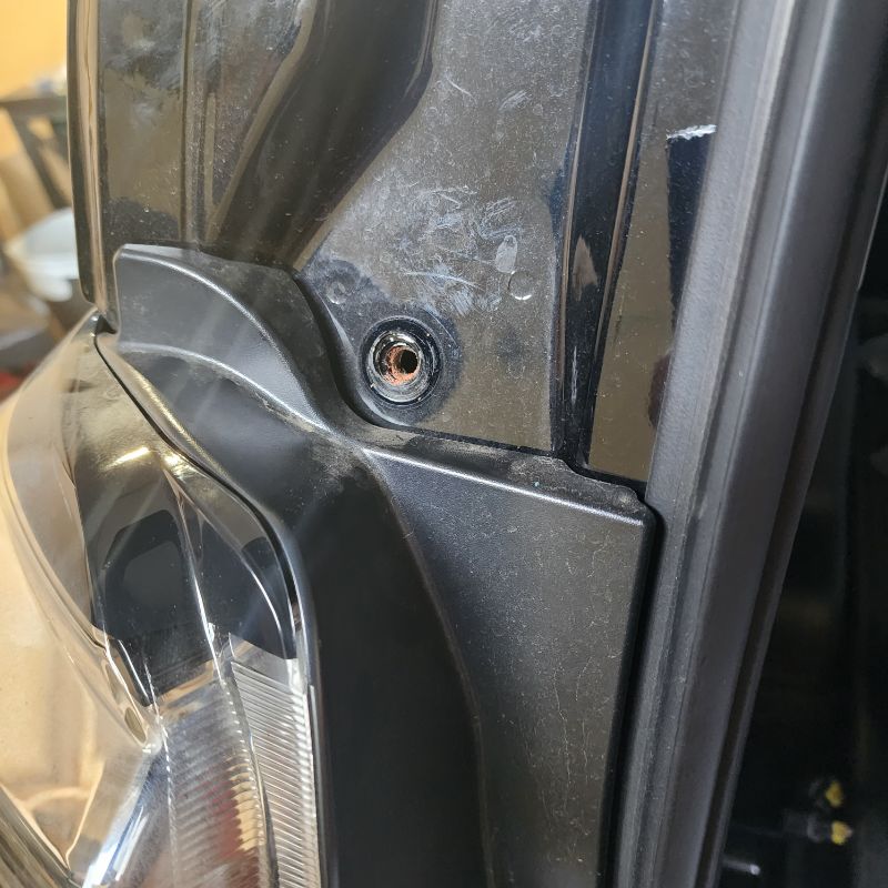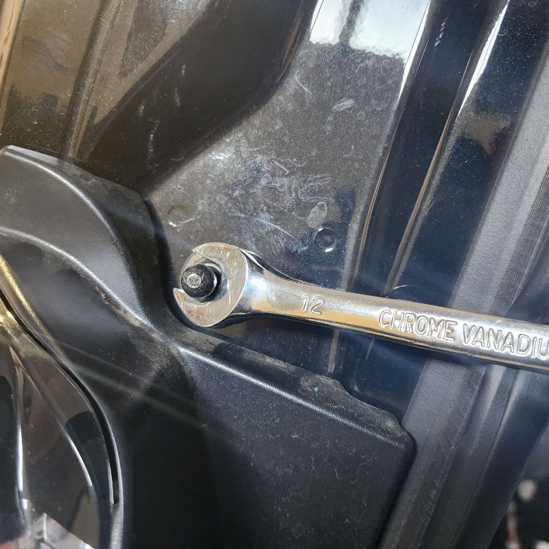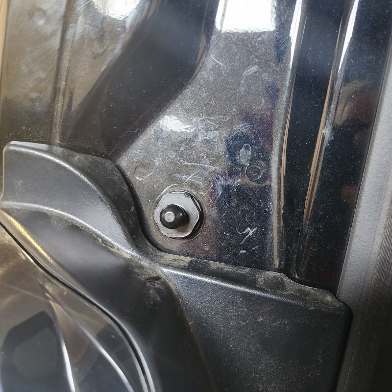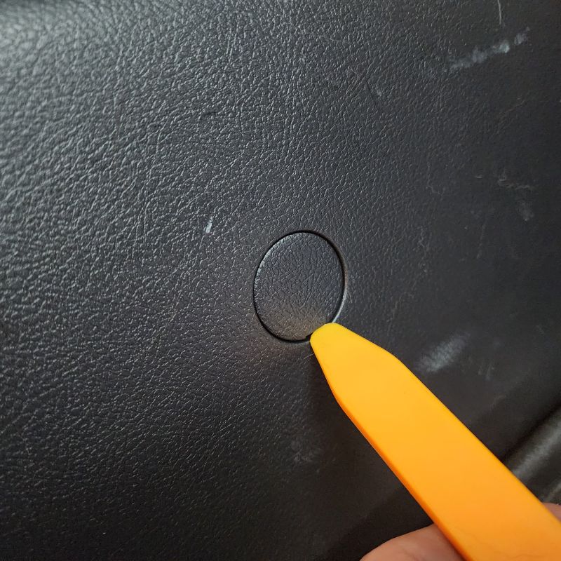 Next there are two circular panel covers located on the right side of the trim panel. One is at the top right and the second one is in the middle of the wheel well. Use a small screwdriver or trim removal tool to pop-up the panel covers. This will reveal two 10mm bolts. You can use a 10mm socket or a phillips head screwdriver (P3 head if you have it). Go ahead and remove both bolts. Make sure to set the hardware and panel covers aside together so you know what goes with what at the end to secure the panel to the frame again.