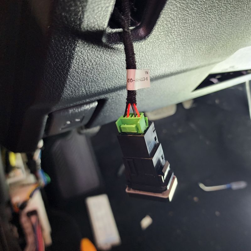 Replace factory button holder (unused button) with New Front Push Button (your choice on which blank to use). Grab the Front Button Harness that was included and connect the green connector to the New Switch, the remaining pigtail harness can be connector to one of your Factory Front Push Buttons for the backlighting power. Find the correct Push Button connector that fits with the New Pigtail Wire Harness.