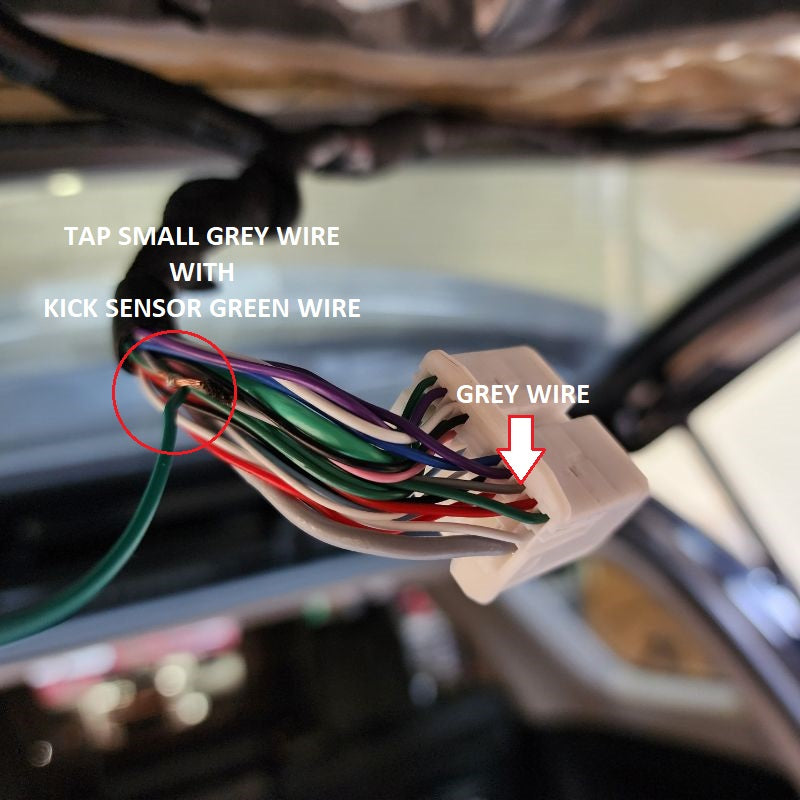 Run Green wire into the Tailgate and connect with small grey wire as shown below. Yellow wire is for 12V+ constant power. You have a couple options here: run to the front and connect under the dash or to the Battery OR you can find the big red wire located in the power plug connected to the control box as shown. The last Red Wire with the Kick Sensor is the ACC wire. This is for the protection feature. When the engine is on, the ACC wire will receive power not allowing the Tailgate to operate. Some customers choose not to use this connection so they can operate their tailgate with their ignition on. Owner's discretion on what you would like to do. Black wire gets grounded.