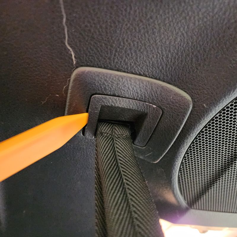 Using a door panel remover, slip it between the headliner and grey push pin retainer. Repeat for all three located in headliner.