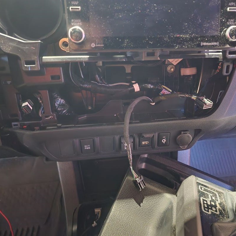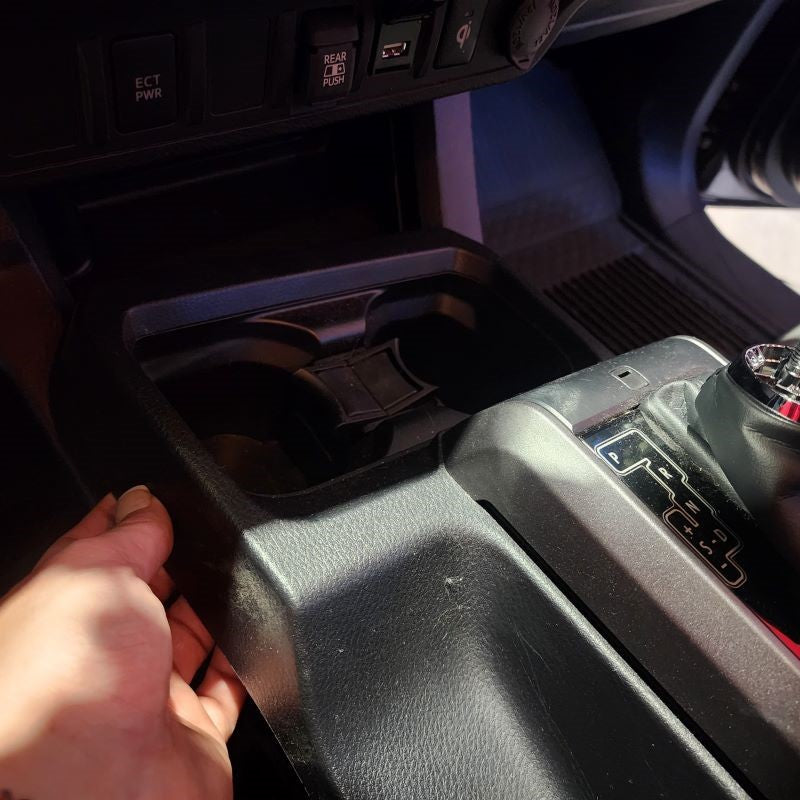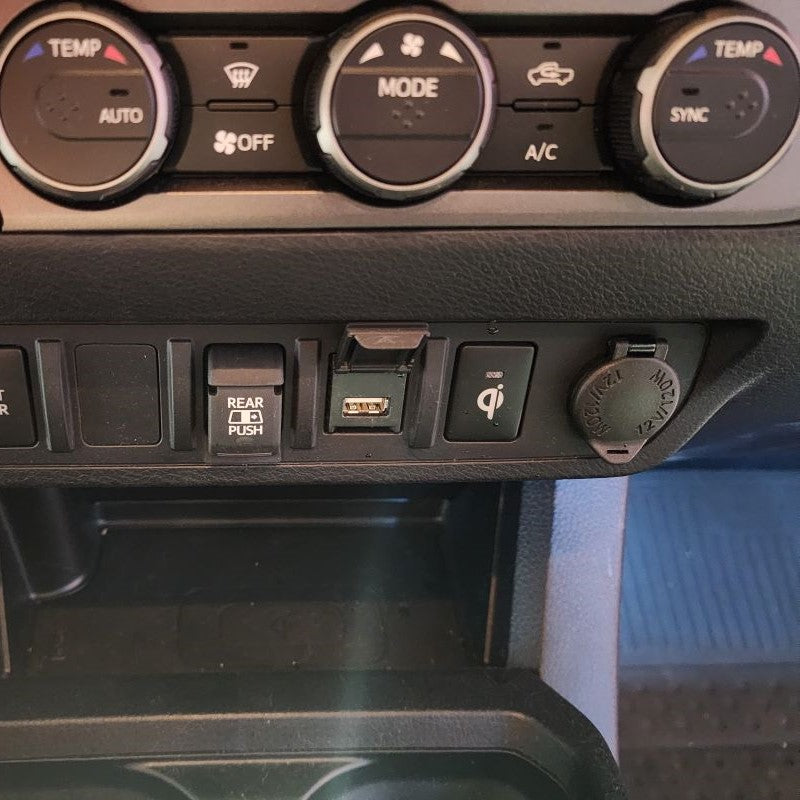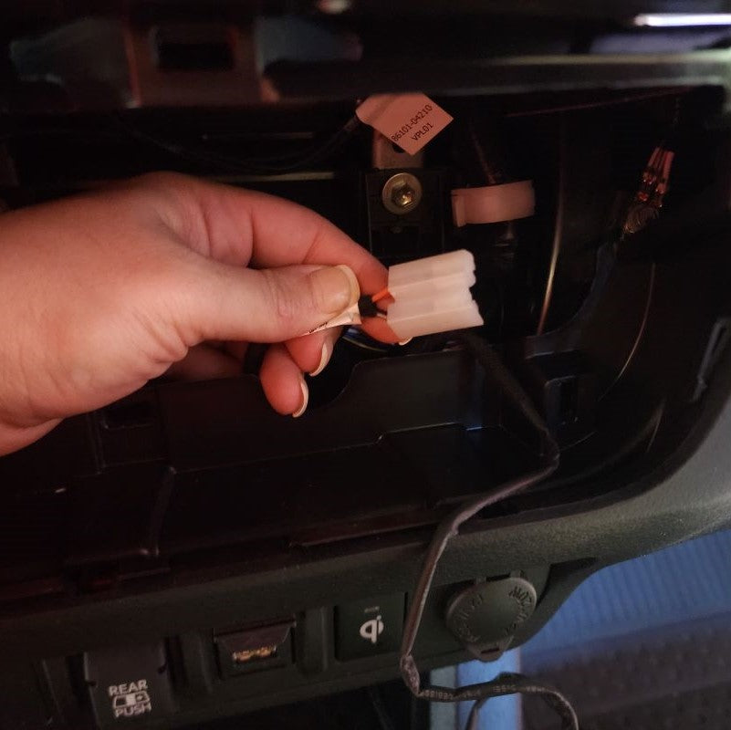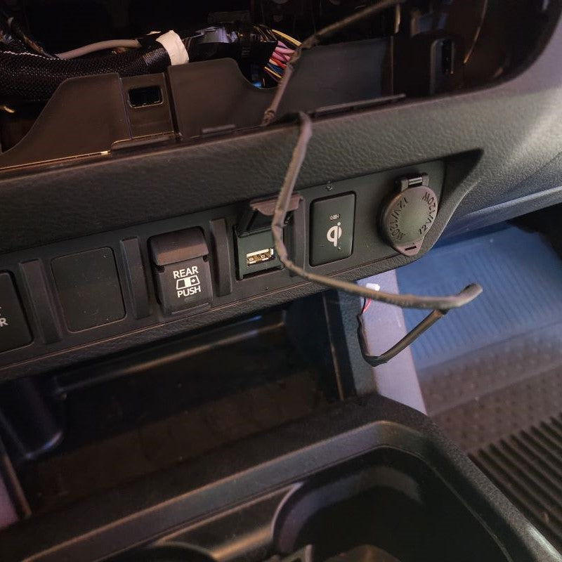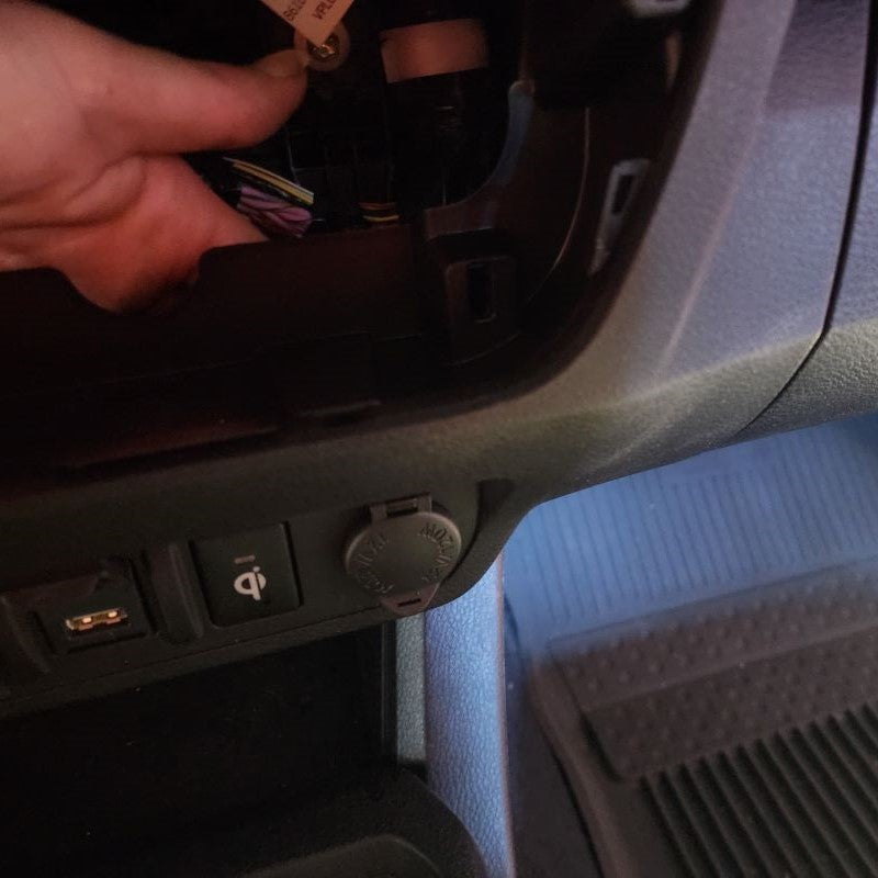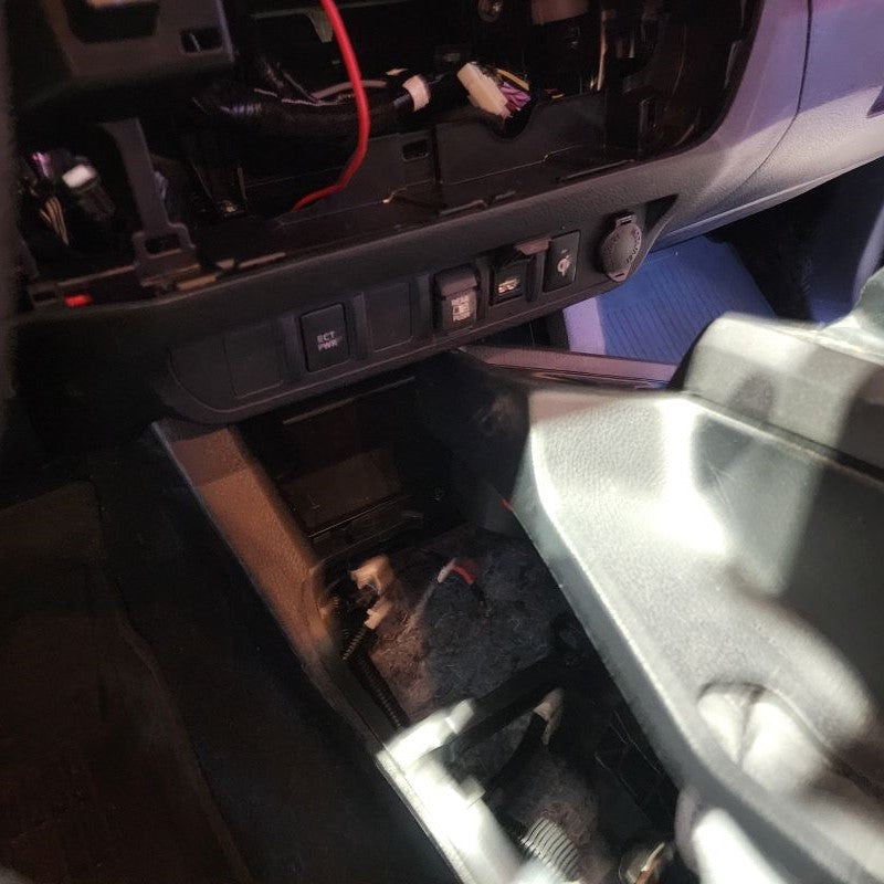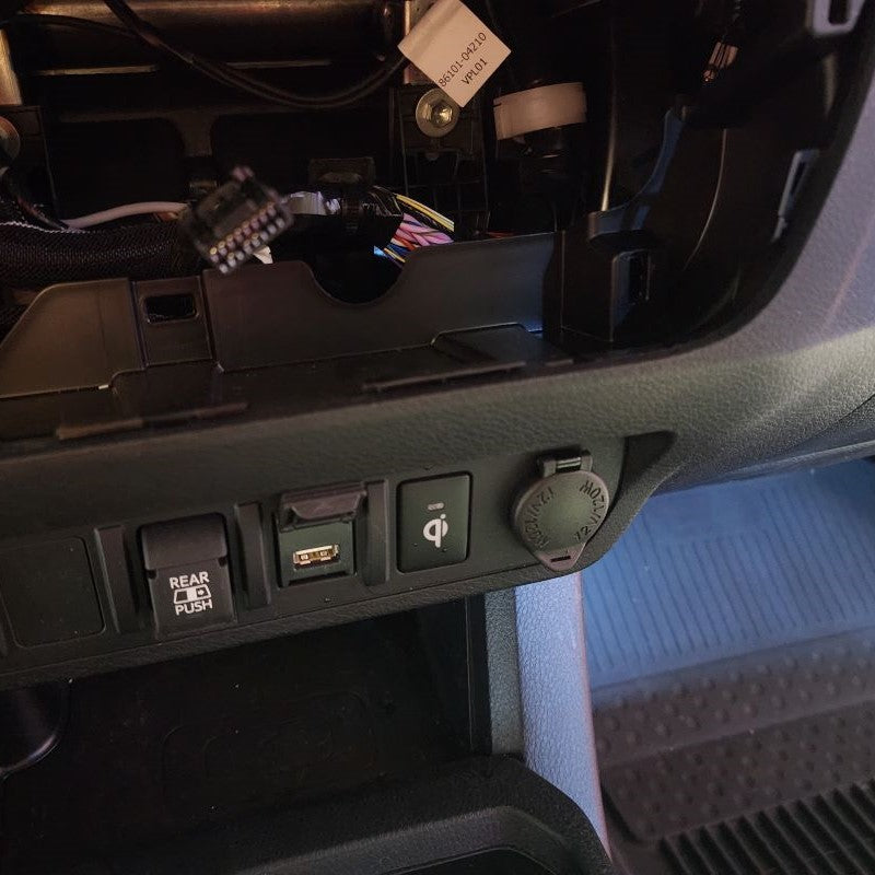 First, identify which 12V Power Source you have located under your armrest in the middle console. Those that have a Toyota Tacoma Model Years 2016-2018, you are going to use the wire harness and connect directly to the 12V Power Source located in the middle console. For those that have a Toyota Tacoma Model Years 2019 or Newer, you are going to use the 12V Power Source located in the Lower Instrument Panel Cover of the dash. Unfortionately and fortionately, Toyota added USB ports during these years in the armrest.