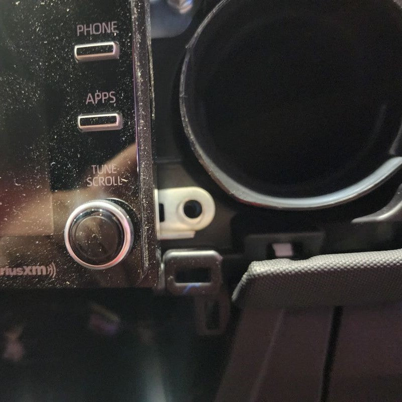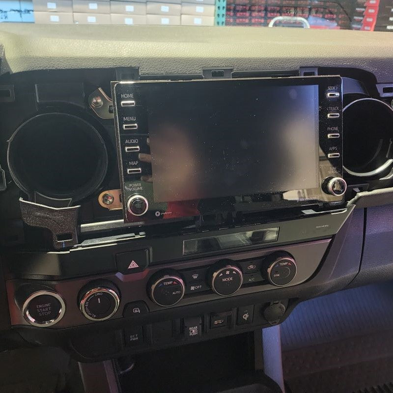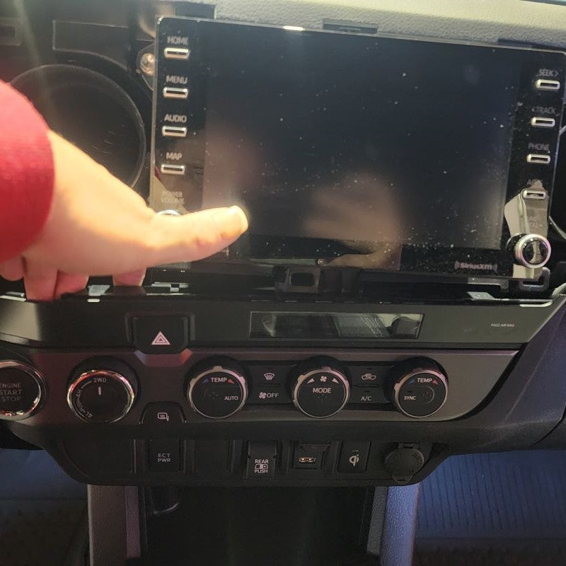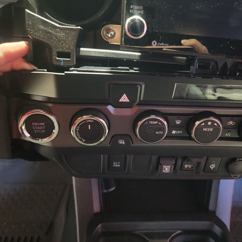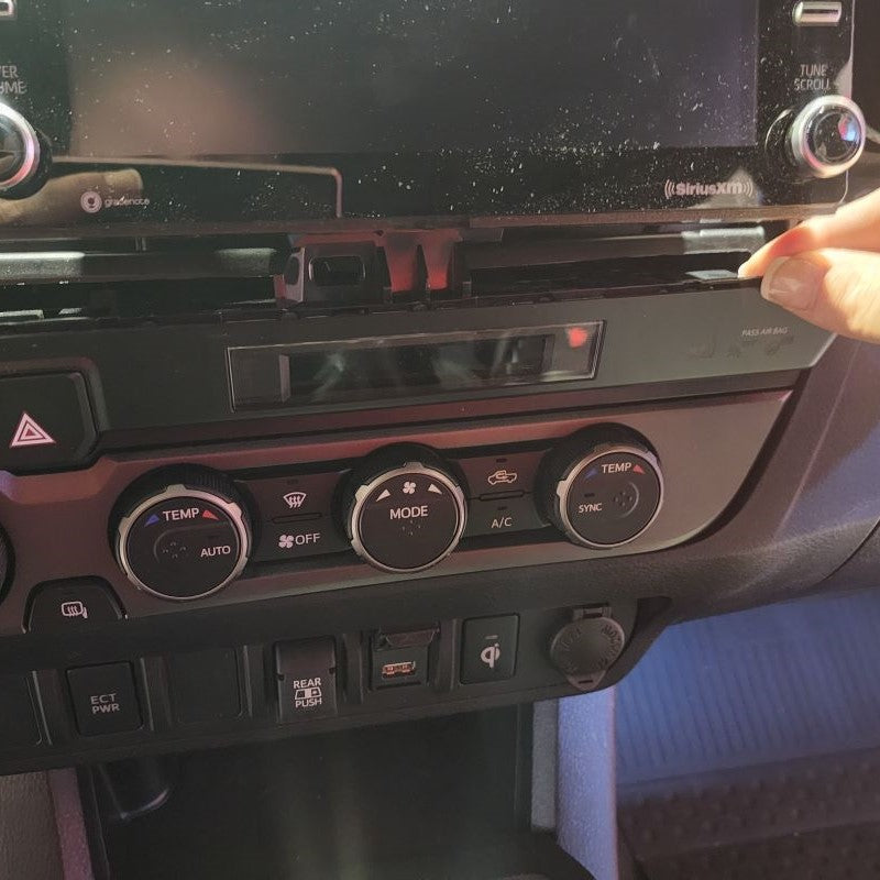 For those that have a Toyota Tacoma Model Years 2019 or Newer, you will have a little longer of a process before getting to Step 4. So......starting with your Center Trim Bezel covering your stereo, you will need to remove this first. Don't worry, it just pulls straight off. Put your fingers behind the Center Console Panel Trim and slowly just work your way around pulling it outward towards the center of the cab. Once it is removed, set it aside. Next, you will be removing the climate control Trim Bezel. Start with the small lower instrument trim panel that goes under your steering column. All you need to remove is the right side little thin section by your push start button. Please see pictures below. You can slowing start pulling the climate control bezel out.