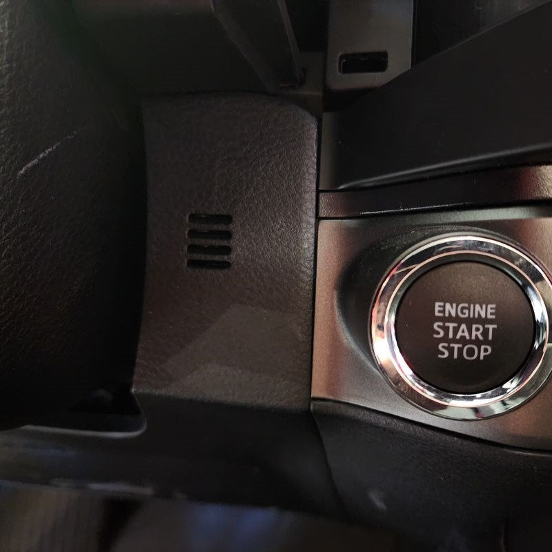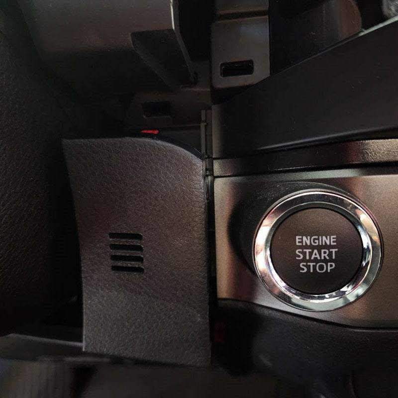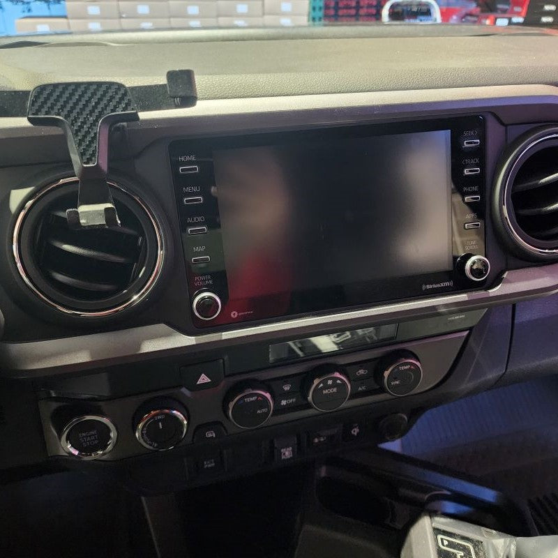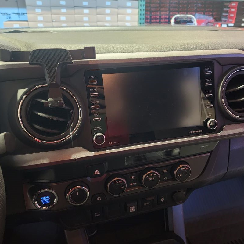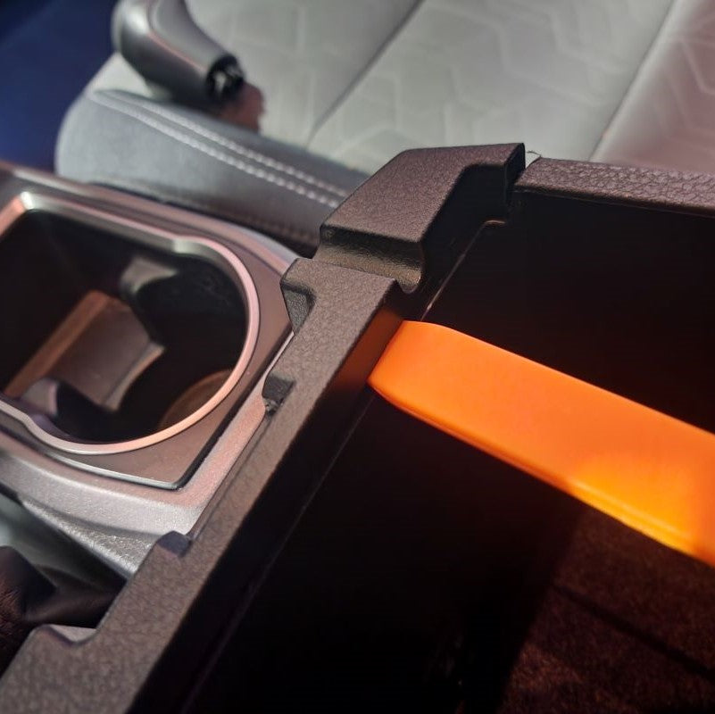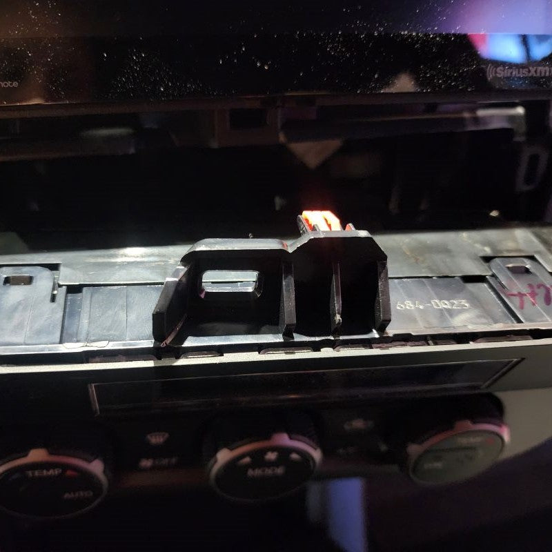 For those that have a Toyota Tacoma Model Years 2019 or Newer, you will have a little longer of a process before getting to Step 4. So......starting with your Center Trim Bezel covering your stereo, you will need to remove this first. Don't worry, it just pulls straight off. Put your fingers behind the Center Console Panel Trim and slowly just work your way around pulling it outward towards the center of the cab. Once it is removed, set it aside. Next, you will be removing the climate control Trim Bezel. Start with the small lower instrument trim panel that goes under your steering column. All you need to remove is the right side little thin section by your push start button. Please see pictures below. You can slowing start pulling the climate control bezel out.