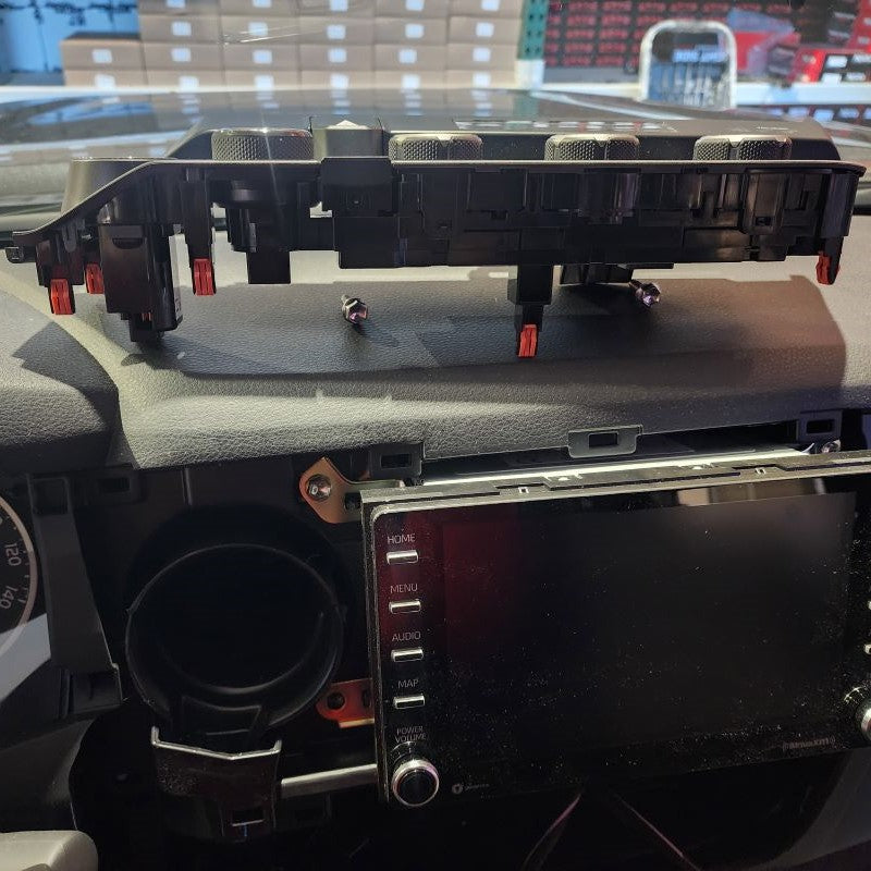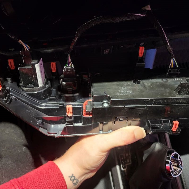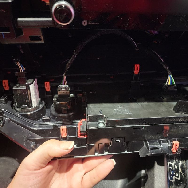 Once you have the climate control bezel released, be careful not to pull it all the way out until you discconnect the factory connectors on the backside. Set aside for later when you will reinstall.