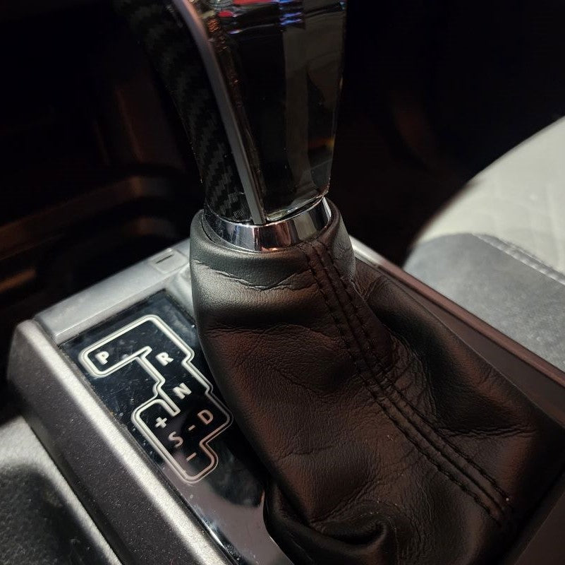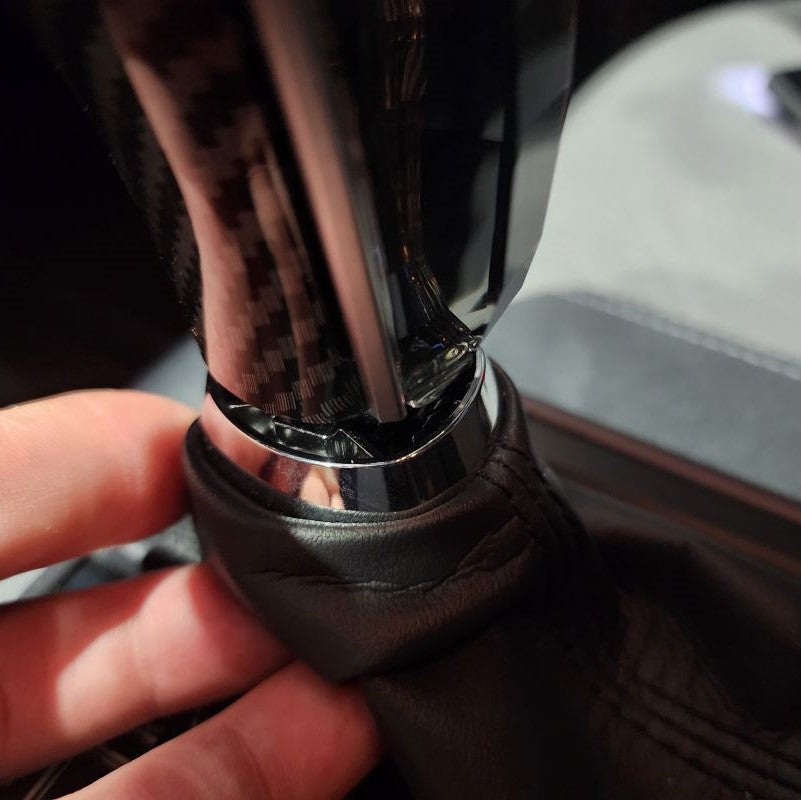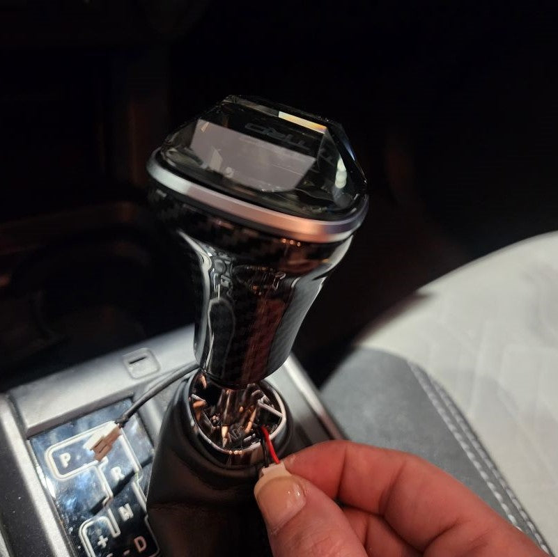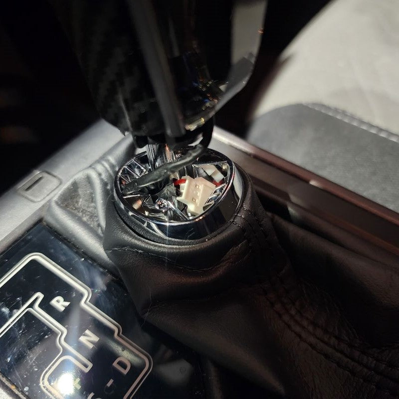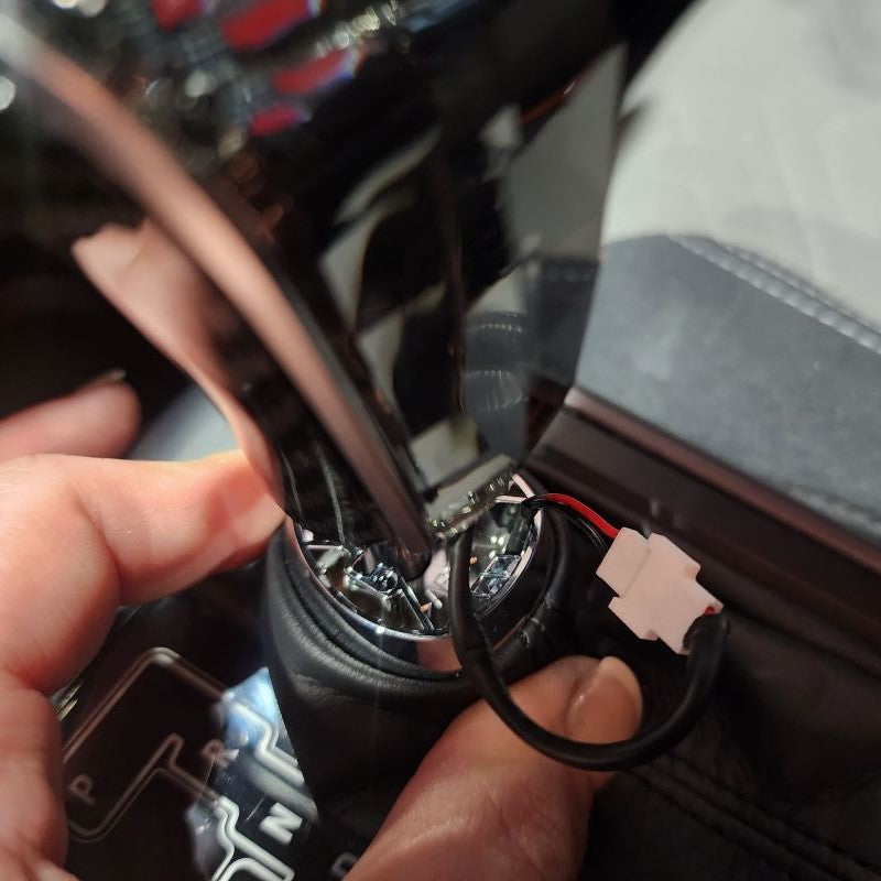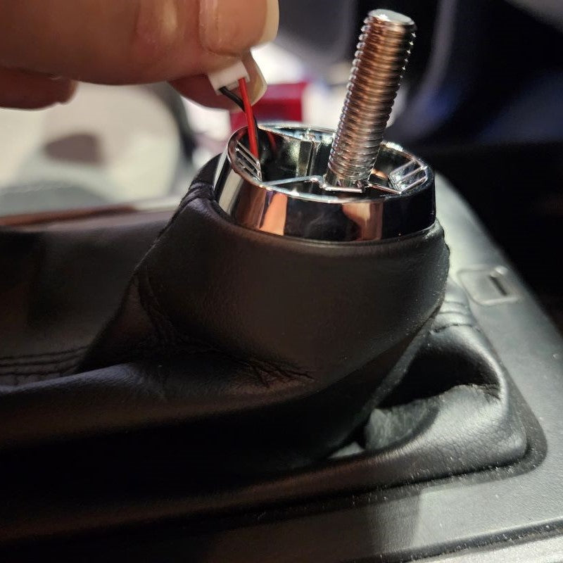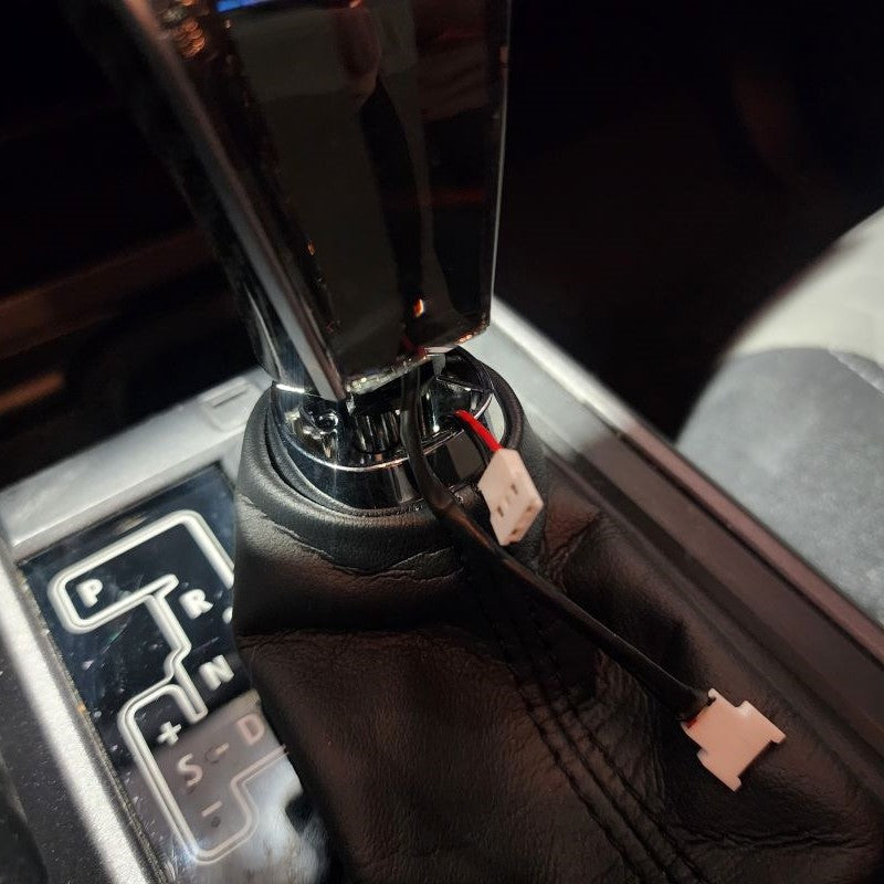 After the Crystal Shift Knob is as low as you desire, go ahead and connect both wire harnesses at this point. Next, you can push the wires back down into your Shift Boot. This will clear space for your to raise the Shift Boot and directly snap it back into place with your New Crystal Shift Knob.