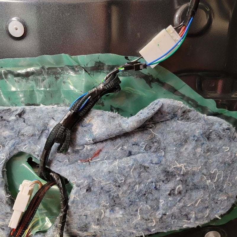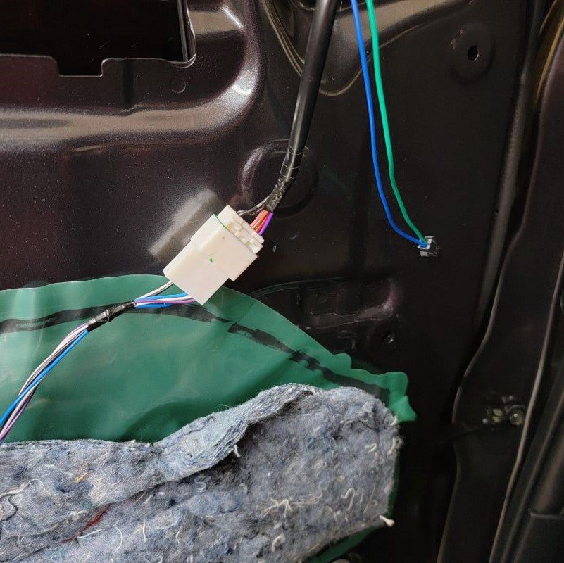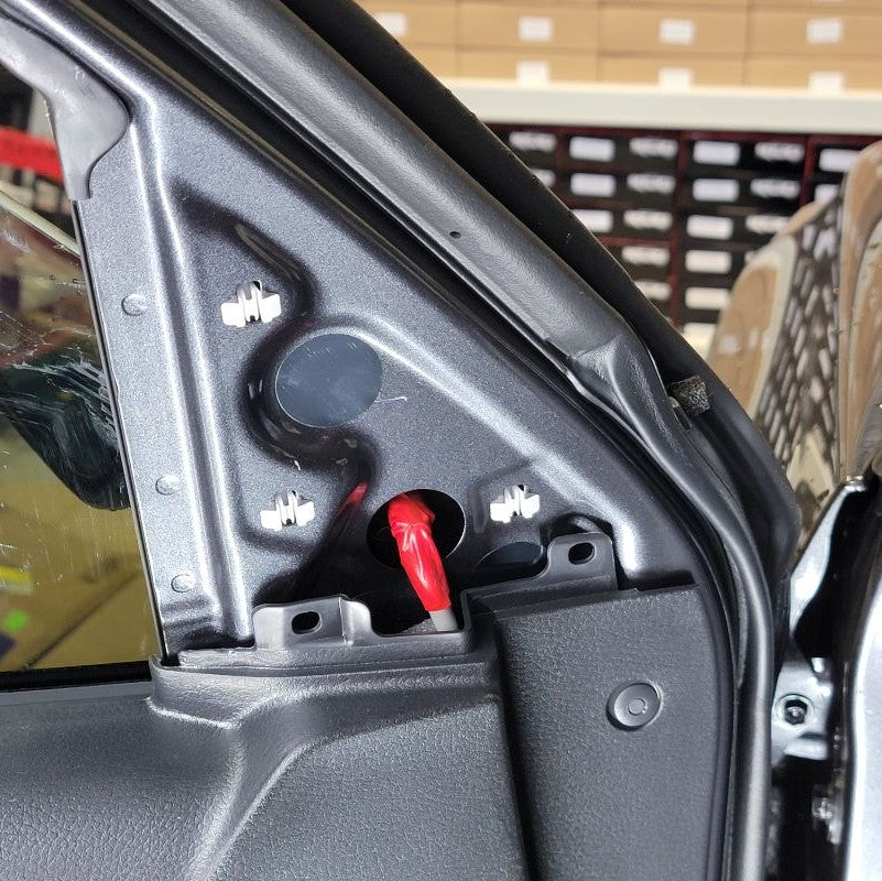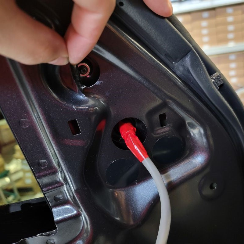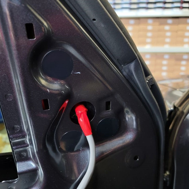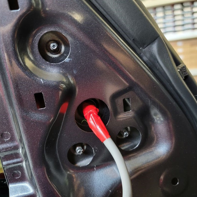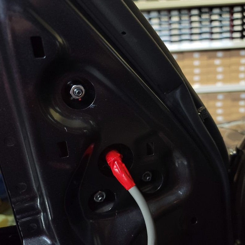 Let’s reattach them to the vehicle with the three original 10mm nuts. Make sure the wires are cleanly pulled through to the inner side of the door. Be careful not to lose your 10mm nuts in between the door panels because they will be lost for good.