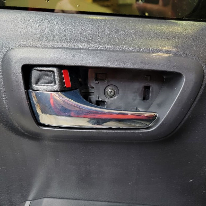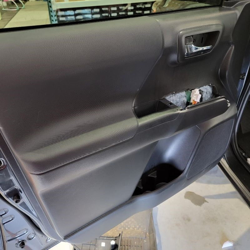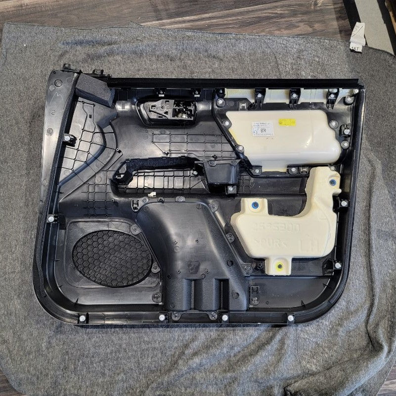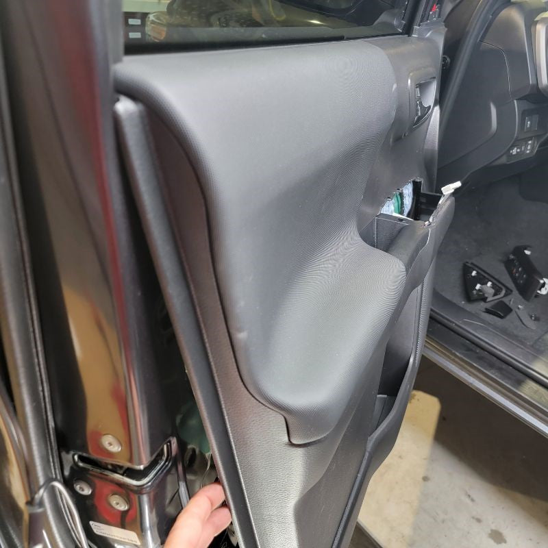 Using your handy trim removal tool or just your hand, begin in the lower right corner and start separating the door panel from the door frame. Slowly work your way around the bottom and sides, popping off each successive snap until you’re left with the door panel hanging by the top lip.