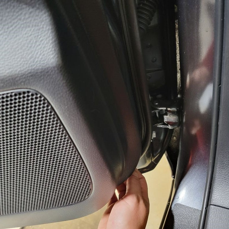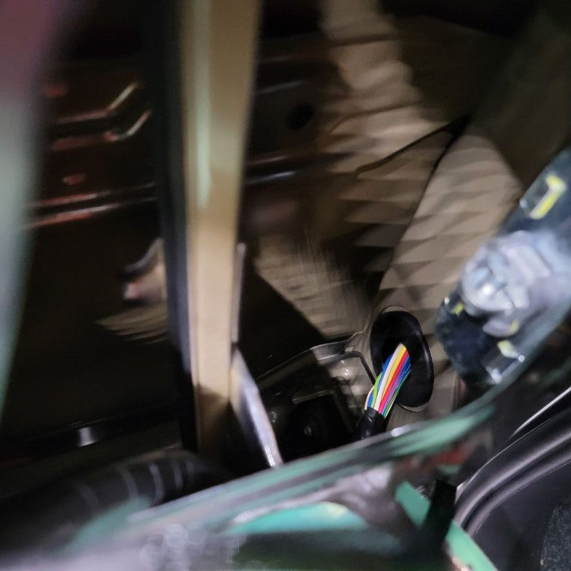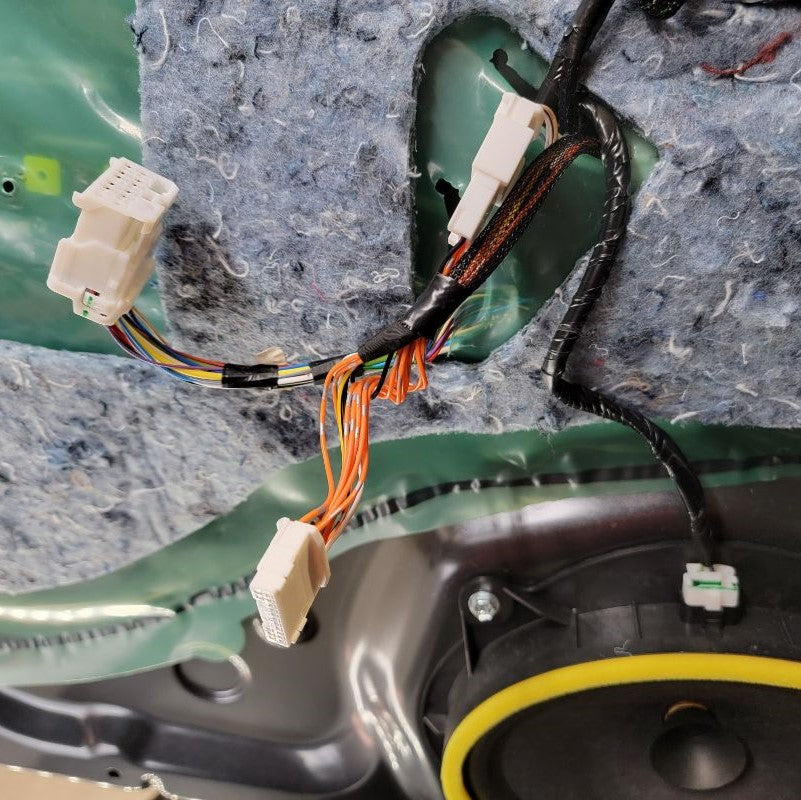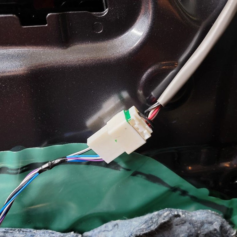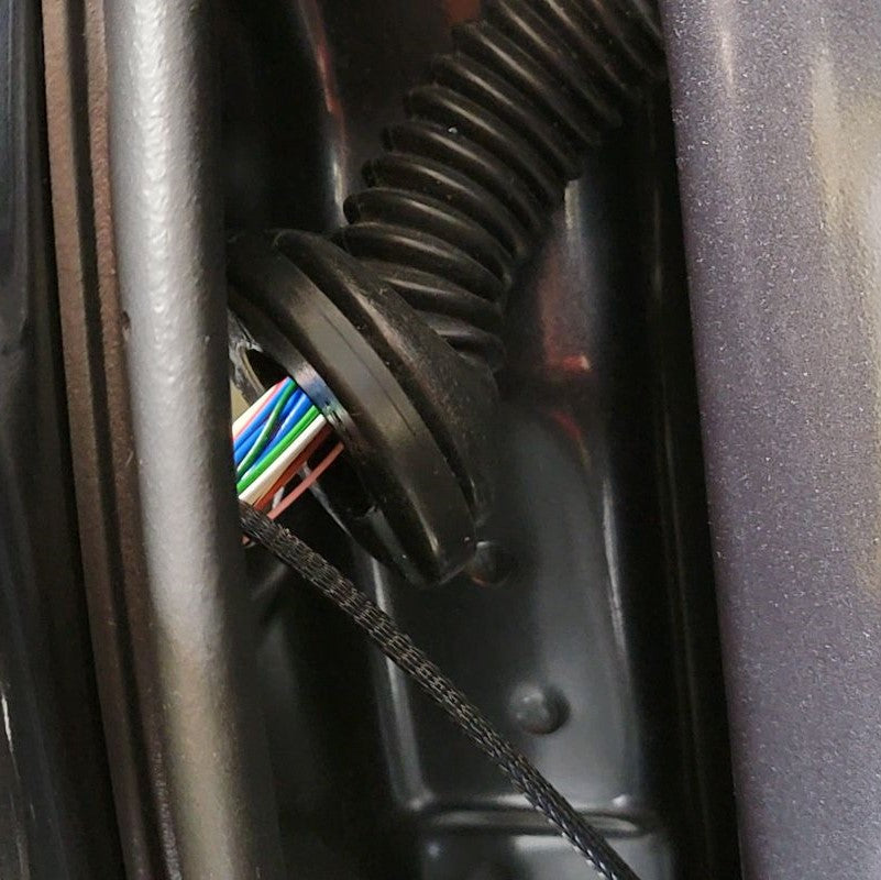 With now having the door frame exposed, we can easily find the mirror connector – just follow the wire that’s coming out of the mirror and routing down to the white connector at the top right side of the door. Remove the connector and any tape holding the cable in place.