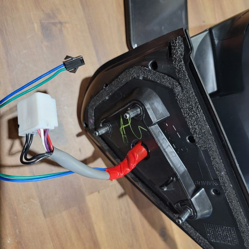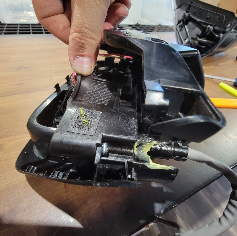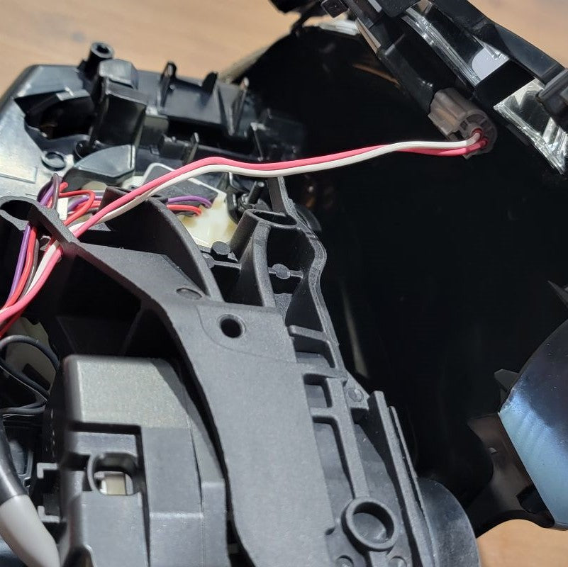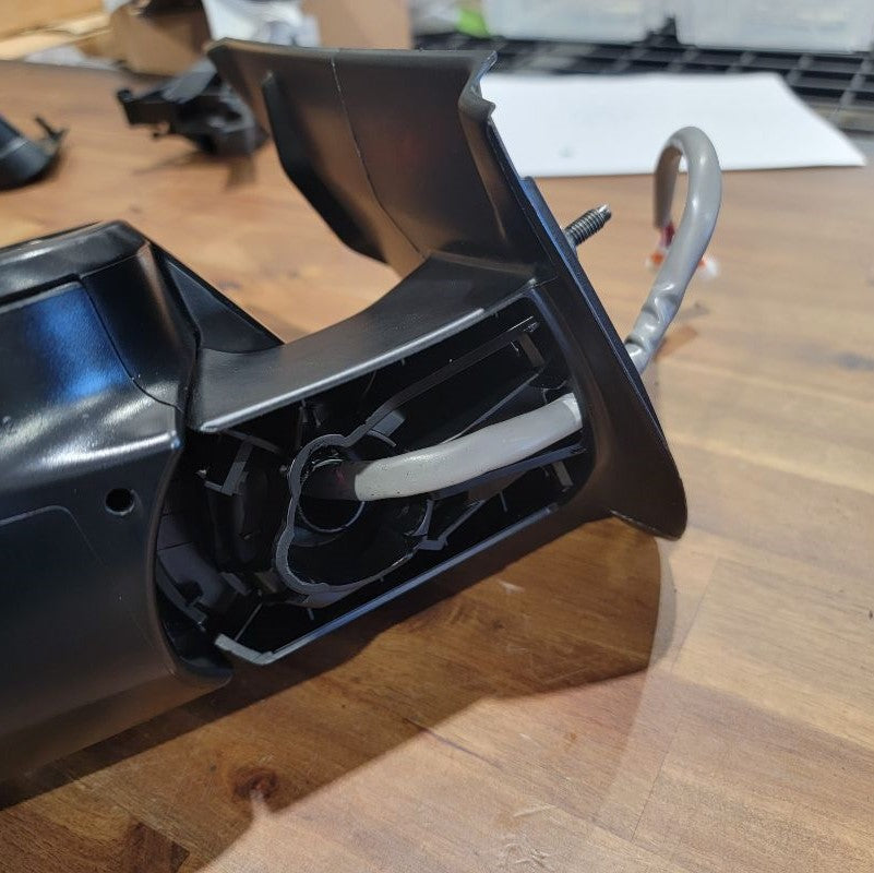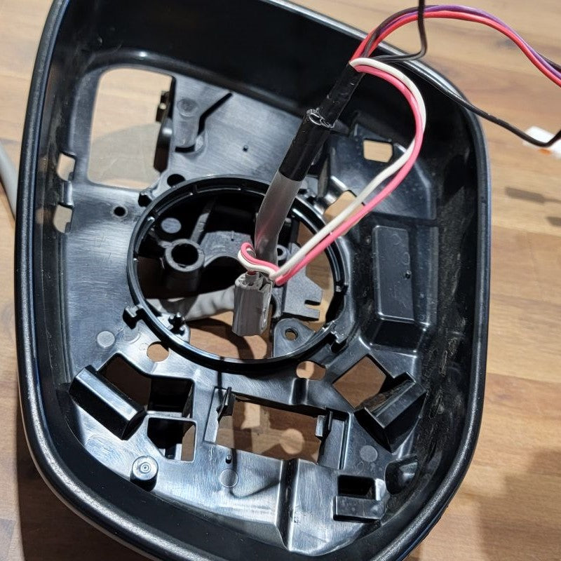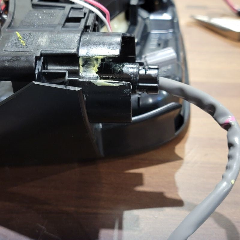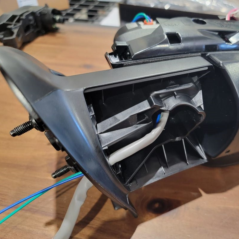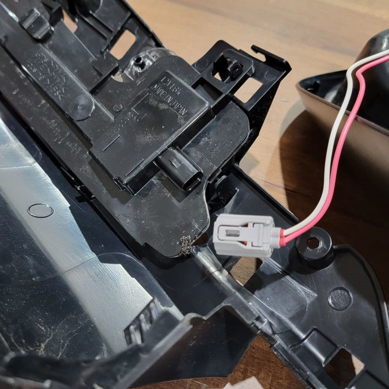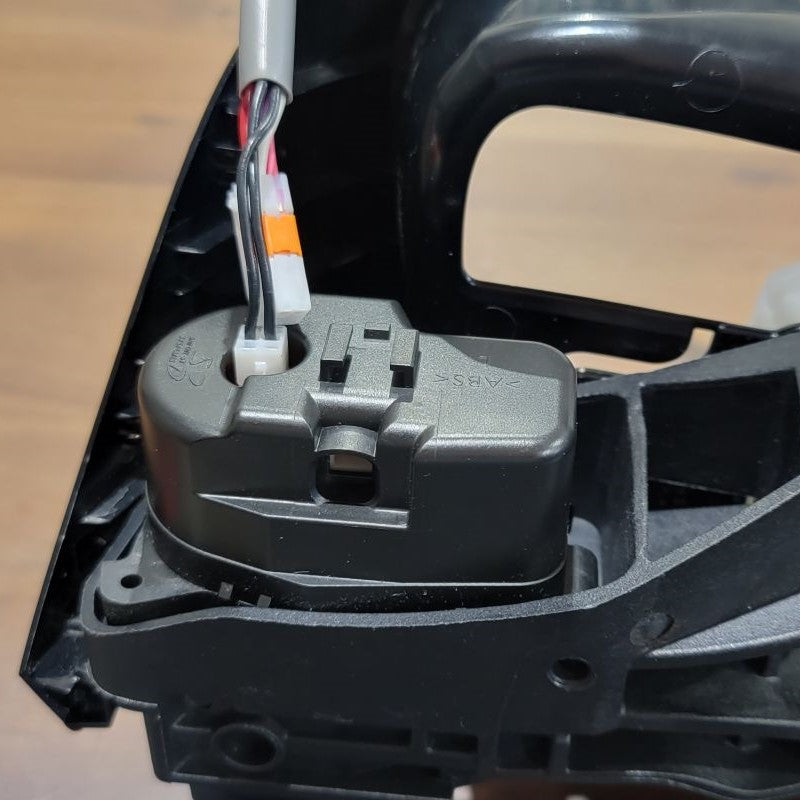 Now that we’re done pulling the cable through tight gaps, we can reassemble the two inner connectors into the outer housing and plug it back into the mirror receptacle. The power wires from the motor remain free.