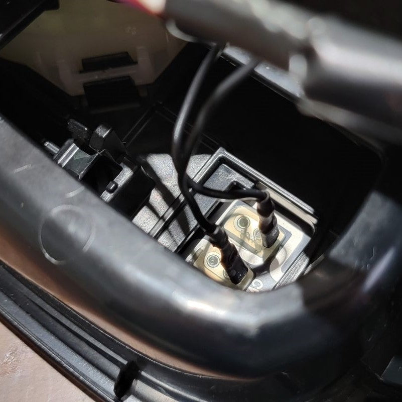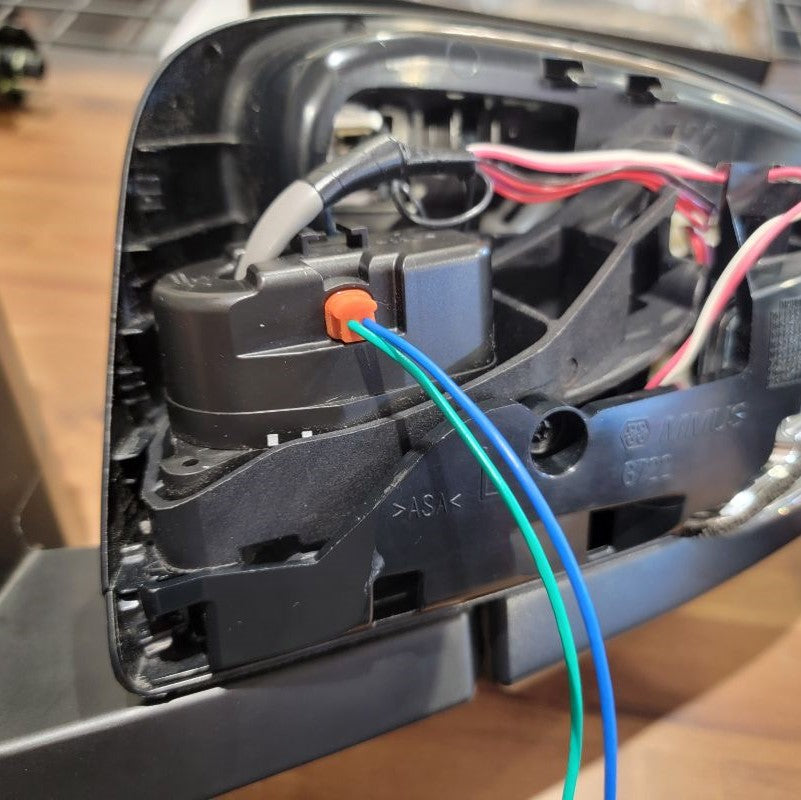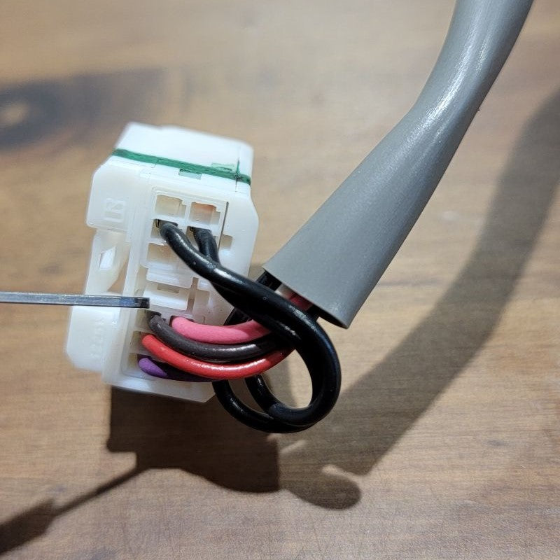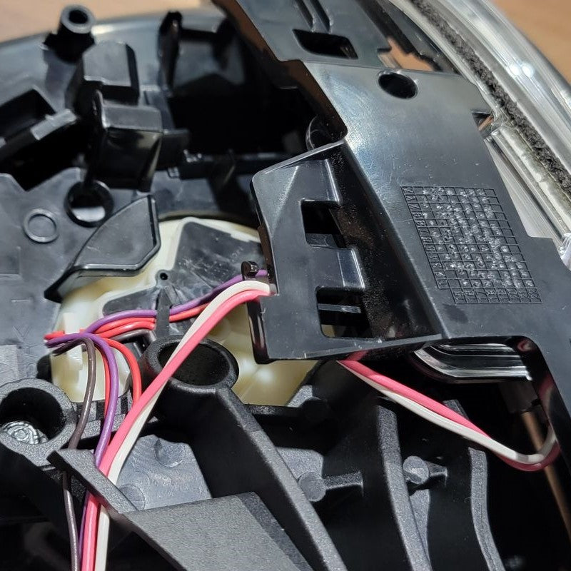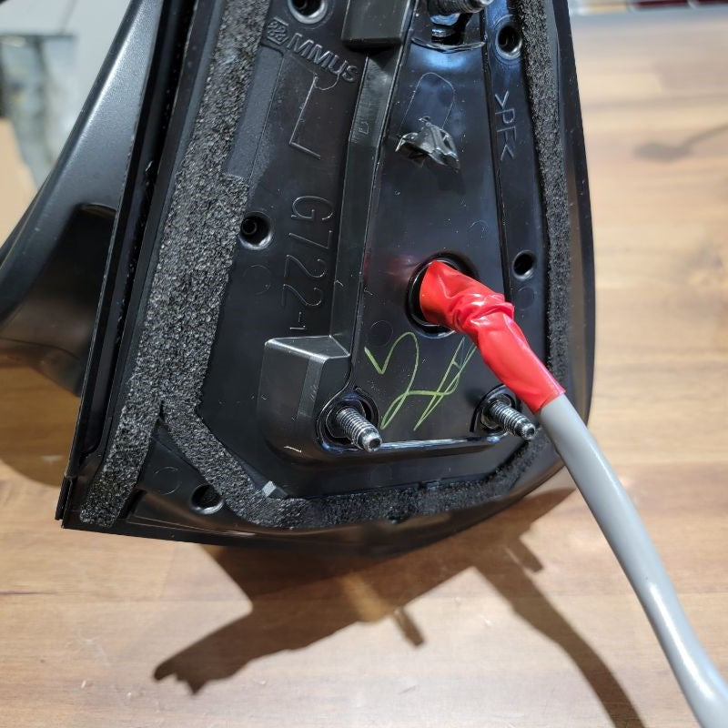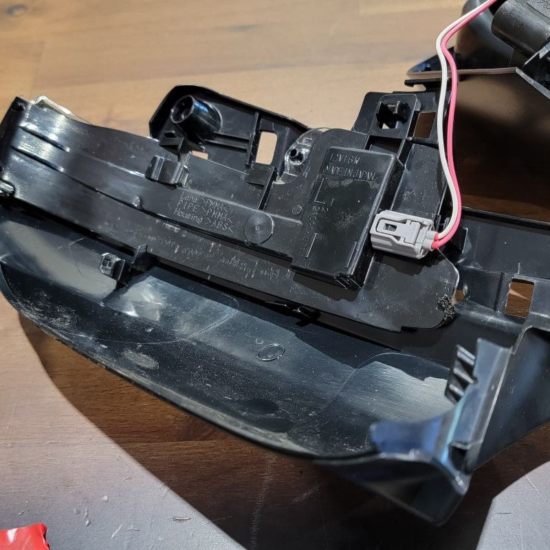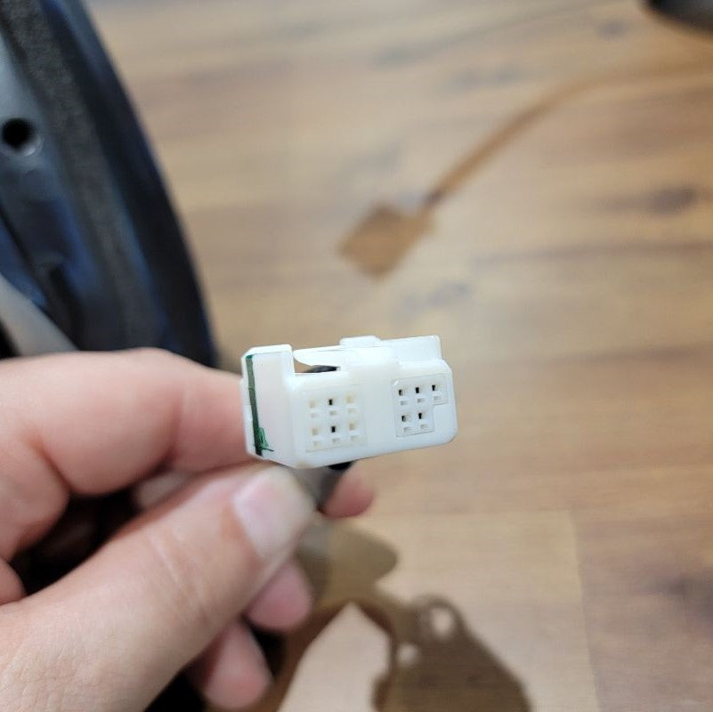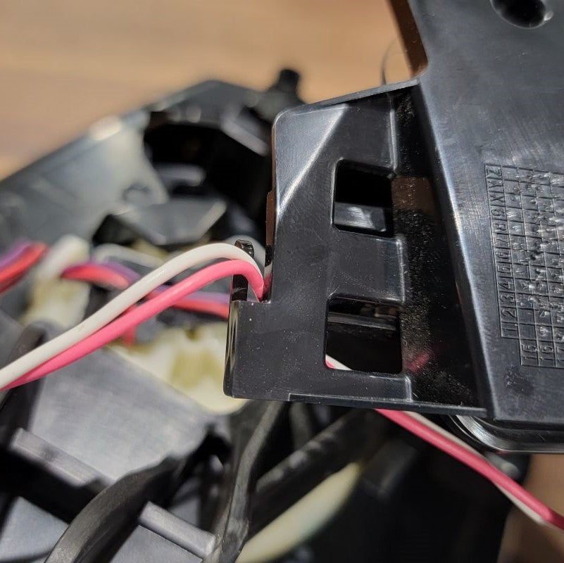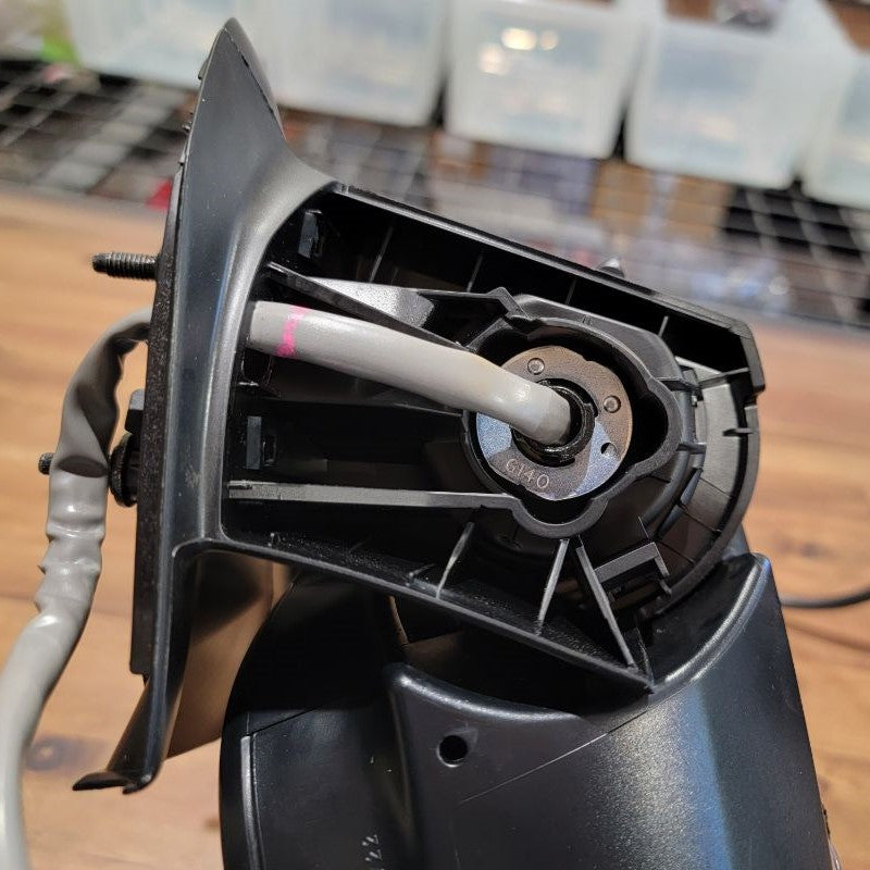 Now that we’re done pulling the cable through tight gaps, we can reassemble the two inner connectors into the outer housing and plug it back into the mirror receptacle. The power wires from the motor remain free.