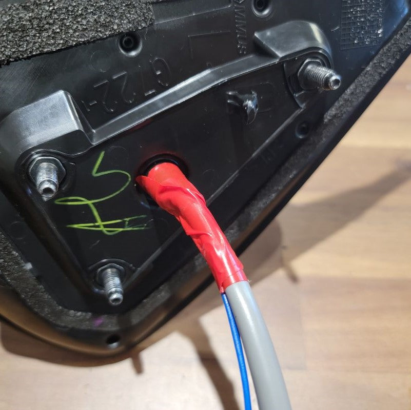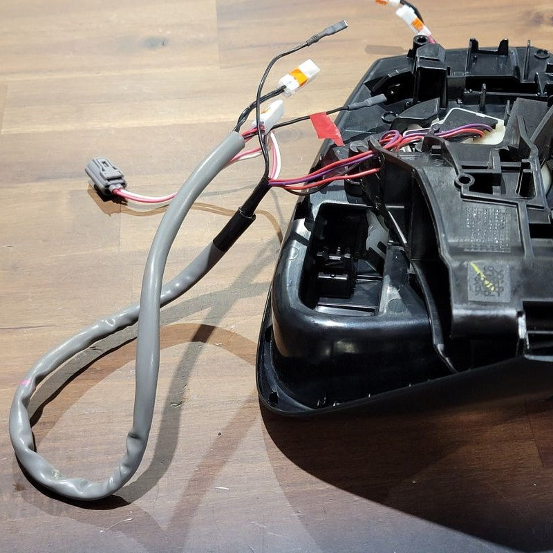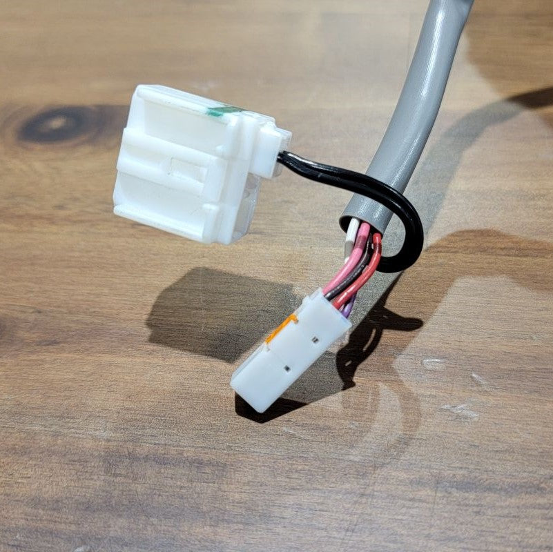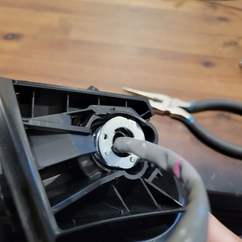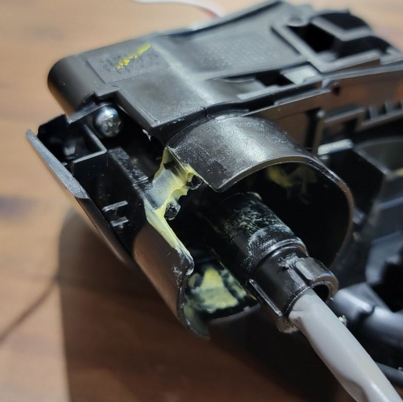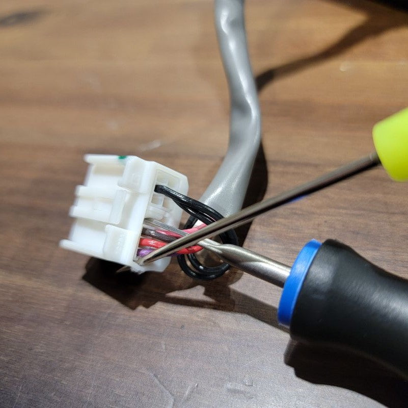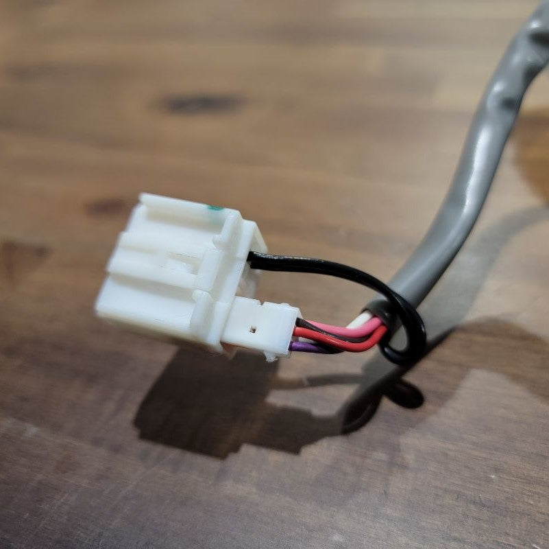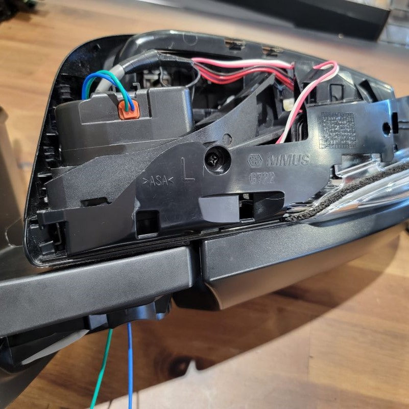 Now that we’re done pulling the cable through tight gaps, we can reassemble the two inner connectors into the outer housing and plug it back into the mirror receptacle. The power wires from the motor remain free.