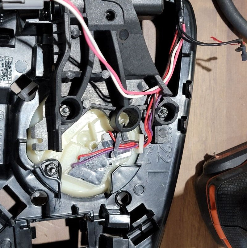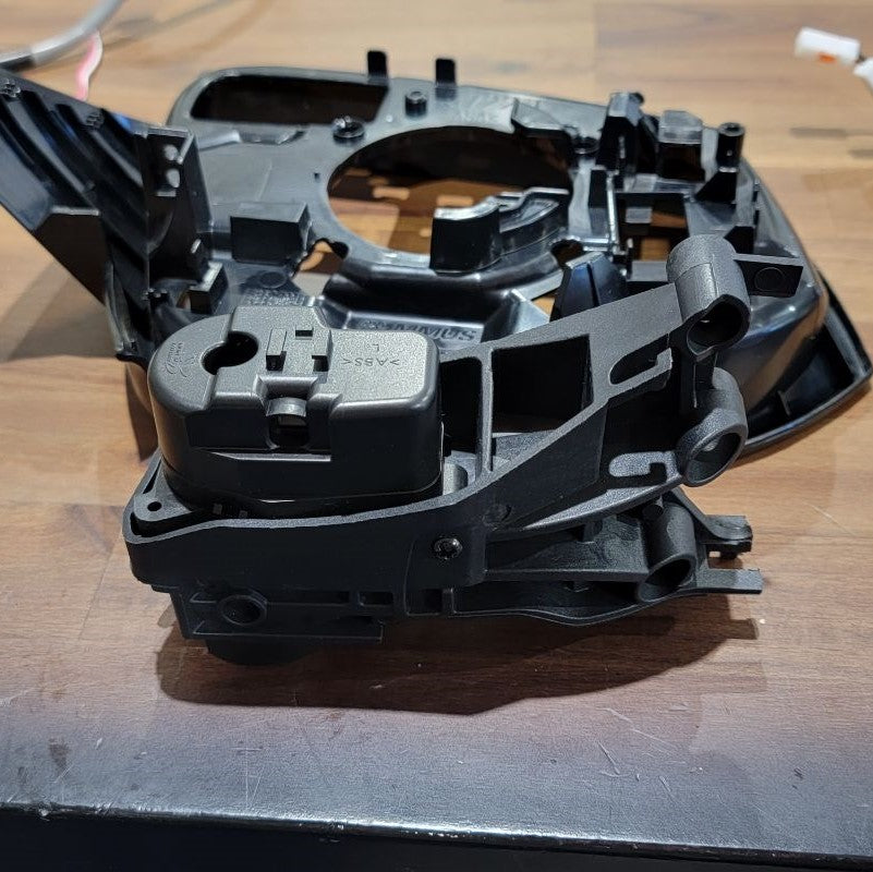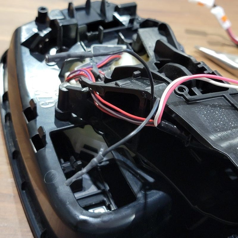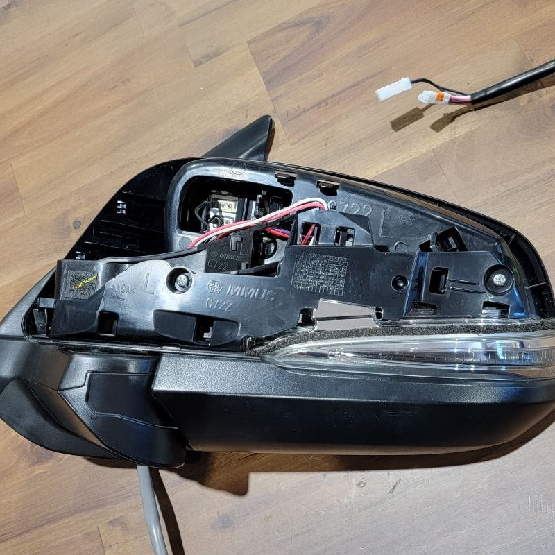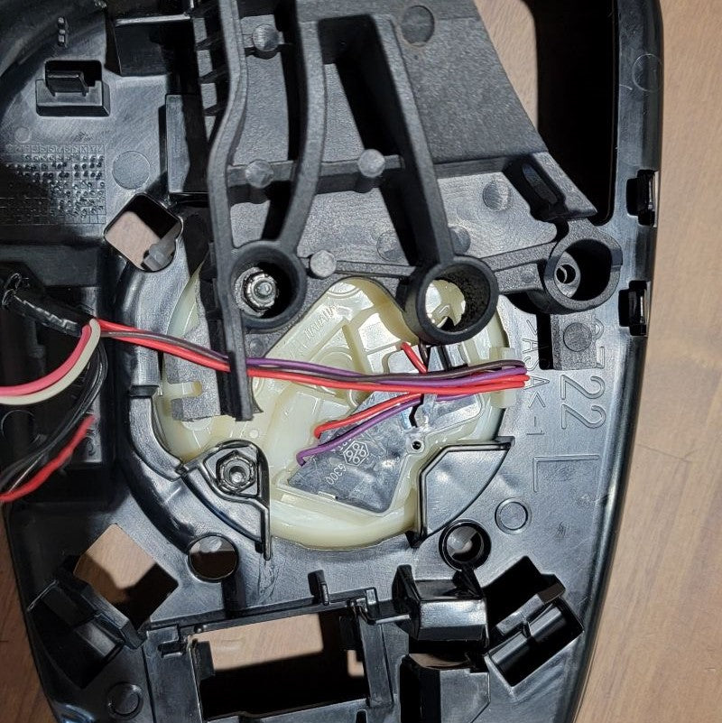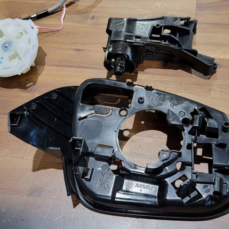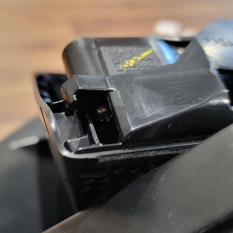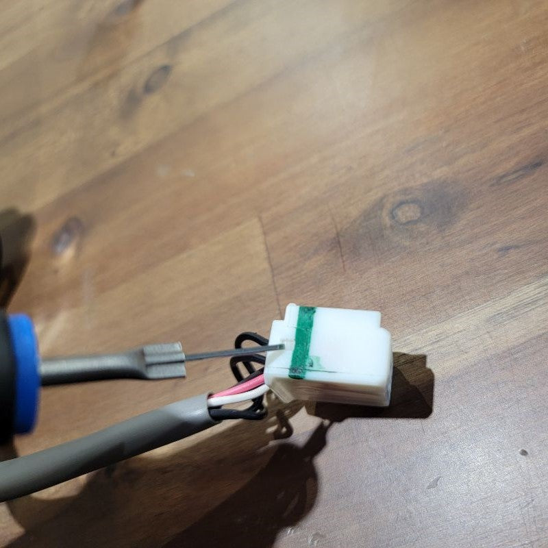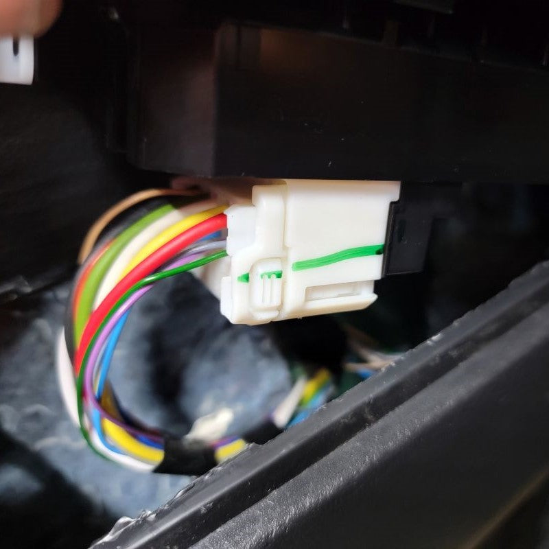 Now that we’re done pulling the cable through tight gaps, we can reassemble the two inner connectors into the outer housing and plug it back into the mirror receptacle. The power wires from the motor remain free.