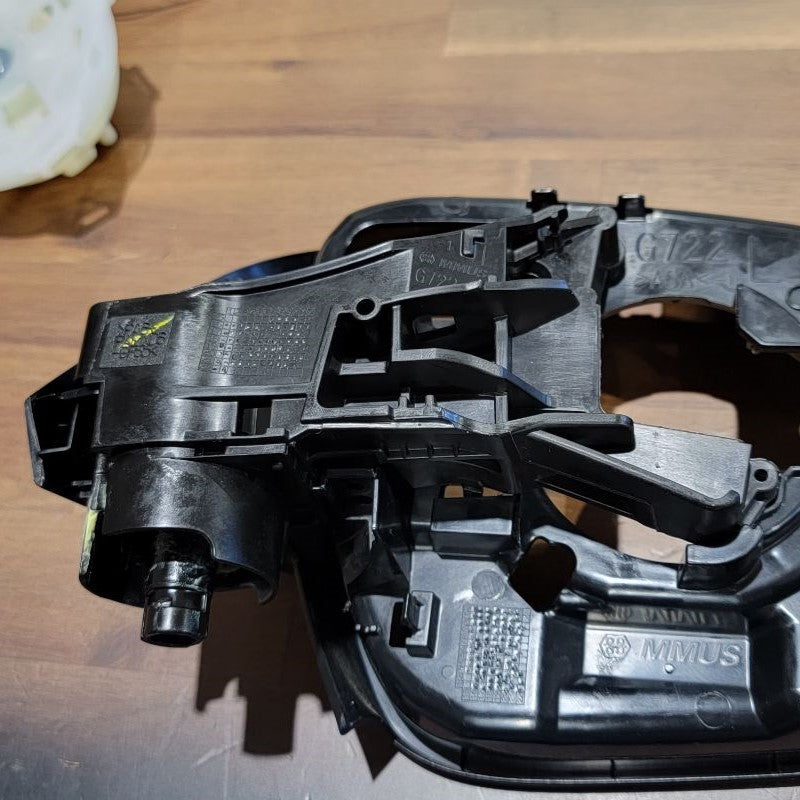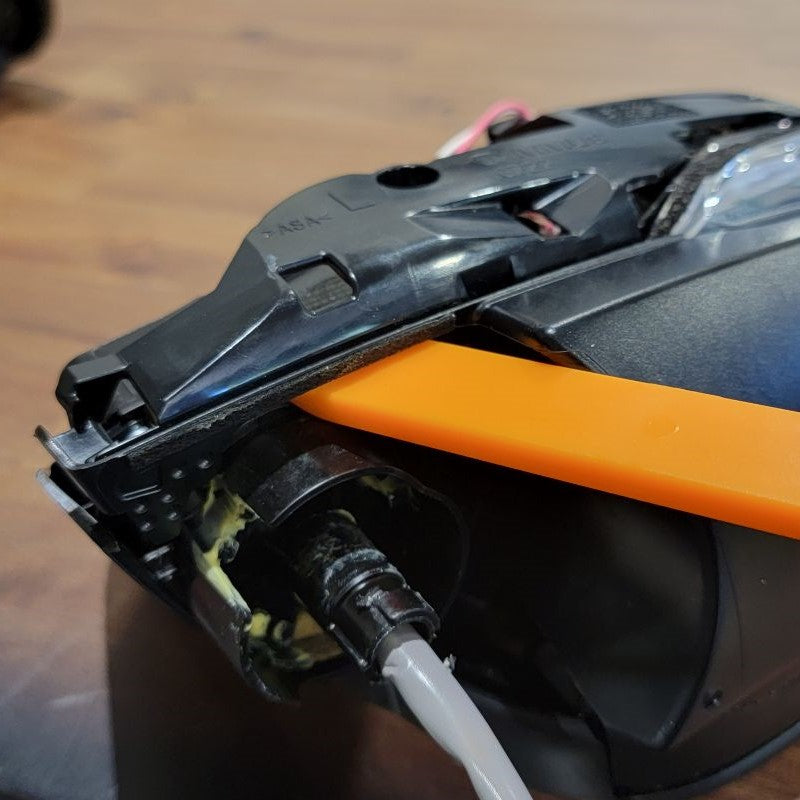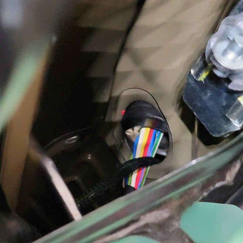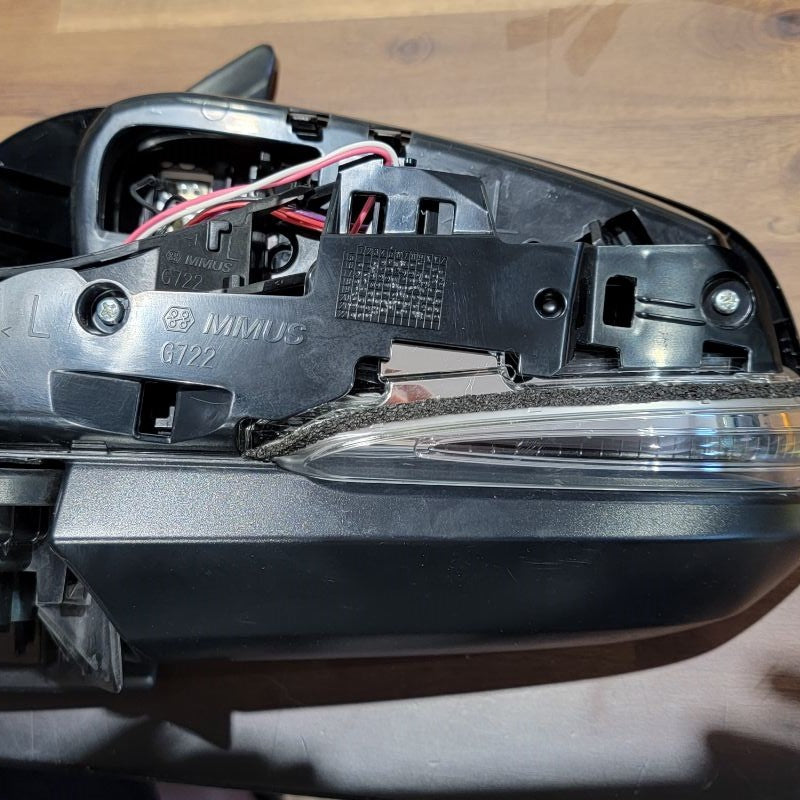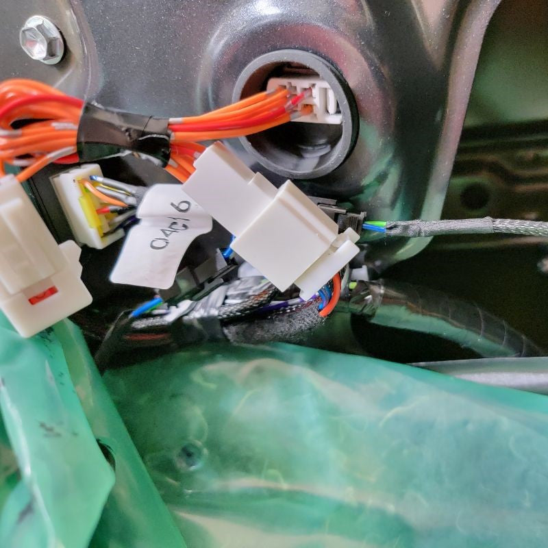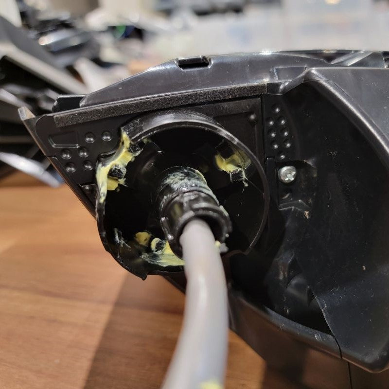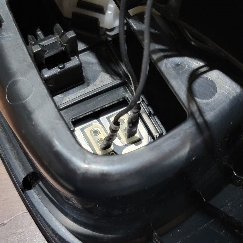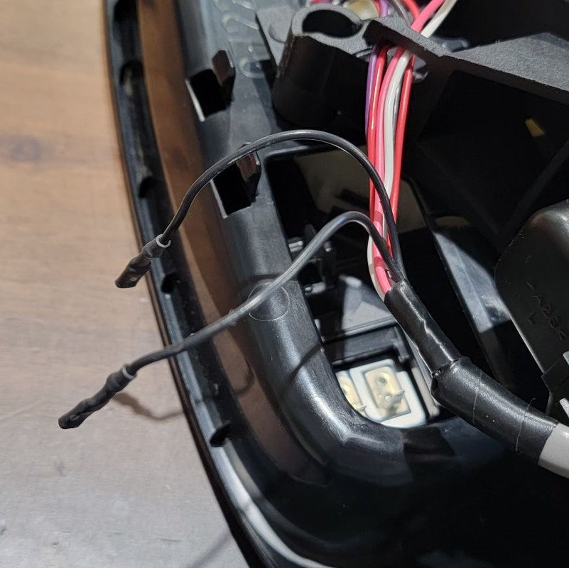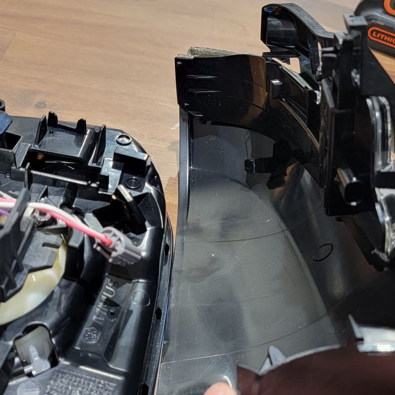 Now that we’re done pulling the cable through tight gaps, we can reassemble the two inner connectors into the outer housing and plug it back into the mirror receptacle. The power wires from the motor remain free.