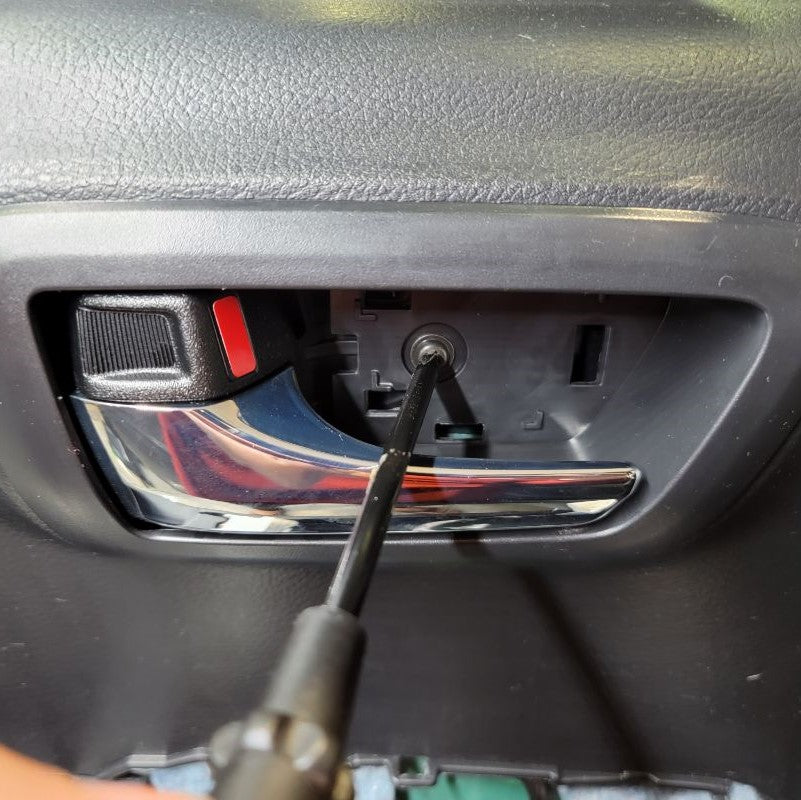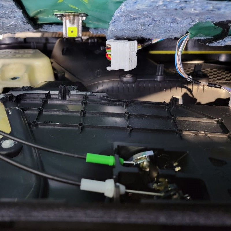 If you look behind the door panel you just pulled off, you’ll see one white and one green Bowden Cable termination. Carefully snap these out of the black housing and maneuver the steel cable ends out of their enclosures.