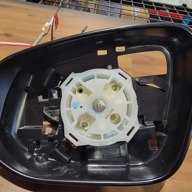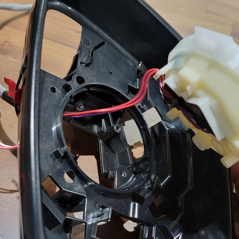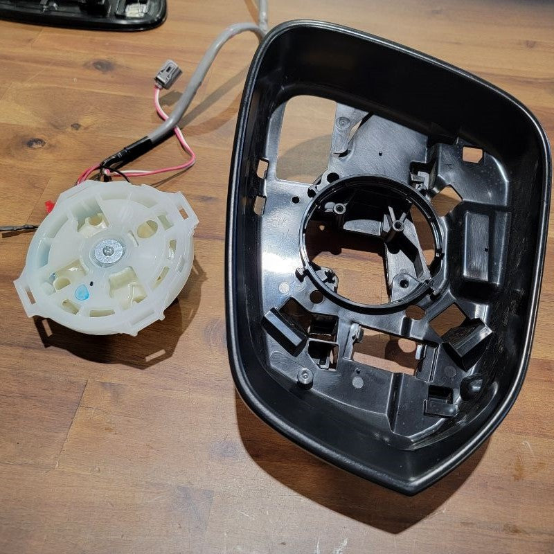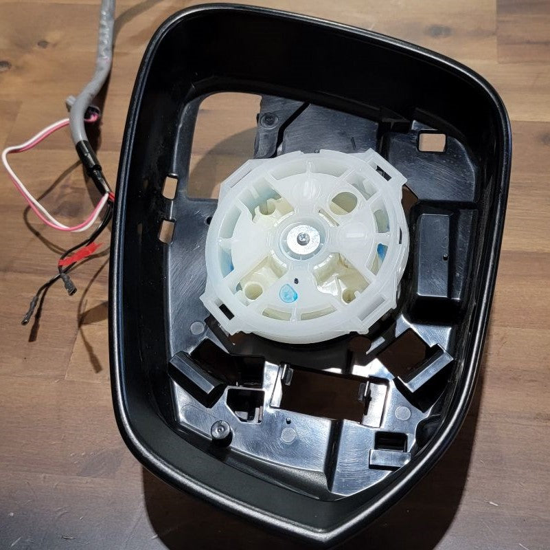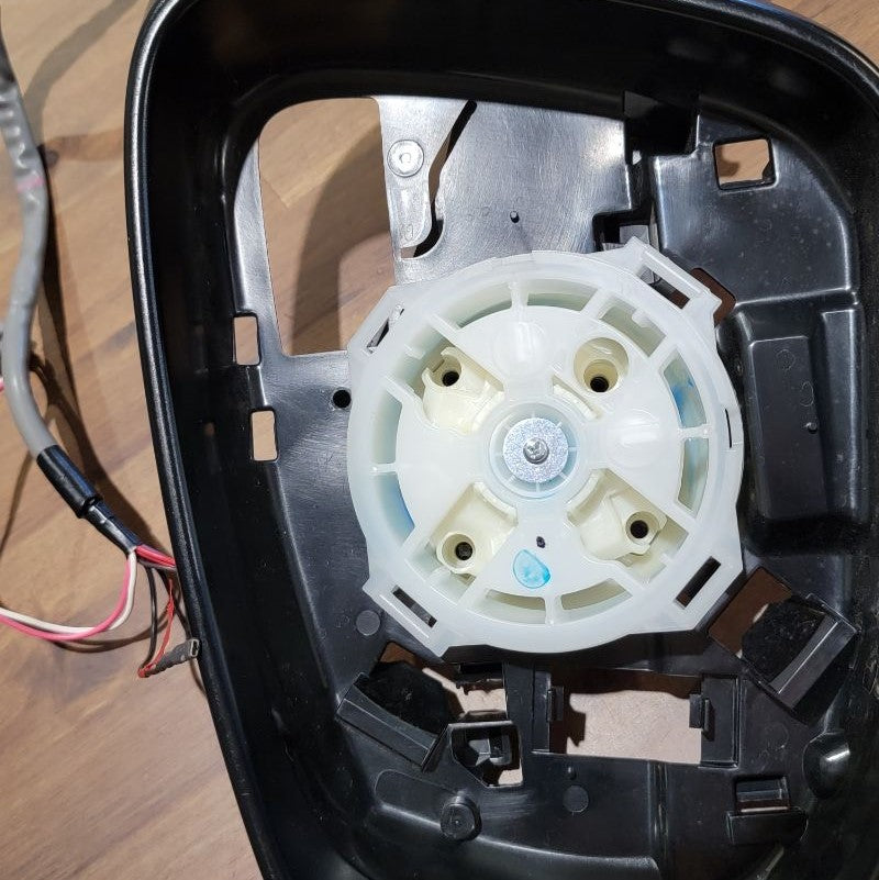Go ahead and re-assemble your mirror assembly by starting with your mirror and lining up notches on the back of the glass. Run the wire harness through all their tabs and down the new motor center slot.