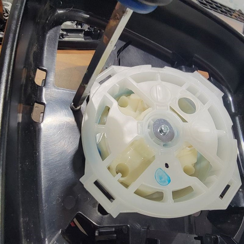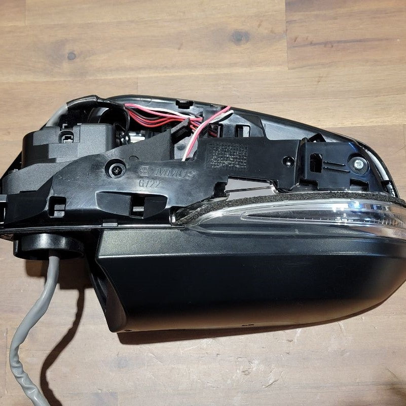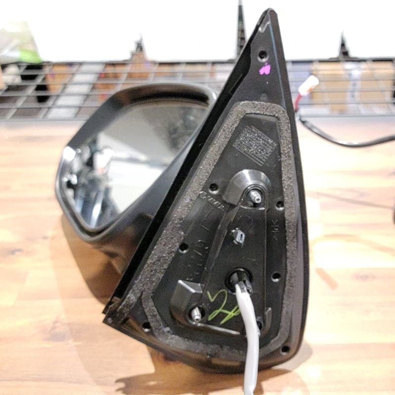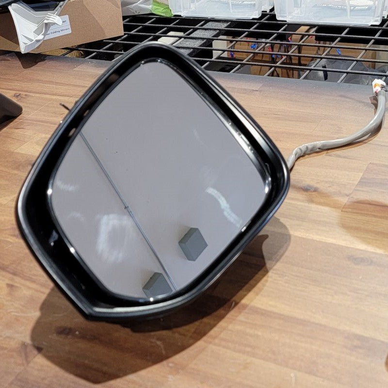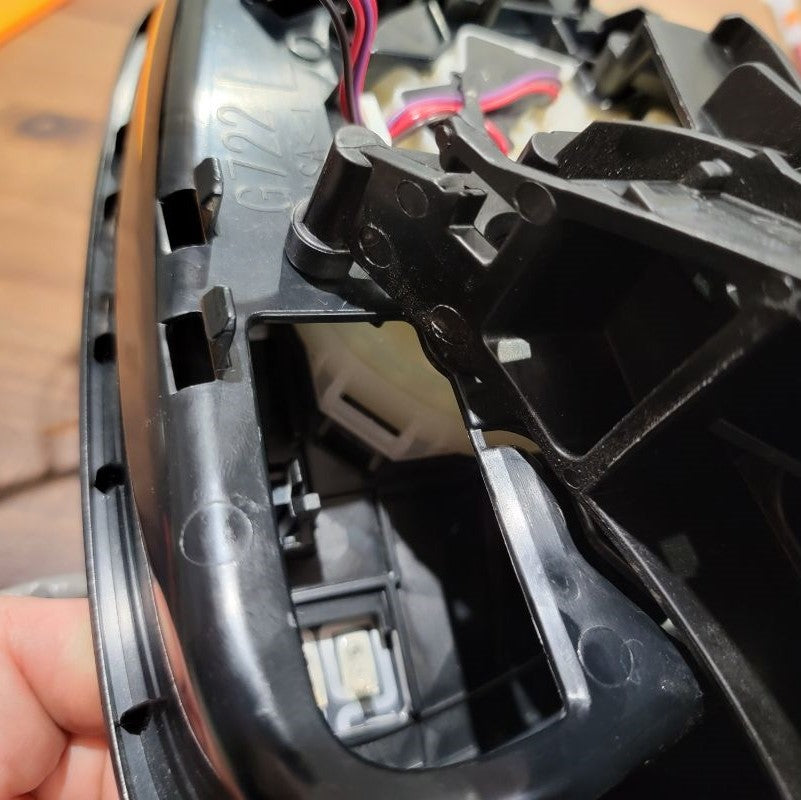 Go ahead and re-assemble your mirror assembly by starting with your mirror and lining up notches on the back of the glass. Run the wire harness through all their tabs and down the new motor center slot.