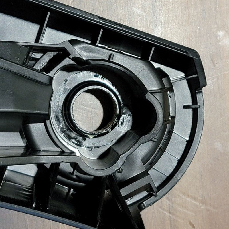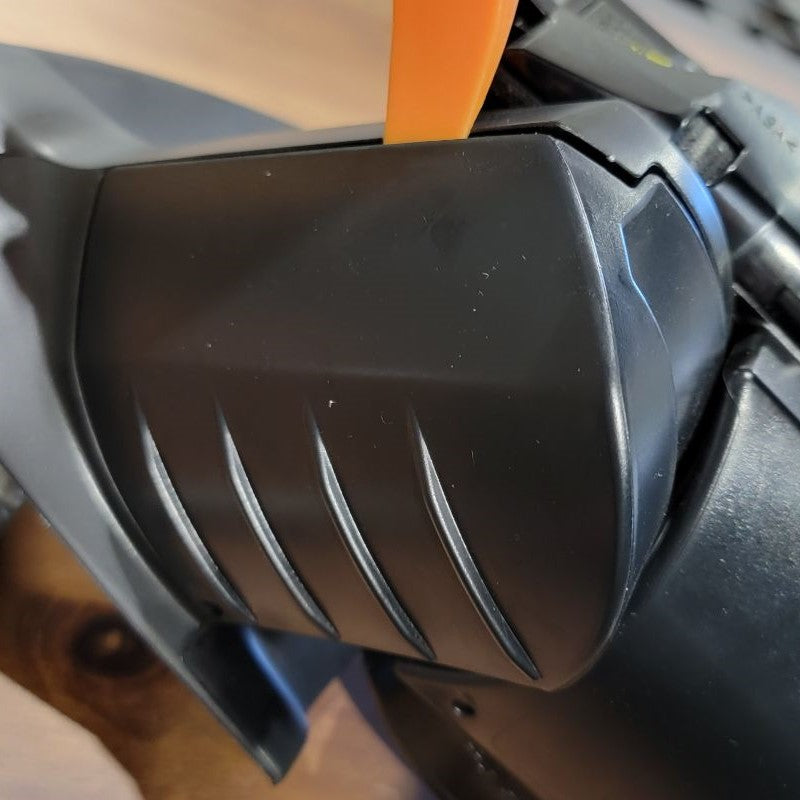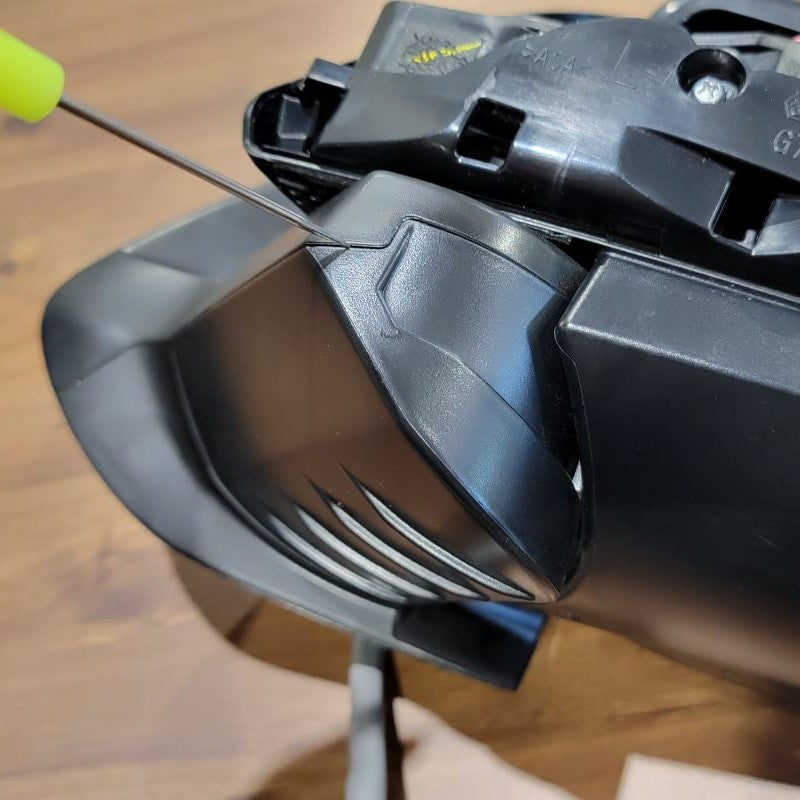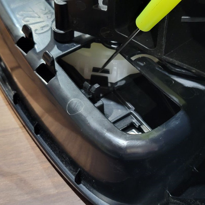 In order to remove the cosmetic cover, don't be afraid to use your trim removal tool and wedge it in between the mirror housing and the back cover to pry up and pop it off.