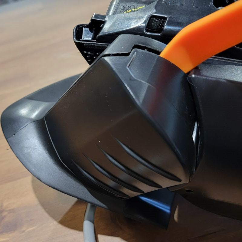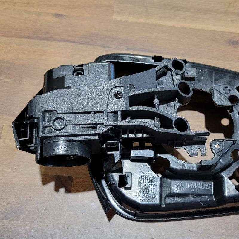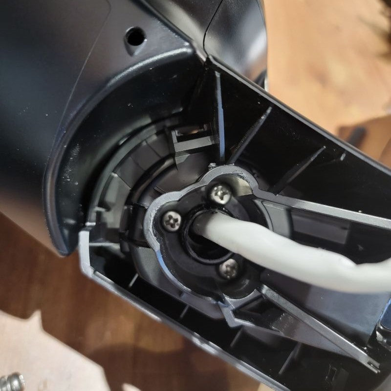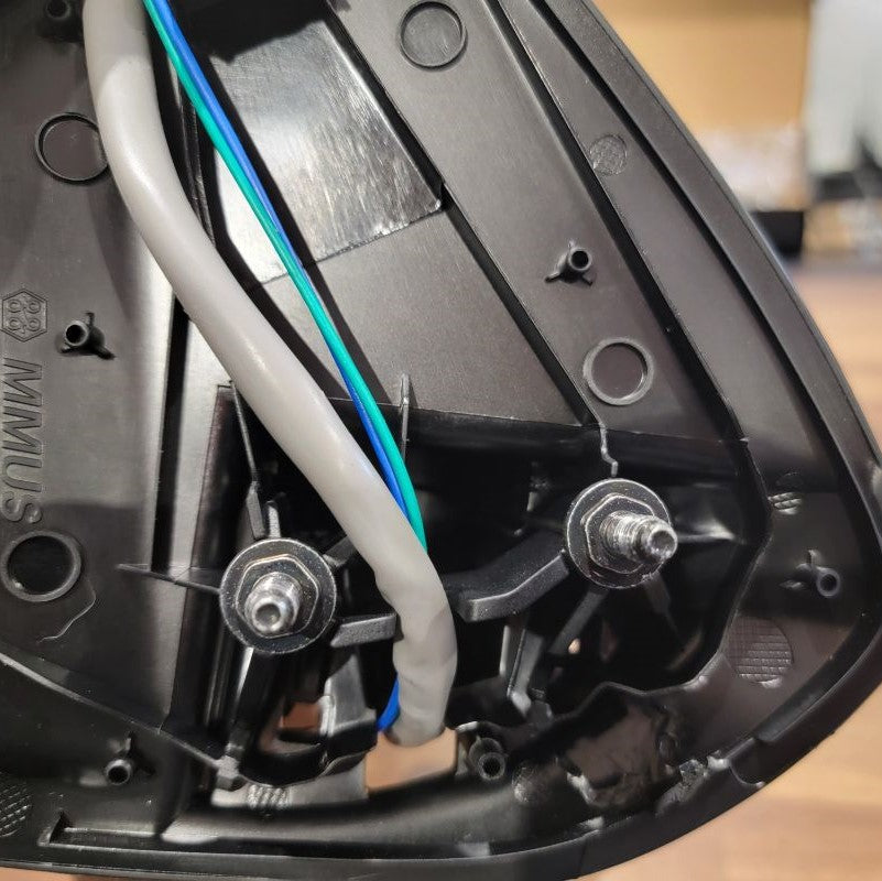Next, using the supplied screws (three per mirror), mount the mirror assembly to the mirror arm. Make sure that you position the mirror in the unfolded state when screwing the mirror to the arm. You can now route the cable along with the wire guides and out the mounting face. Finish up by re-attaching the lower arm cover and rubber isolator. Hope you noted how to route the wires behind it! In case you didn’t, send the wires around the inner perimeter to the center opening so they can exit out the inner hole of the rubber isolator.