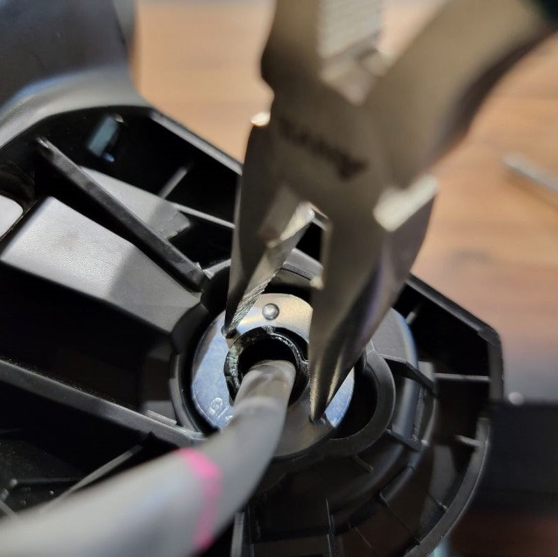 With the addition of the motor, this becomes unnecessary, so we can get rid of it. Insert the tips of the needle-nose pliers into the two opposing holes on the spring clip.