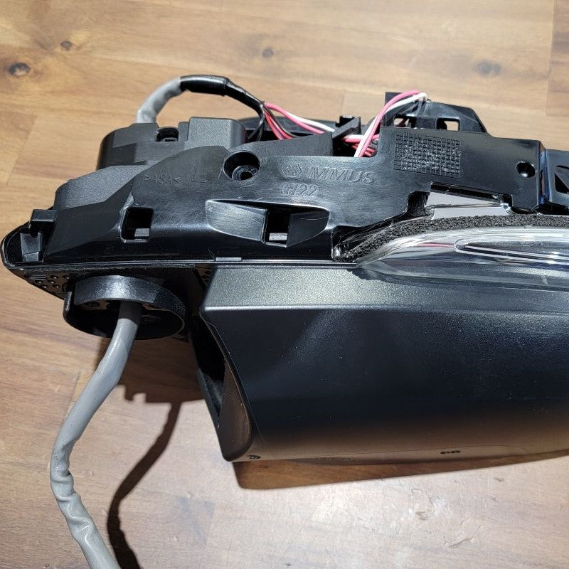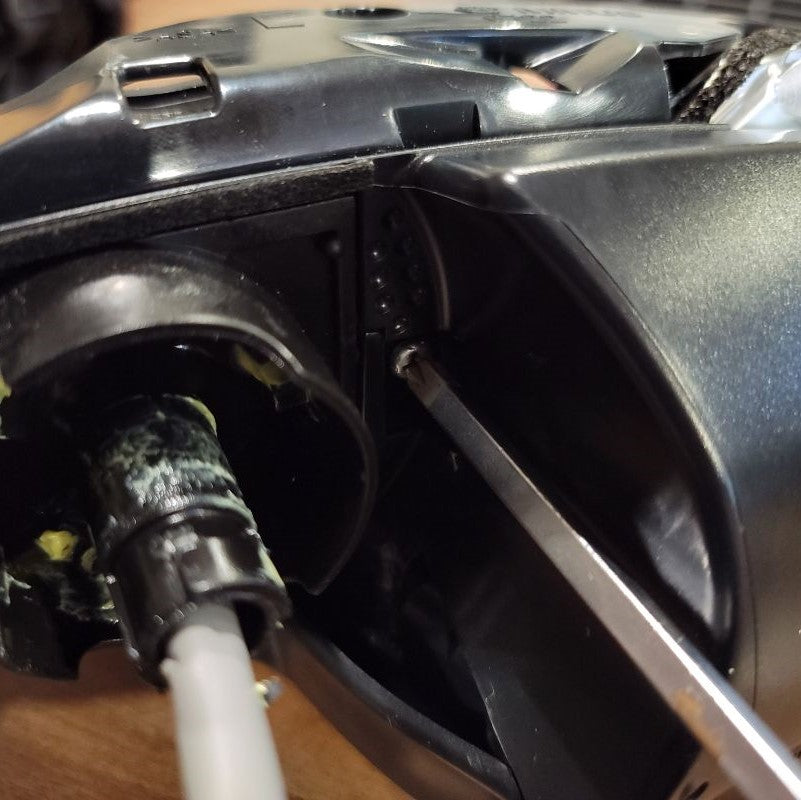 Looking at the assembly from the mirror side again, locate these two clips behind the signal light.