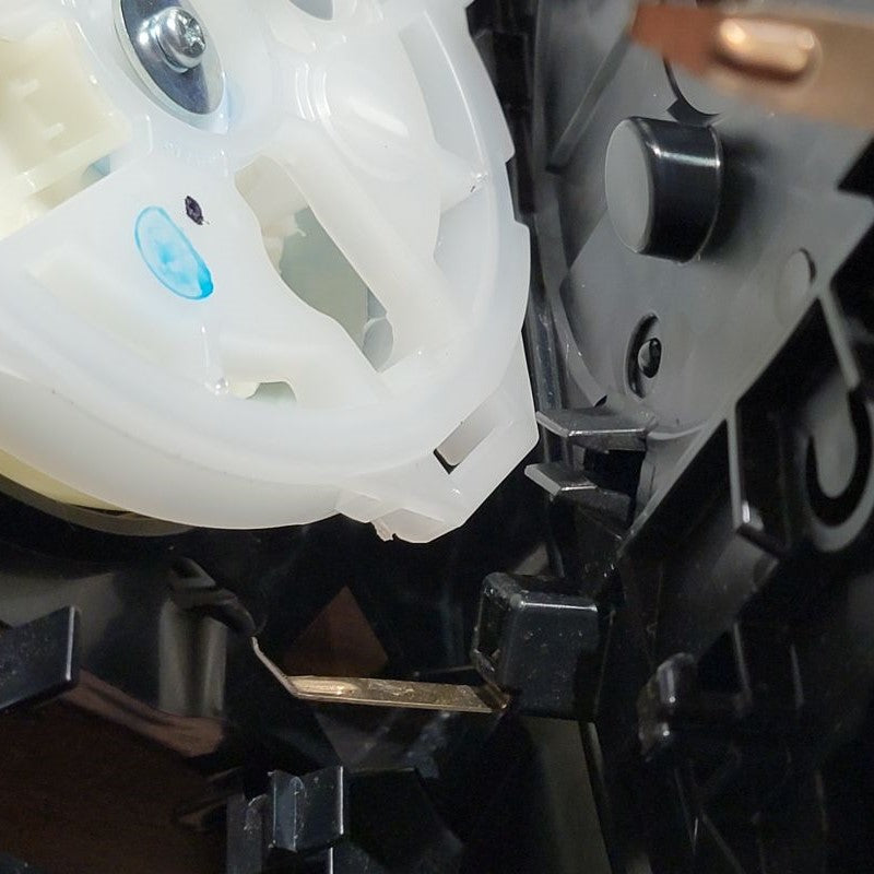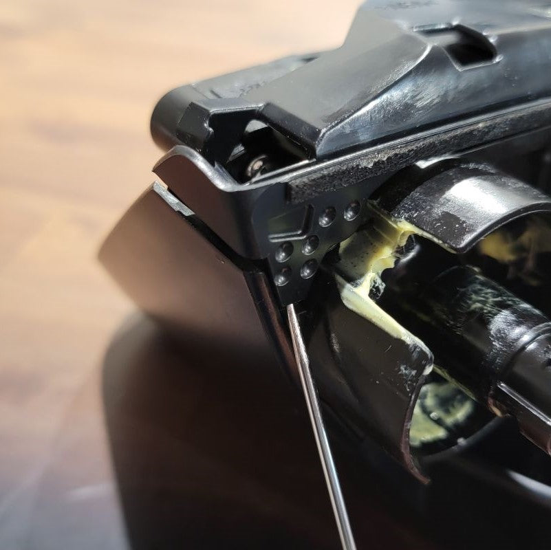 Bring out your needle nose pliers for this step. The metal clip here is keeping the mirror spring-loaded in open and closed detents.