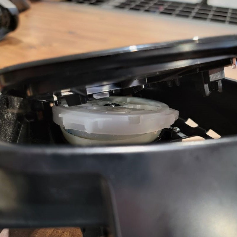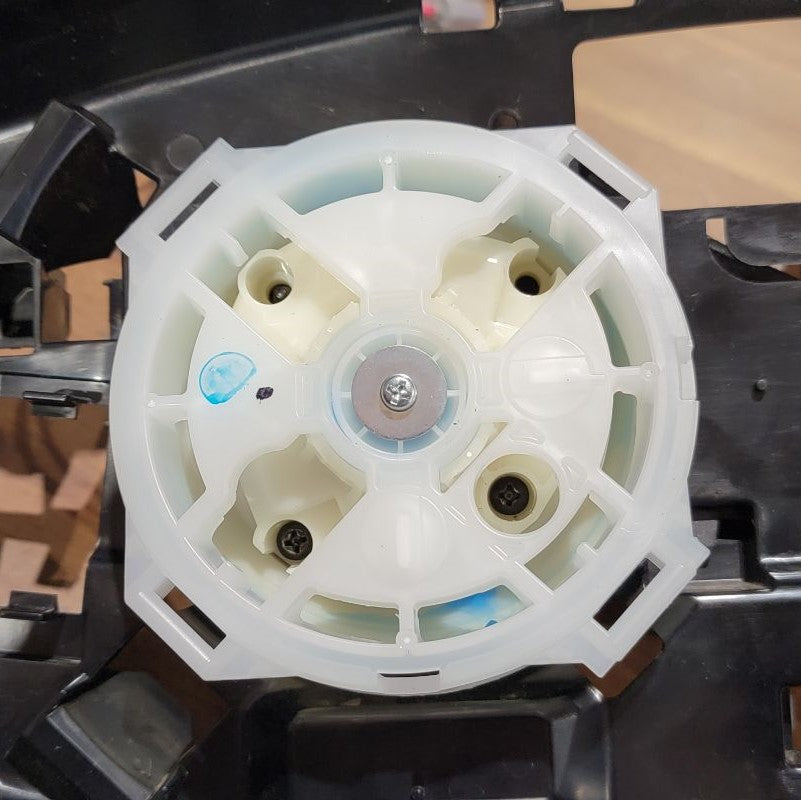 Remove these five screws holding the arm bracket in place, and remove the bracket. The kit that we’re installing comes with replacement arm connection brackets with integrated motor and gearbox that we’ll swap in.