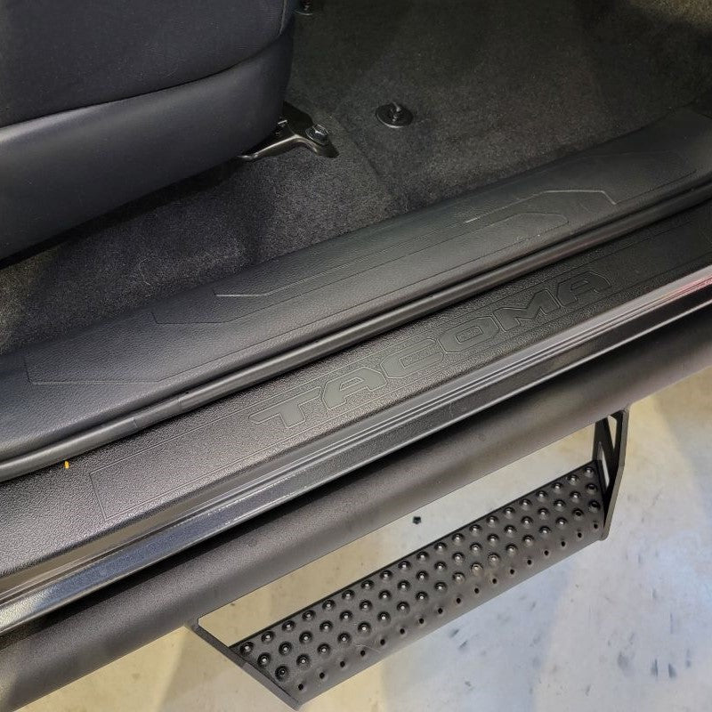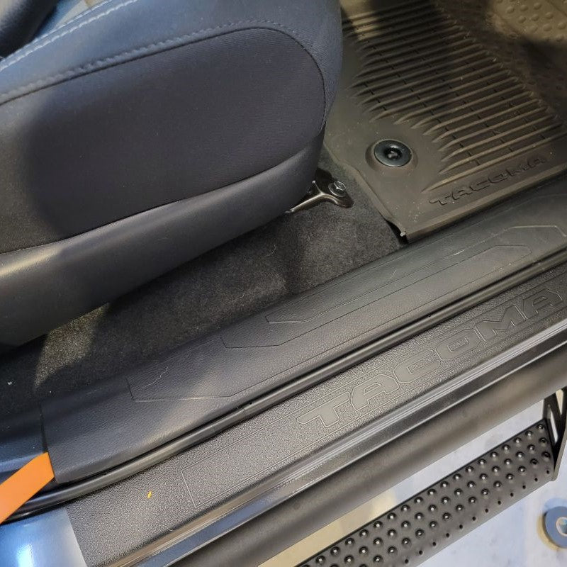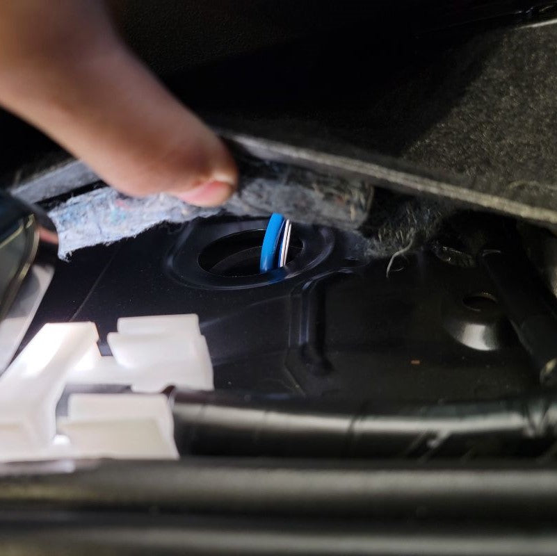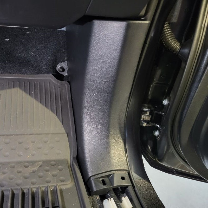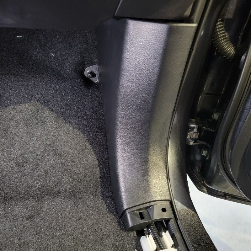 Next, open your passenger door and take up the plastic molding for your door sill on your passenger side. They priy up with a bit of force especially if it is the first time. Reach underneath the passenger seat floor carpet and you will see the top side of that rubber boot through which you just routed that wiring harness through. Go ahead and feed the rest of the harness throgh so that it is nice and clean.