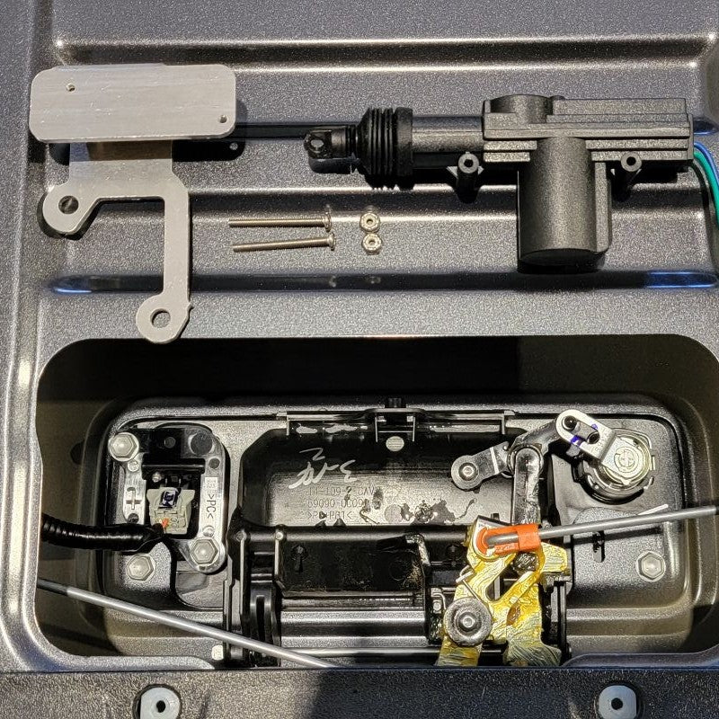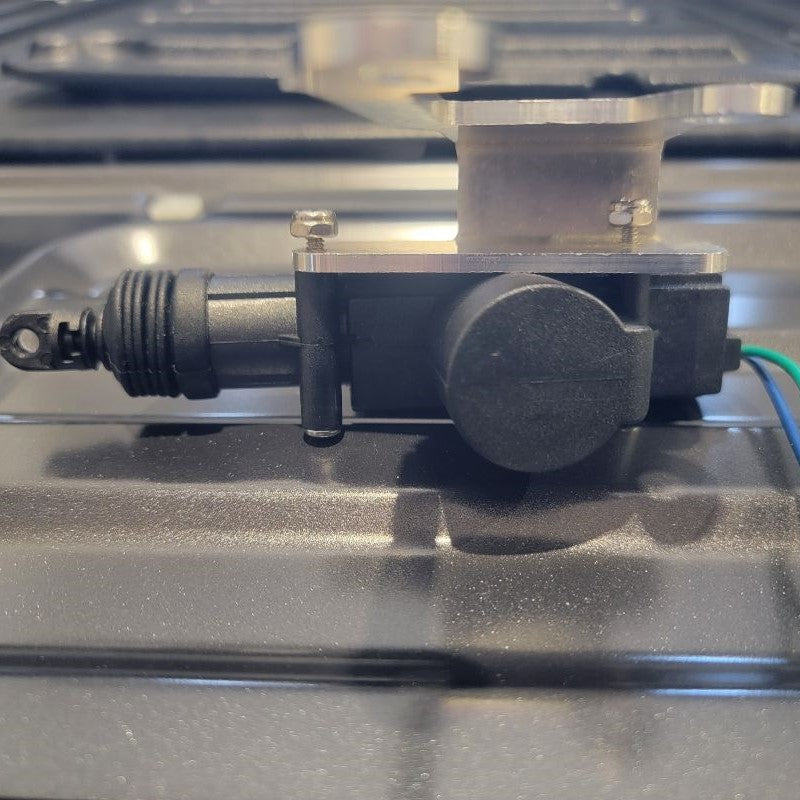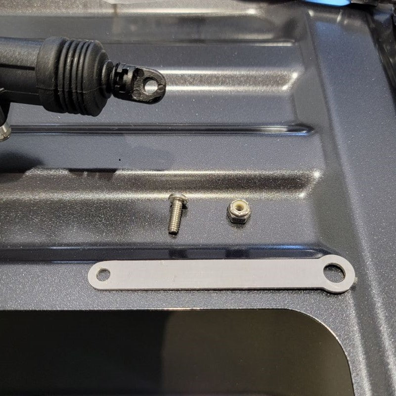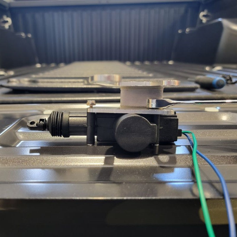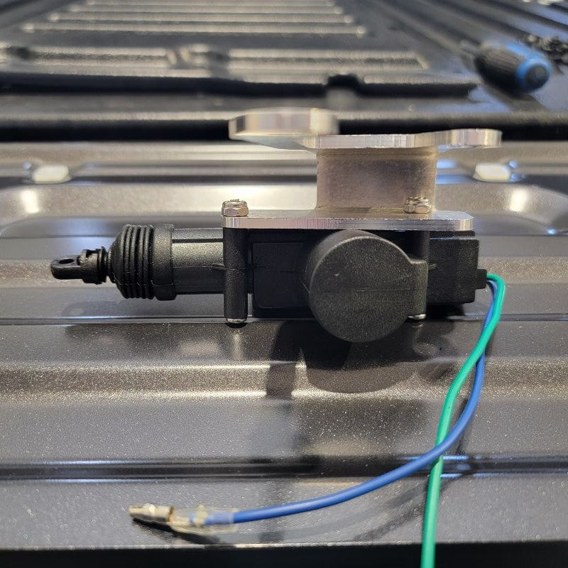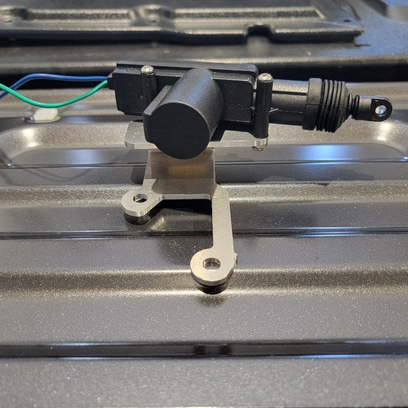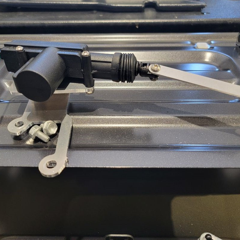 Using a screw driver and a wrench (8 mm), grab the Bolt-N-Lock Bracket that has been supplied for you as your new mounting point for your locking actuator. Use the supplied hardware and secure the actuator to your bracket following the images below as your guide. Finish preparing your actuator by installing the locking rod on the black tip using the smaller screw and lock nut to secure it tightly. Continue using the screw driver and grab a wrench or socket (9 mm) to tighten securely.