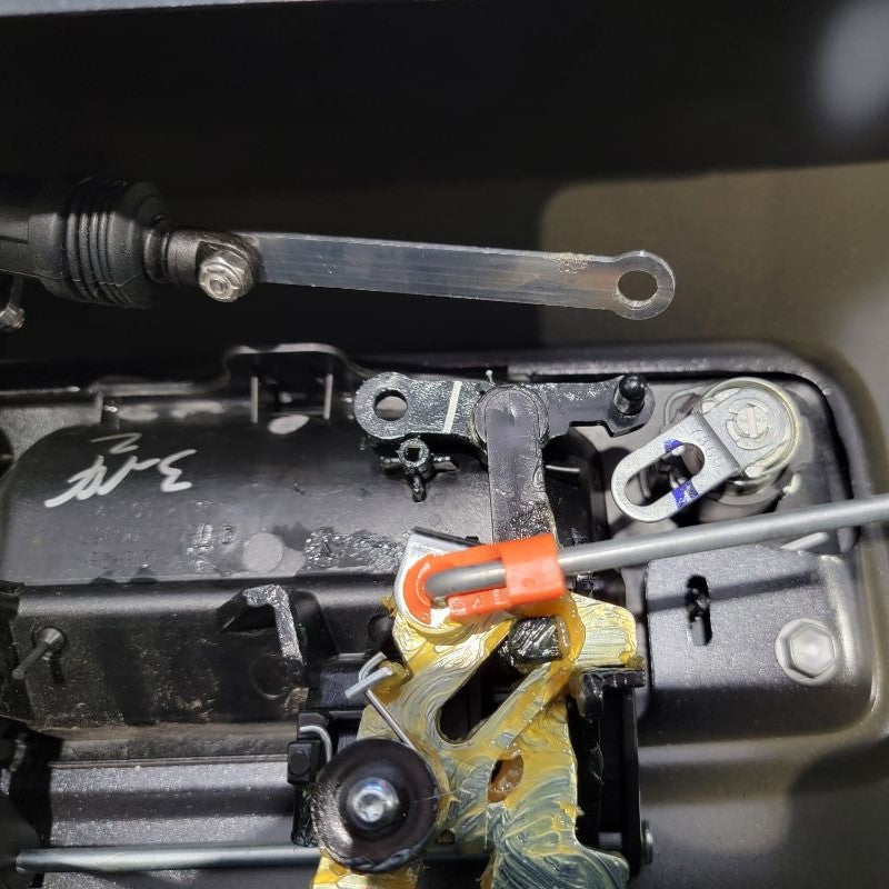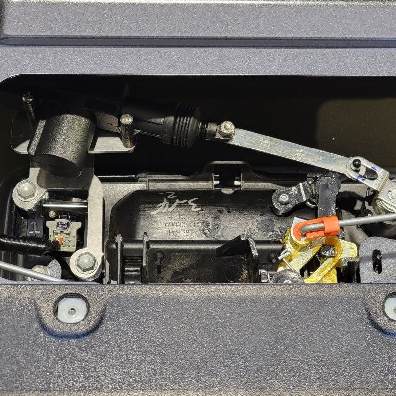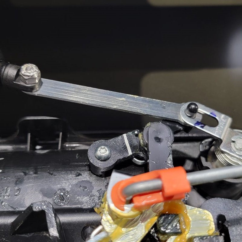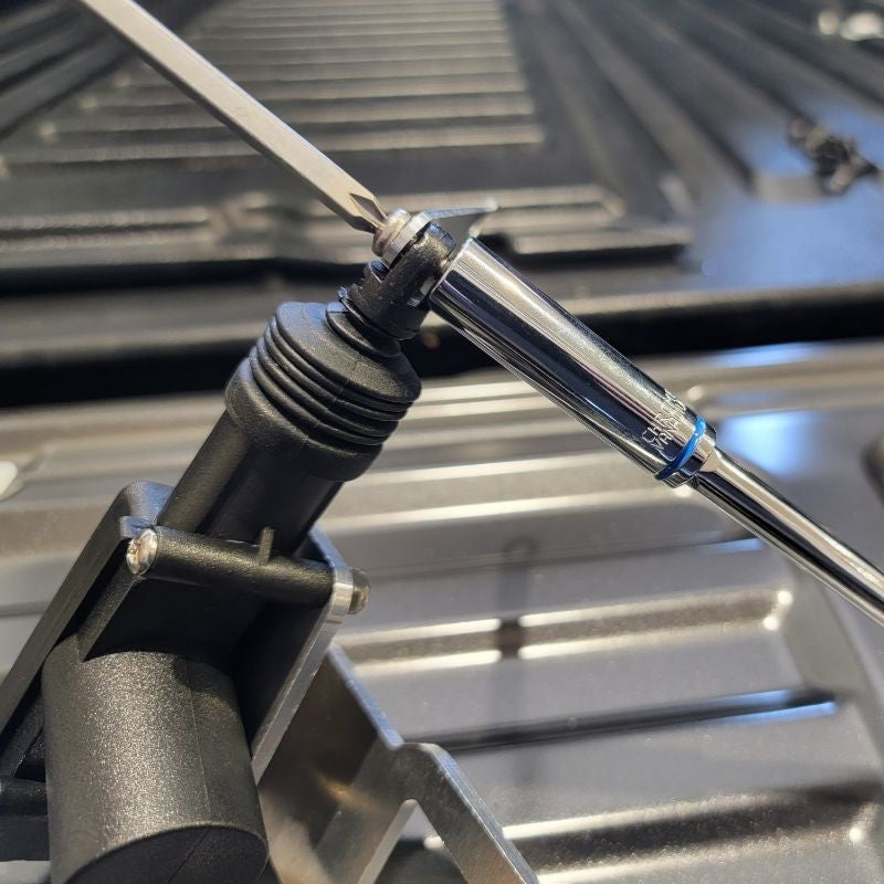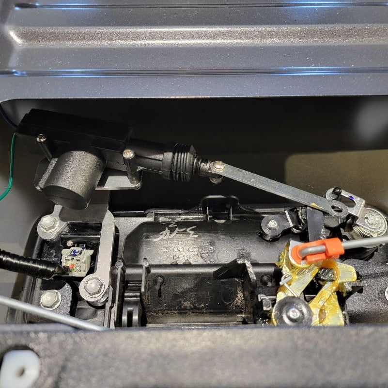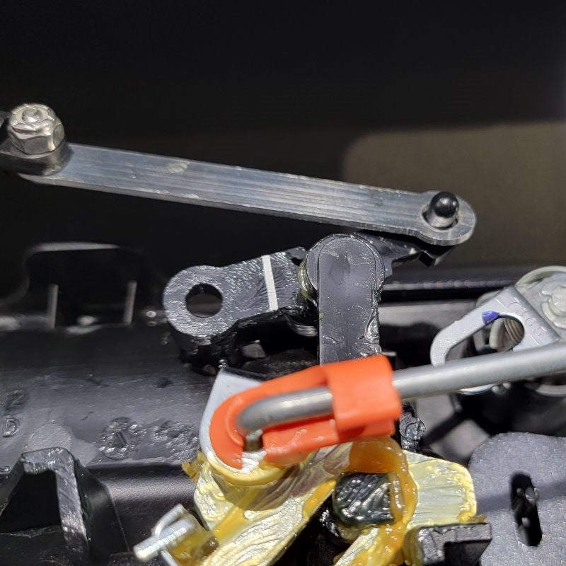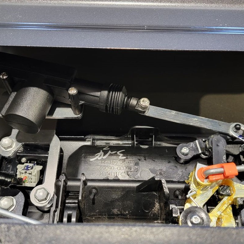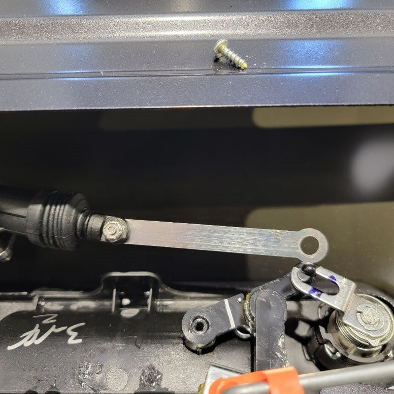 Using a screw driver and a wrench (8 mm), grab the Bolt-N-Lock Bracket that has been supplied for you as your new mounting point for your locking actuator. Use the supplied hardware and secure the actuator to your bracket following the images below as your guide. Finish preparing your actuator by installing the locking rod on the black tip using the smaller screw and lock nut to secure it tightly. Continue using the screw driver and grab a wrench or socket (9 mm) to tighten securely.
