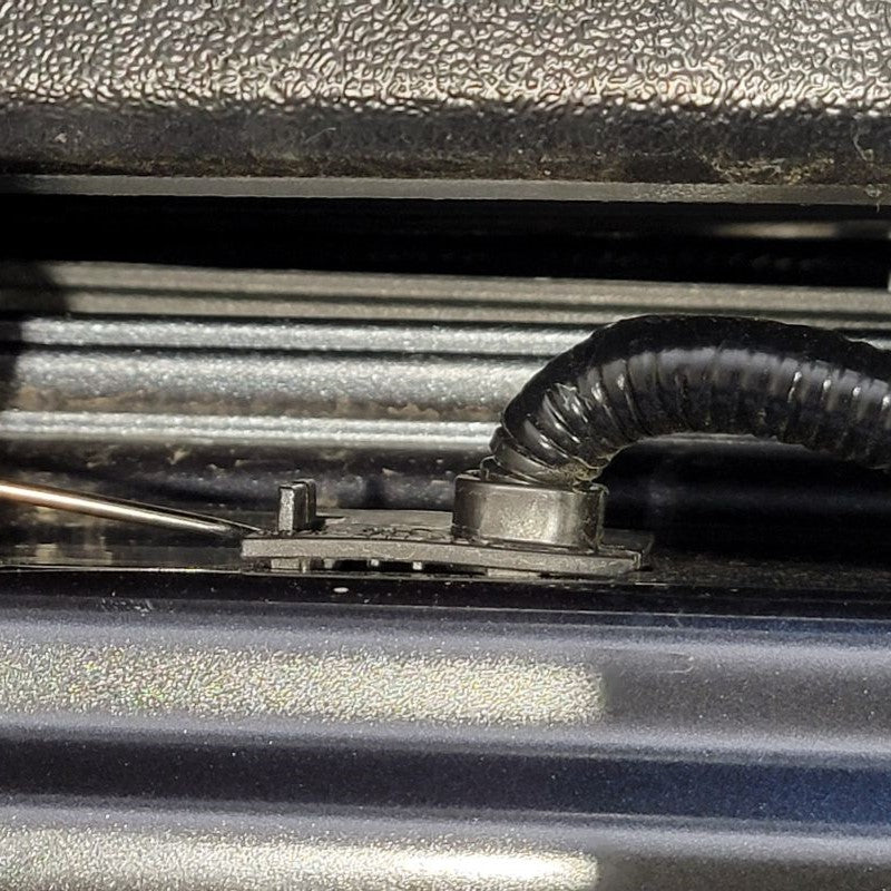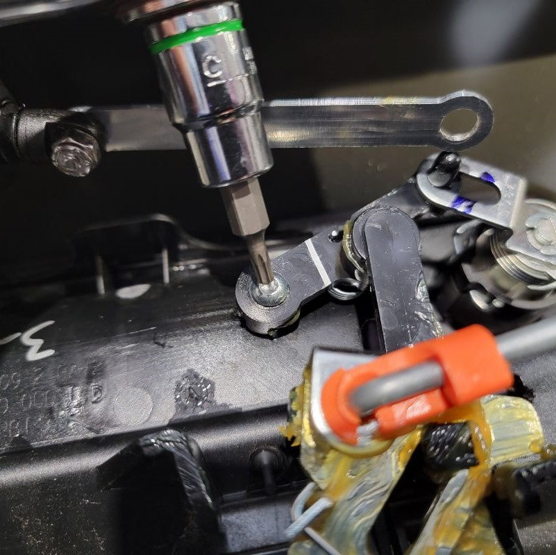 Now, it's time to remove the tailgate locking mechanism by using a #15 Star Screw Driver and removing the screw securing it to the handle of the tailgate. Once it is removed, gently lift up on the black plastic just enough to lift it off the black tab it sits on. The new locking rod will fit directly over the black tab. Please make note of all the pictures provided for you to follow as a guide. After you have completed this step, just make sure you have secured all of the screws as they once were in the beginning.