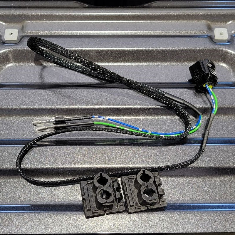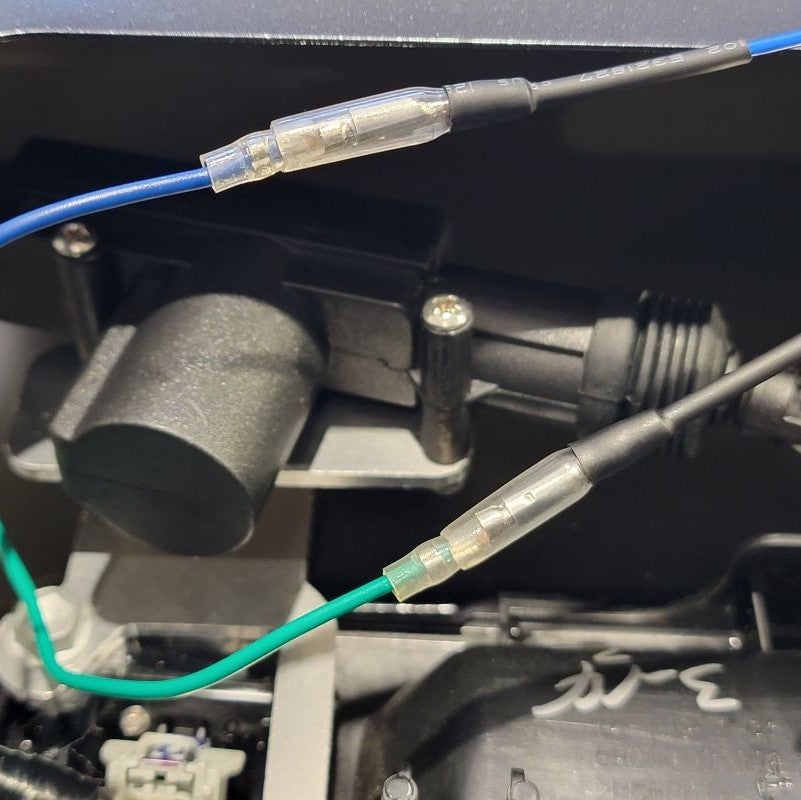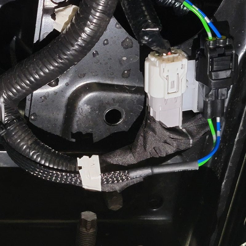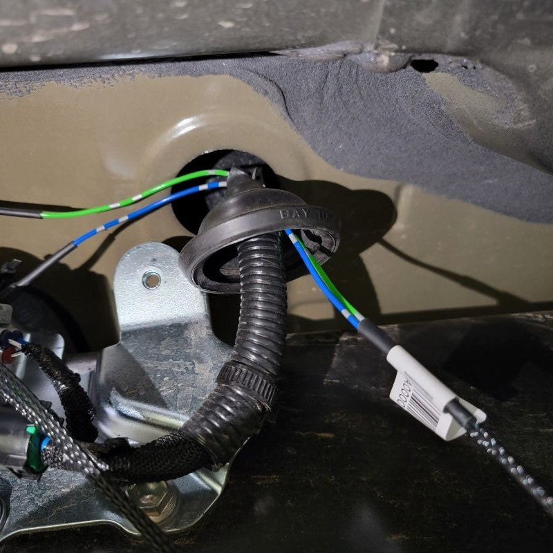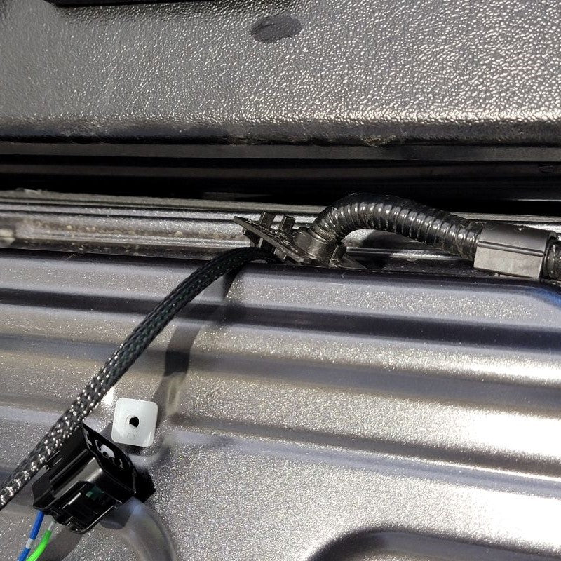 Connect the green and blue wires on the tailgate locking actuator to the green and blue wires on the wiring harness. Push them nice and tight until both click into place and make sure both have their weather protection nicely secured around them at the end. It should be a nice snug fit. Start by removing one of the white plastic fittings located inside the tailgate and go ahead and follow along the factory wiring harness that is located inside the tailgate to exit the tailgate at the end-caps.