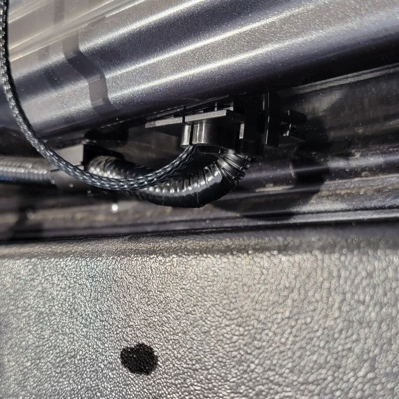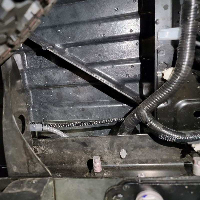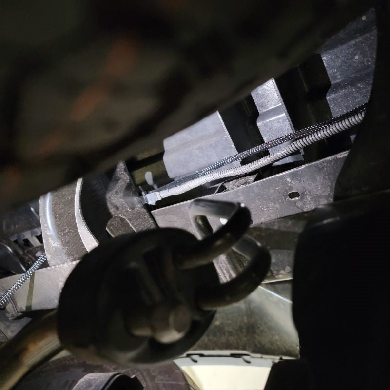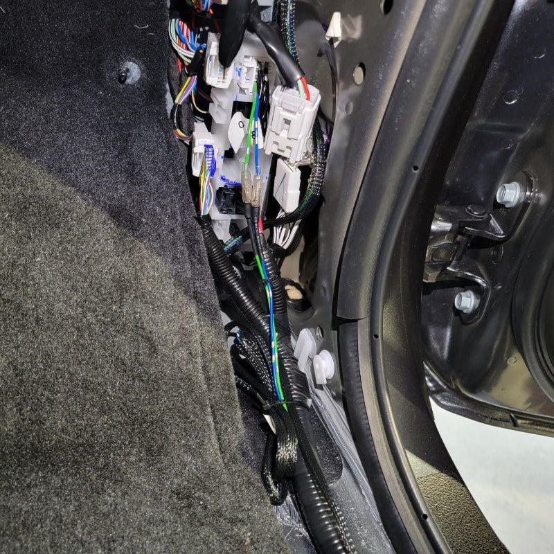 From here, it is pretty simple, just follow the factory wire harness all the way to the front passenger seat by using zip-ties or electrical tape. In the middle section you will notice a heat shield Toyota installed on their factory wiring harness. Go ahead and use zip-ties or electrical tape here to secure the included Tailgate Lock harness to the side away from the exhaust. You don't need to add it's additional heat sheild protection as the factory one will do just that.