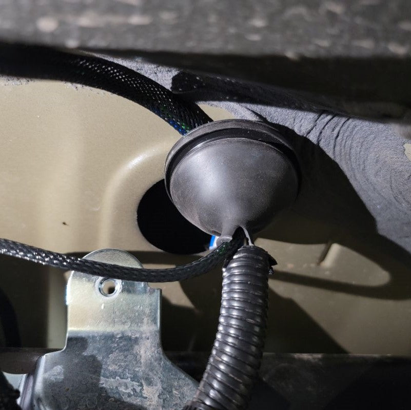 There is already factory wiring and a black grommet that goes inside the cab of the truck in this location. You DO NOT need to puncture any holes in this grommet. Just undo the electrical tape and the wiring harness you can run straight through.