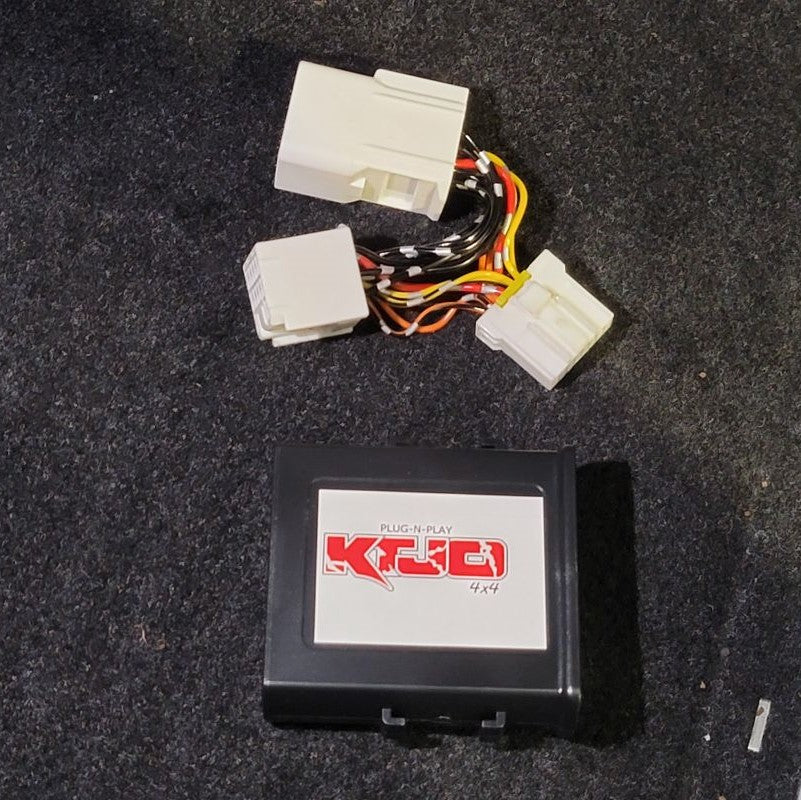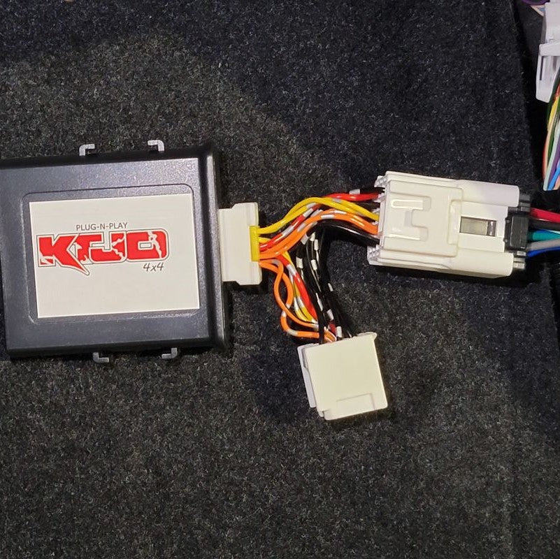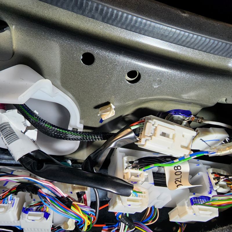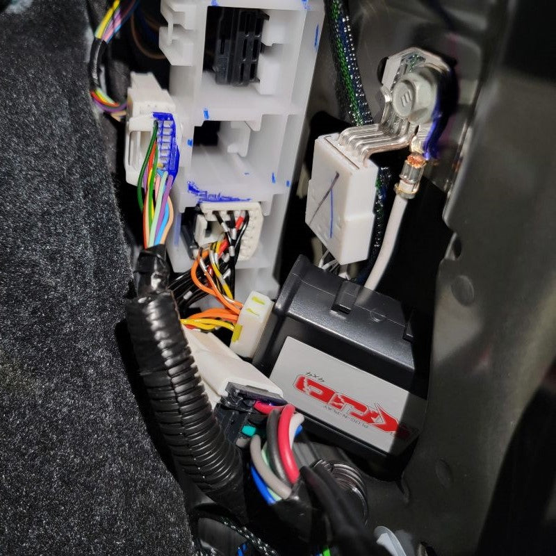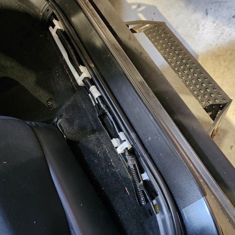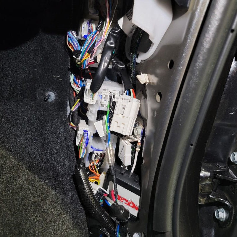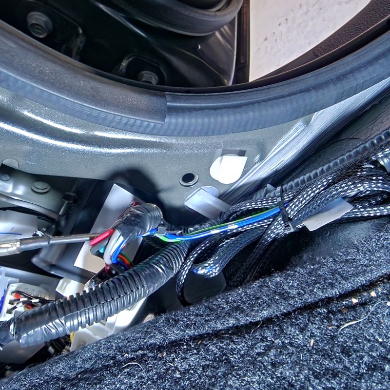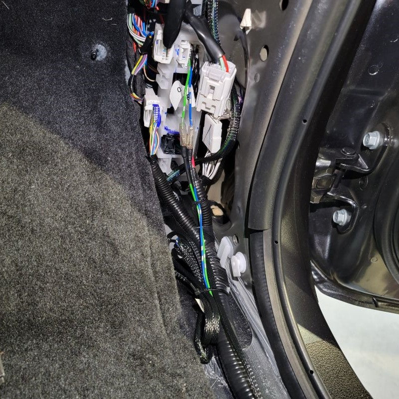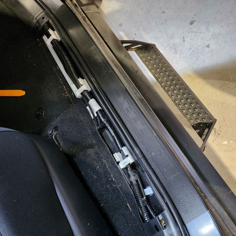 Using your included one touch harness, connect it to your factory harness inside your door panel. In reverse order of Step 2, you are going to want to install the kick panel. Make sure to align those two white tabs so they will lock in your panel. Finish by hand tightening the black fastener in the back corner.