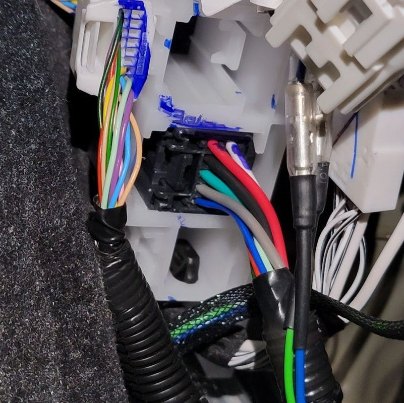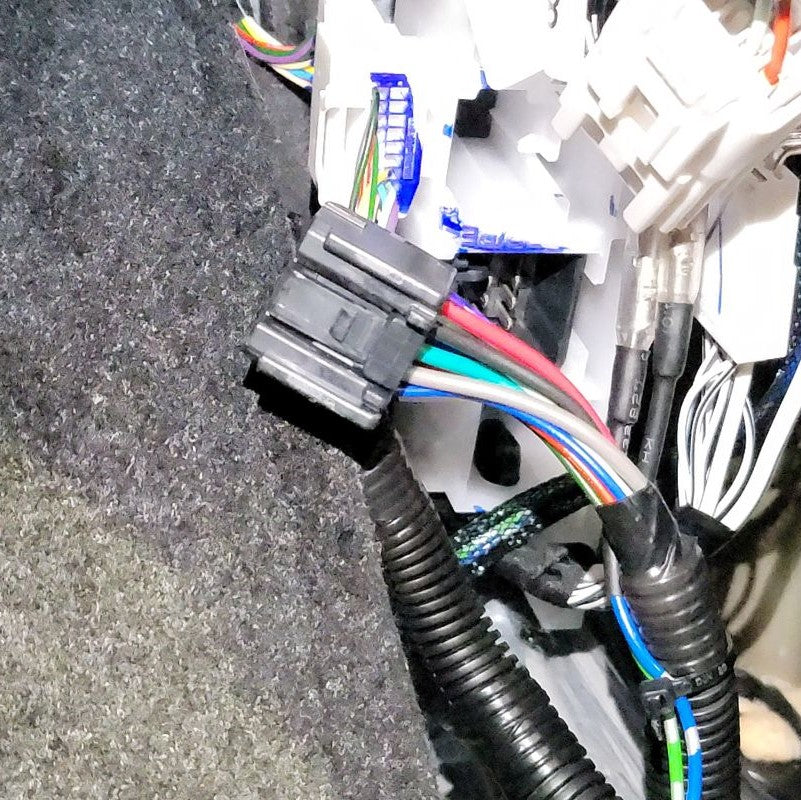 Now you will need to locate your rear windshield factory connector. It is black and at the bottom. Simply use the tab on the connector to push down and release from its holding location inside the kick panel area.