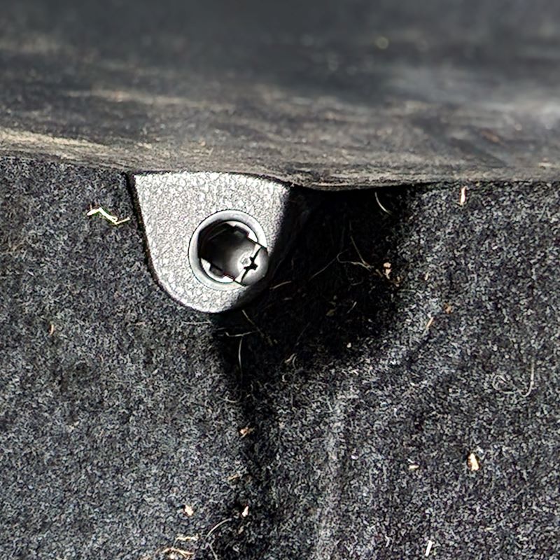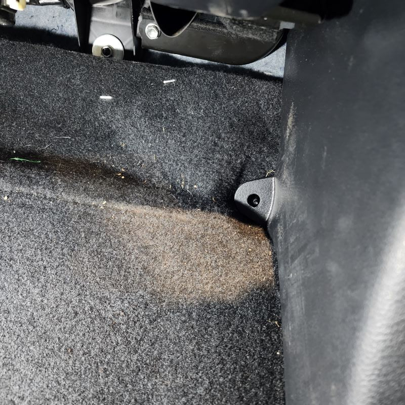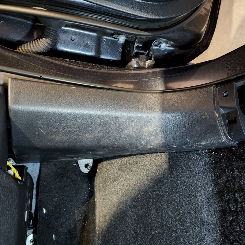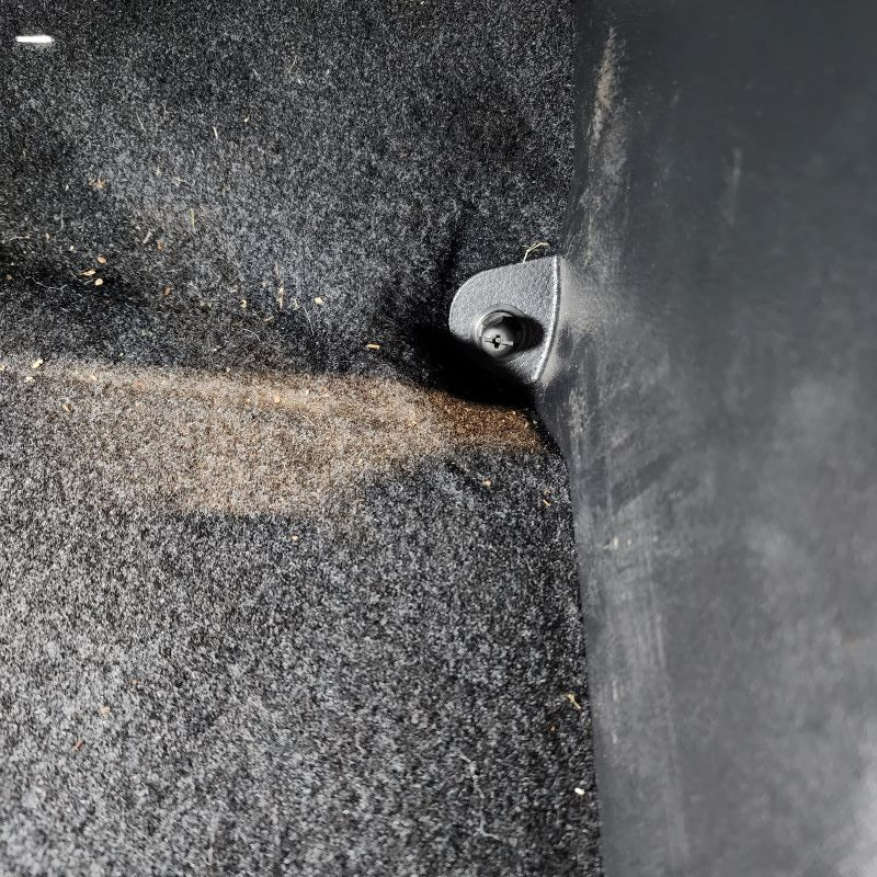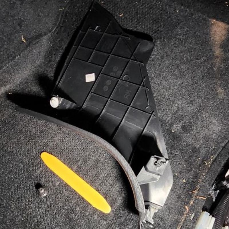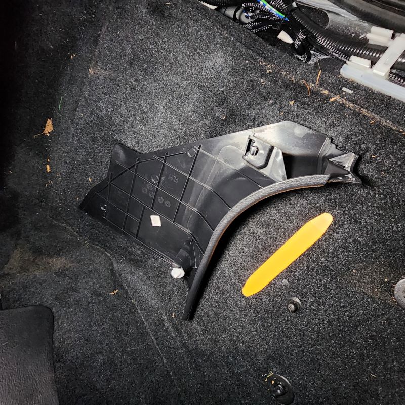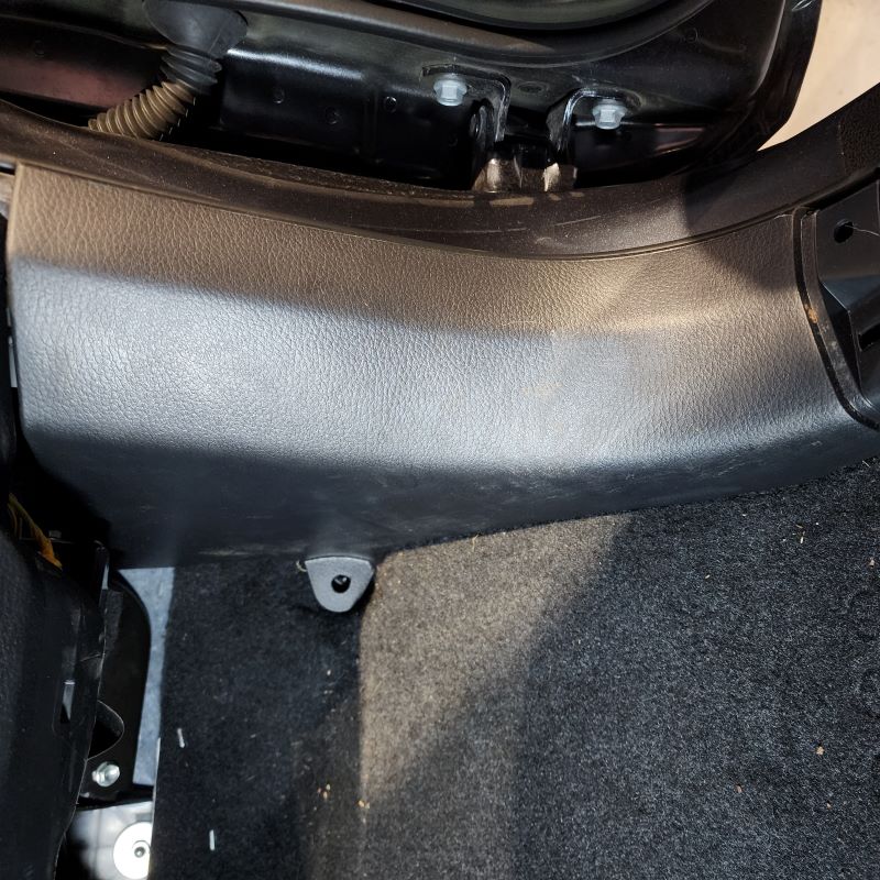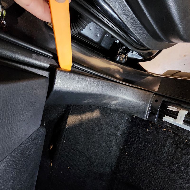 Using your hands, reach in the back corner where you will find a black fastener that is securing the kick plate to the carpet area. Once you have the threaded fastener removed, you can use a Trim Removal Tool or just your fingertips to get behind the top corner panel like shown below. This kick panel is held in by two white push-in tab fasteners on the inside. Set aside for later.