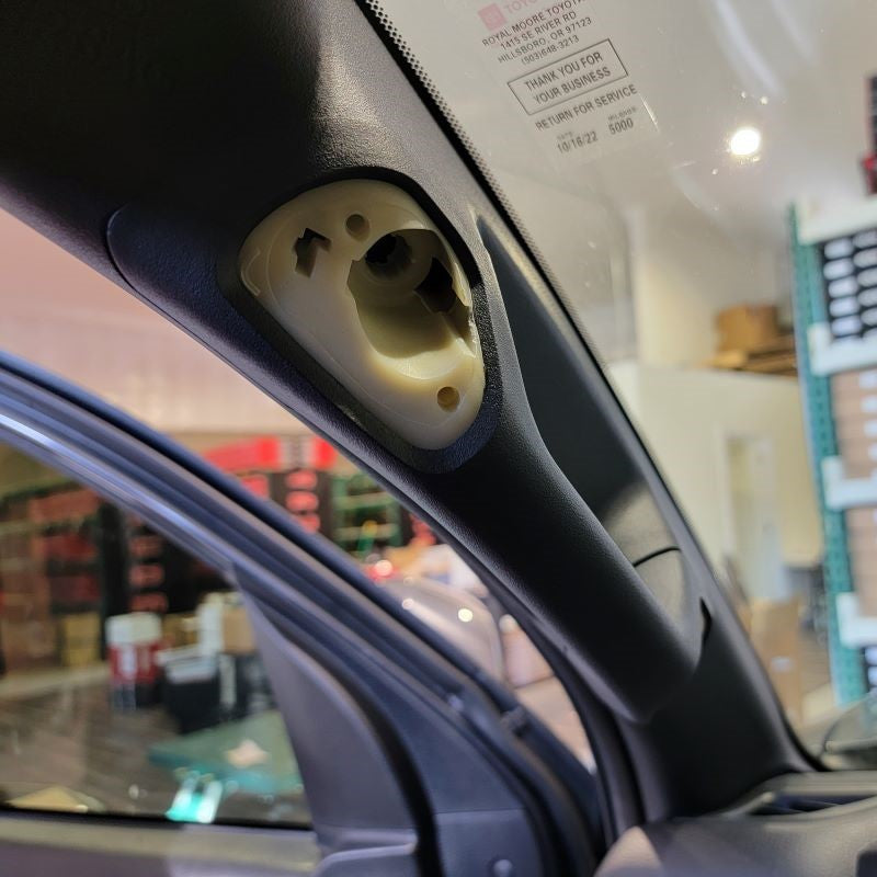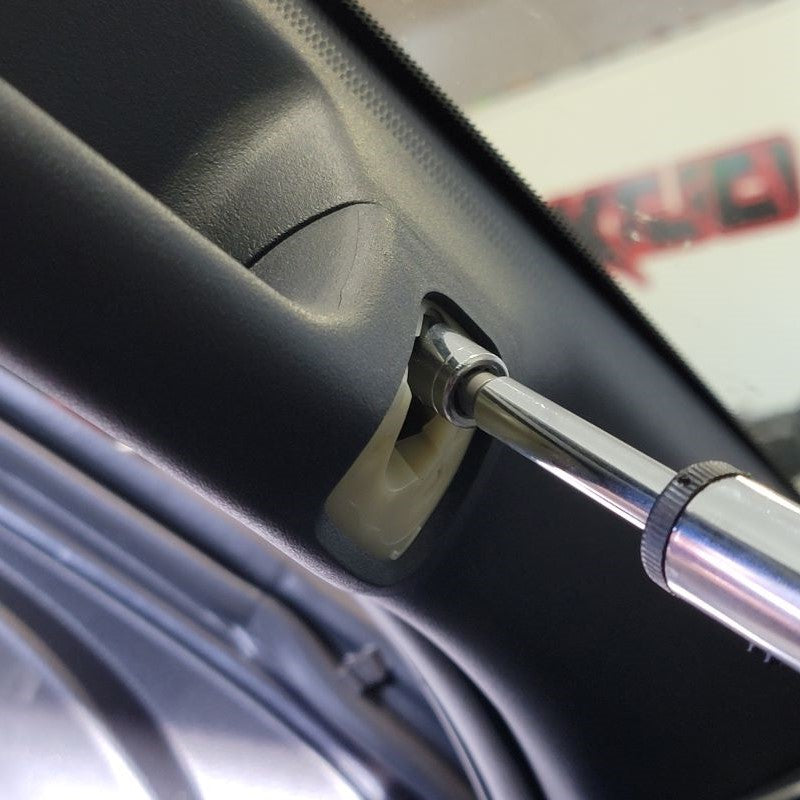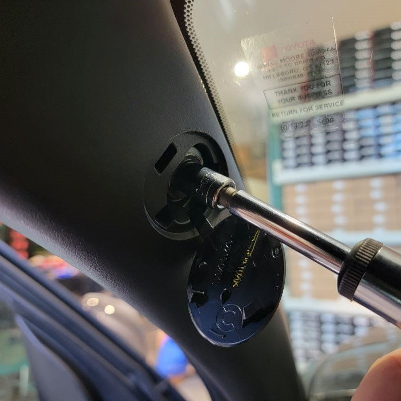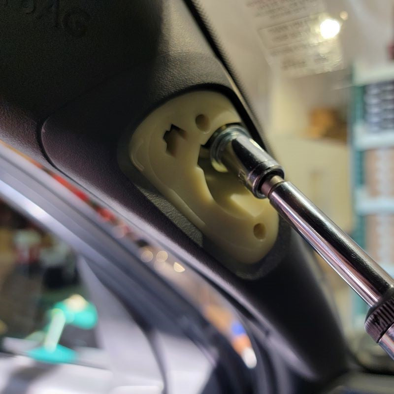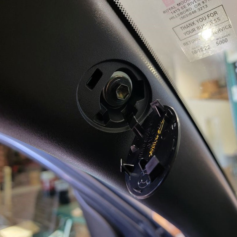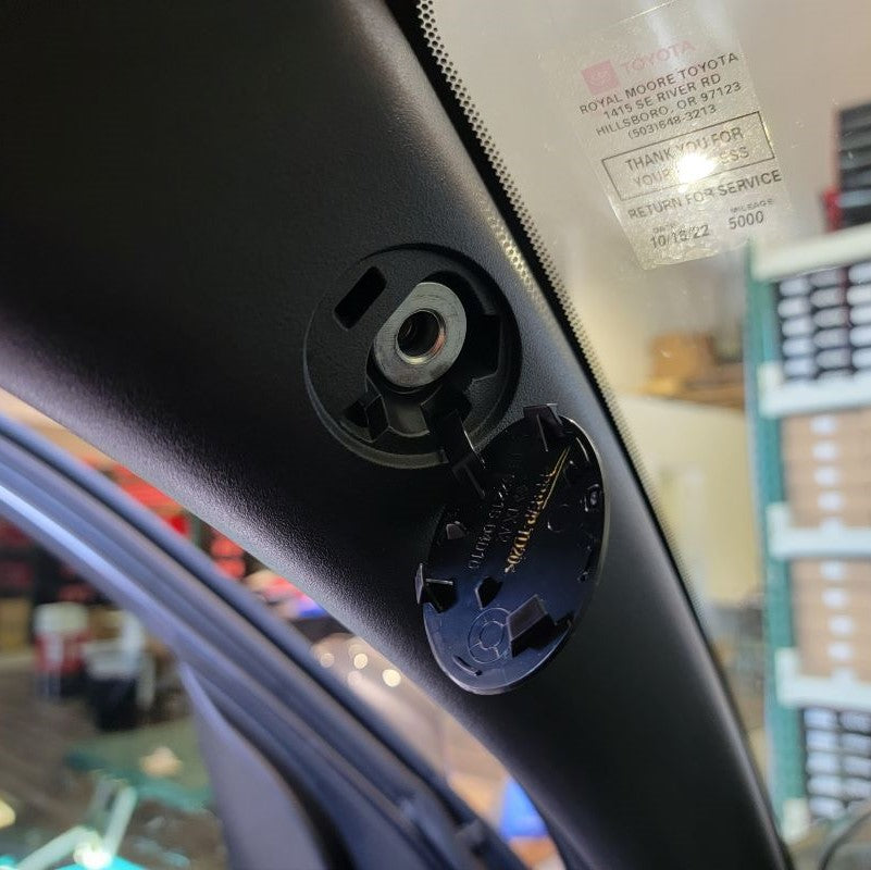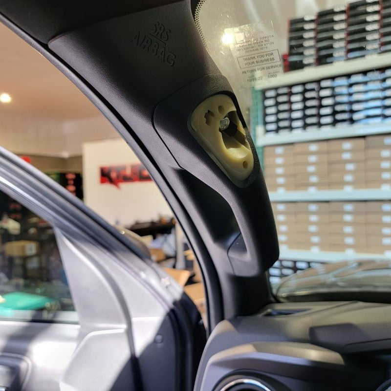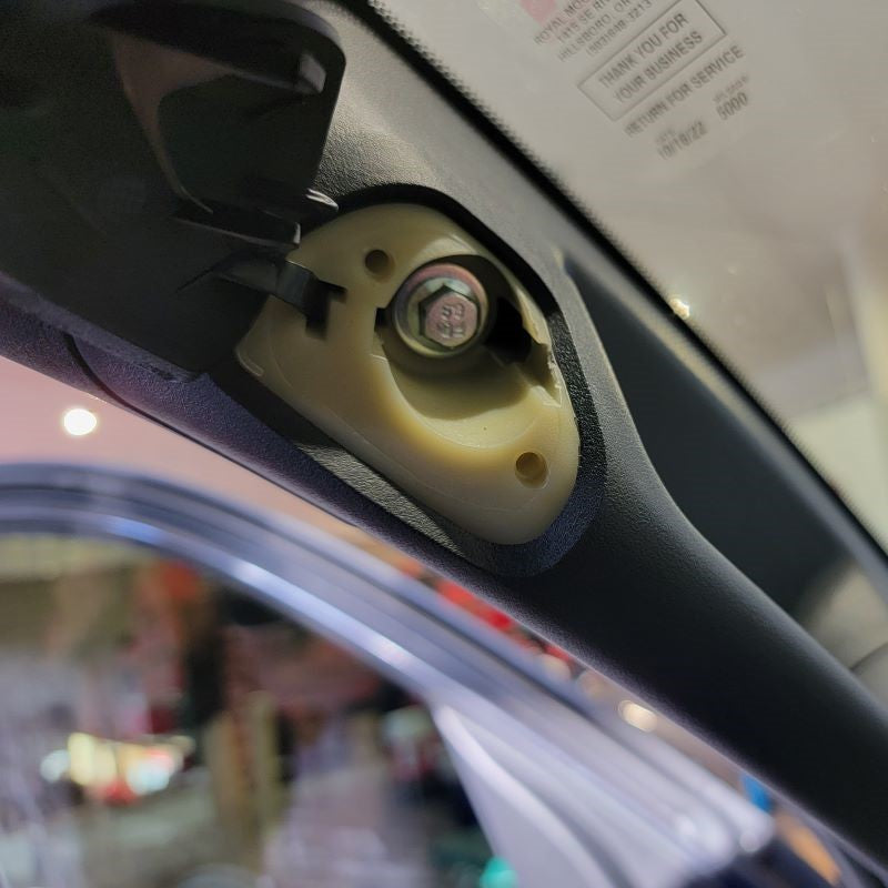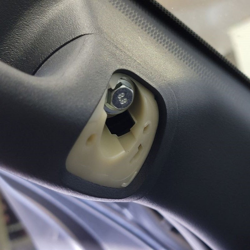 Toyota left the mounting point on the truck for stability in the new front pillar. Unfortunately, there is not a nut welded onto the back like on the top mount. The bottom mount just has a hole that accepts the plastic retainer on the factory Garnish, Front Pillar (LH) without the Grab Handle. Therfore, the following steps are necessary to create a solid mounting point for the New Driver Side Grip Handle. Slip the Spring Metal U-Type Clip with Speed Nut on the back over the Metal Plate on the bottom. Now, the new larger screw for the handle has something to thread into on the bottom. For the top you will use the new 10mm bolt we have included in the hardware bag for you.