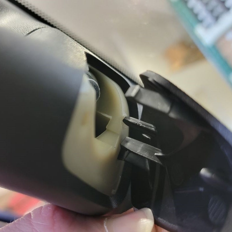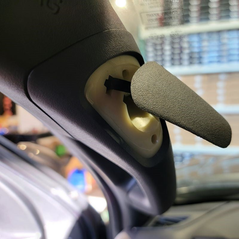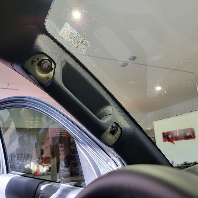 After proper installation takes place with the New Garnish, it is time to install the New Driver Side Grip Handle using the new bolt and screw (10mm shorter bolt on top/longer screw on bottom) included in your hardware package with the 2 washers. The bottom will screw into the speed nut you installed. Whereas, the top will screw into the factory threads. If you have any challenge finding the threads with the handle on the pillar, remove it off the pillar enough to just see where the screws need to be placed. Start threading the bottom first, then the top. That should solve your problem. At the end, make sure the weather stripping on the side of the Garnish, Front Pillar is on the outside.