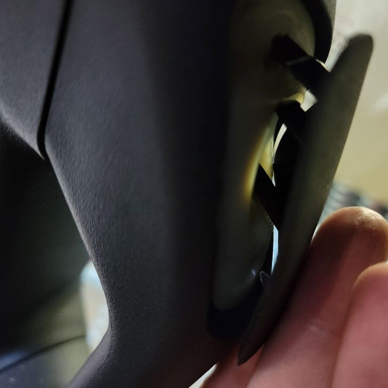 Insert the Hole Cover (included with package) on the top to hide the hardware you just installed. Repeat for the bottom hole location in the Grip Handle. Make sure that all tabs on the back side go into their respectful places for proper installation.
